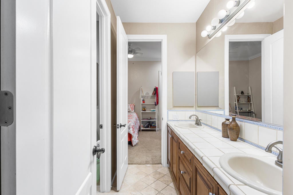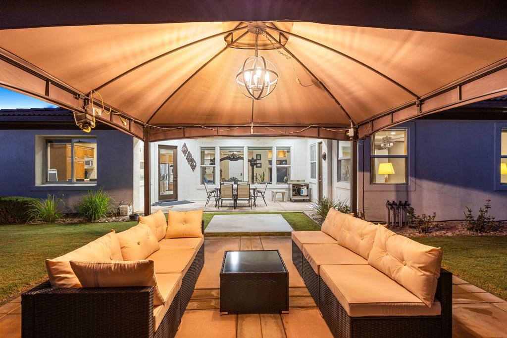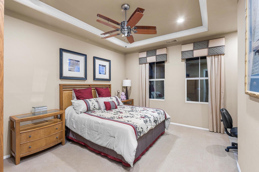Desert Dream Home! This former model home sits on a quiet cul-de-sac in the gated community of Brenna at Capri, near Ronald Reagan Elementary and Freedom Park. The open floor plan features tile flooring throughout with carpet only in bedrooms, a cozy fireplace in the living room, and a spacious chef's kitchen with granite countertops, a large island, double ovens, pot filler and a five-burner cooktop. The home offers 4 bedrooms and 3 bathrooms, including a convenient Jack and Jill and a primary suite with a built-in closet, soaking tub, dual vanities, and patio access. The backyard is a true garden retreat with multiple fruit trees, over 50 rose bushes, and plenty of space to relax or entertain. Additional highlights include coffered ceilings, plantation shutters, a paver driveway, and two front patio seating areas. This home shows pride of ownership and offers peaceful, low-maintenance desert living at its best. Close to the freeway, shopping, dining and so much more. Make this your home today!