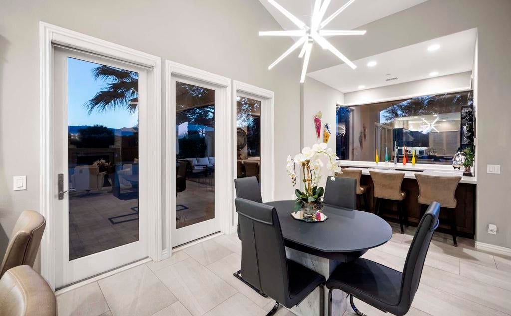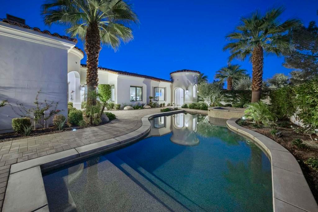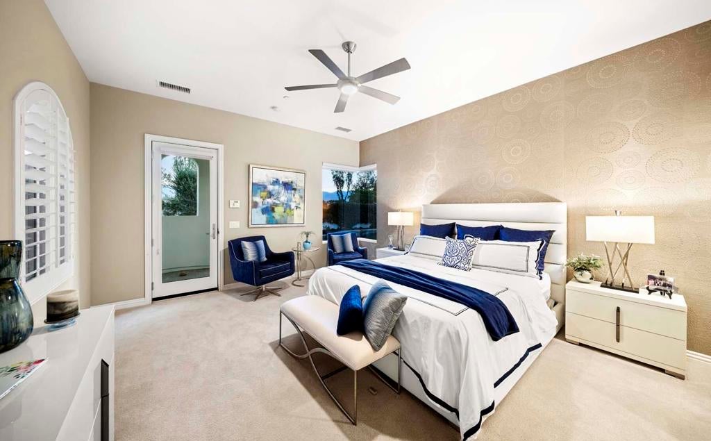 Welcome to this stunning newer construction, contemporary Plan 502 located on an oversized corner lot in the exclusive Toscana Country Club. This exceptional home features a side-loaded custom pool, maximizing both sun exposure and privacy, and is surrounded by meticulously designed desert landscaping, providing the perfect desert oasis.Step inside to discover a carefully curated interior with designer furnishings that exude sophistication. The spacious great room welcomes you with a refaced stackstone fireplace and soaring pocket doors that seamlessly blend indoor-outdoor living. Enjoy the convenience of remote shades and elegant chandeliers in the entry and dining areas, enhancing the home's ambiance.This gourmet kitchen boasts quartz countertops accompanied by a stunning backsplash, and stainless steel Sub Zero Wolf appliances. Additional features include slider shelves for easy access, a wine refrigerator at the bar, and a water filtration system at the kitchen sink.Retreat to the primary suite, complete with a resort-like en-suite bath featuring dual sinks, a walk-in shower, a freestanding soaking tub, and upgraded shelving in the master closet. All bedrooms are equipped with new ceiling fans for comfort, and the home boasts tinted windows for added privacy and energy efficiency.An adjacent guest suite with a private bath provides a welcoming space for visitors. Additional perks include an added bathroom door for the master bathroom, enhanced air conditioning in the garage, outdoor storage shed, and professionally installed artificial turf in the front yard.With its remarkable features and central location--right on the beloved 8th hole of our north course--this home is the epitome of luxury living. Experience the peaceful elegance and modern convenience of Toscana Country Club living today!