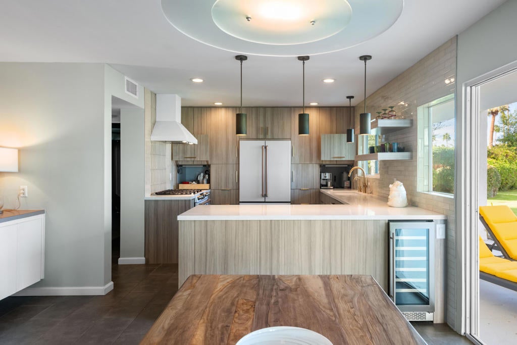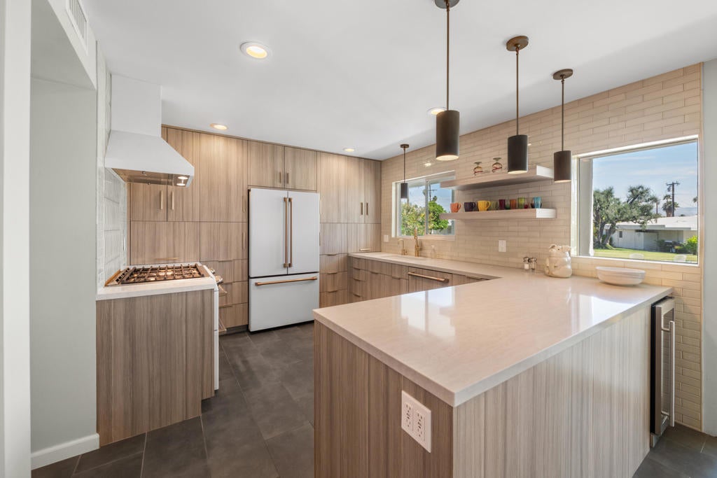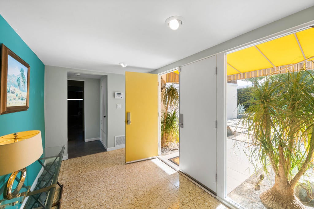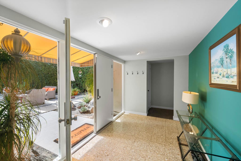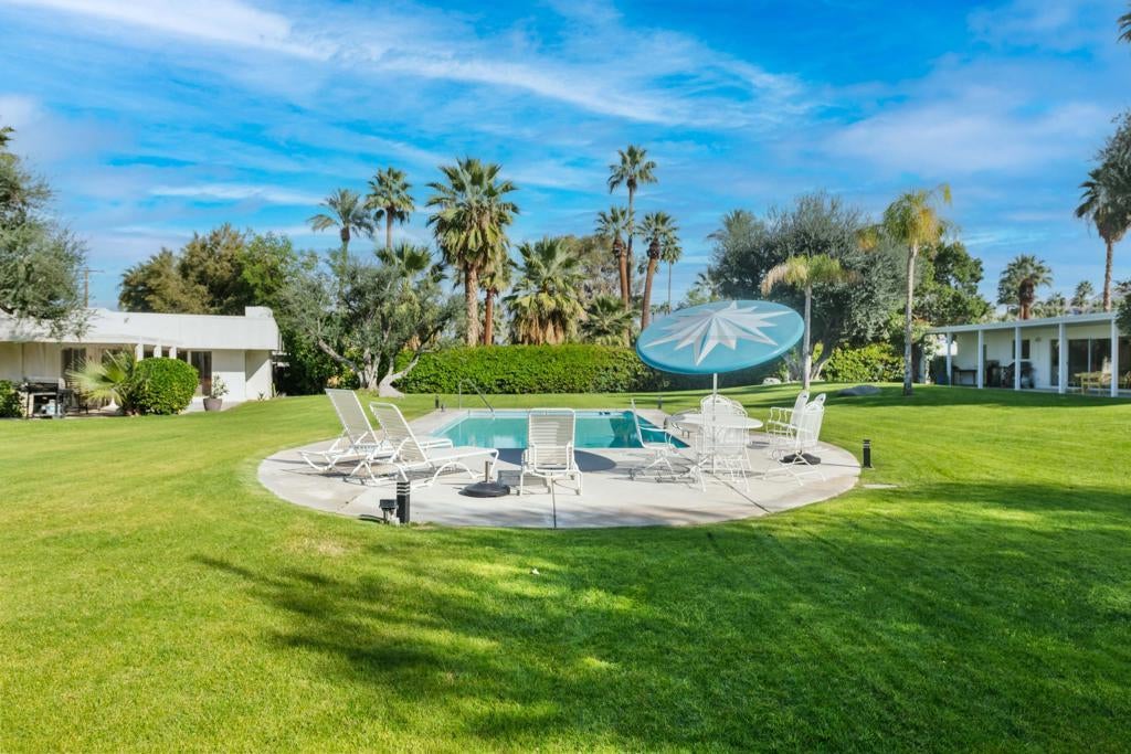Classic 1960's Mid Century Gem in a Park-Like Setting. A private courtyard opens to a double door foyer with original Terrazzo. Views of lush, beautifully maintained grounds and a sparkling pool are captured through floor-to-ceiling sliding glass patio doors. The remodeled kitchen is Modern and Sleek featuring Quartz Countertops, Newport Brass fixtures and GE Cafe Appliances. An open living area features a fireplace and dining area with built-in buffet cabinet and Vintage dry bar. The Primary BR opens to an enclosed patio. Sleek porcelain tile throughout. Updated bathrooms feature Quartz countertops and tiled showers. This is one of four residences within a private enclave. Offered Turnkey Furnished. Simplicity and relaxation is key.