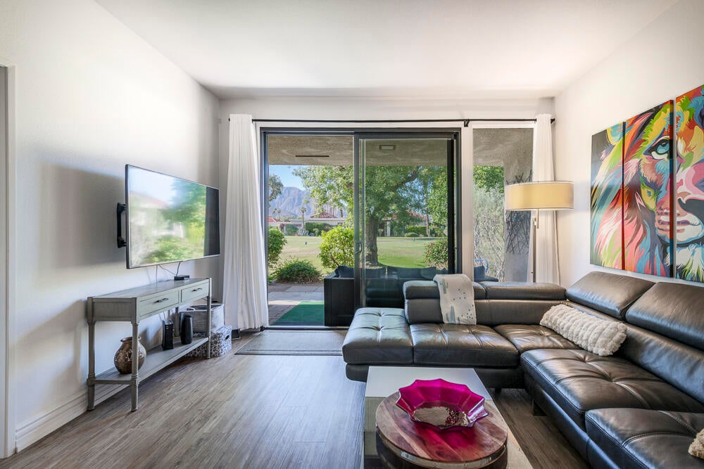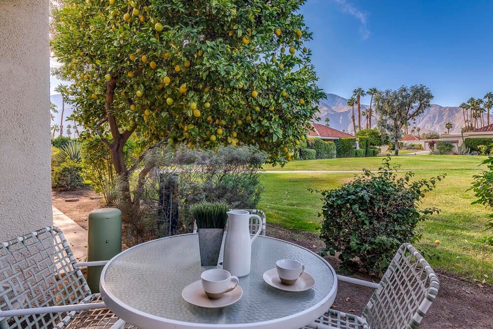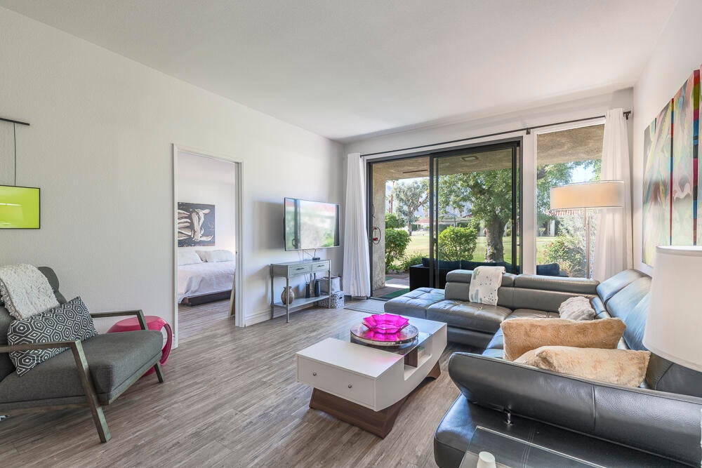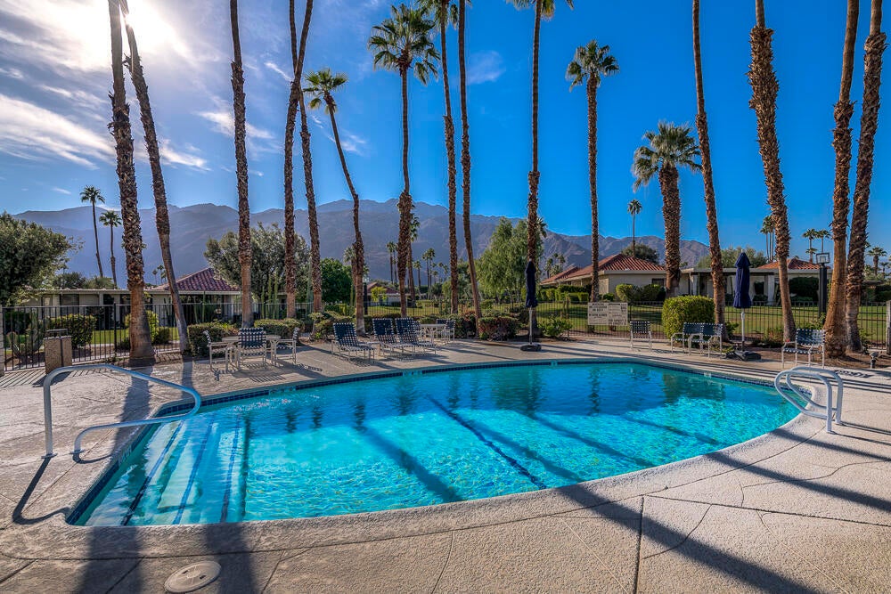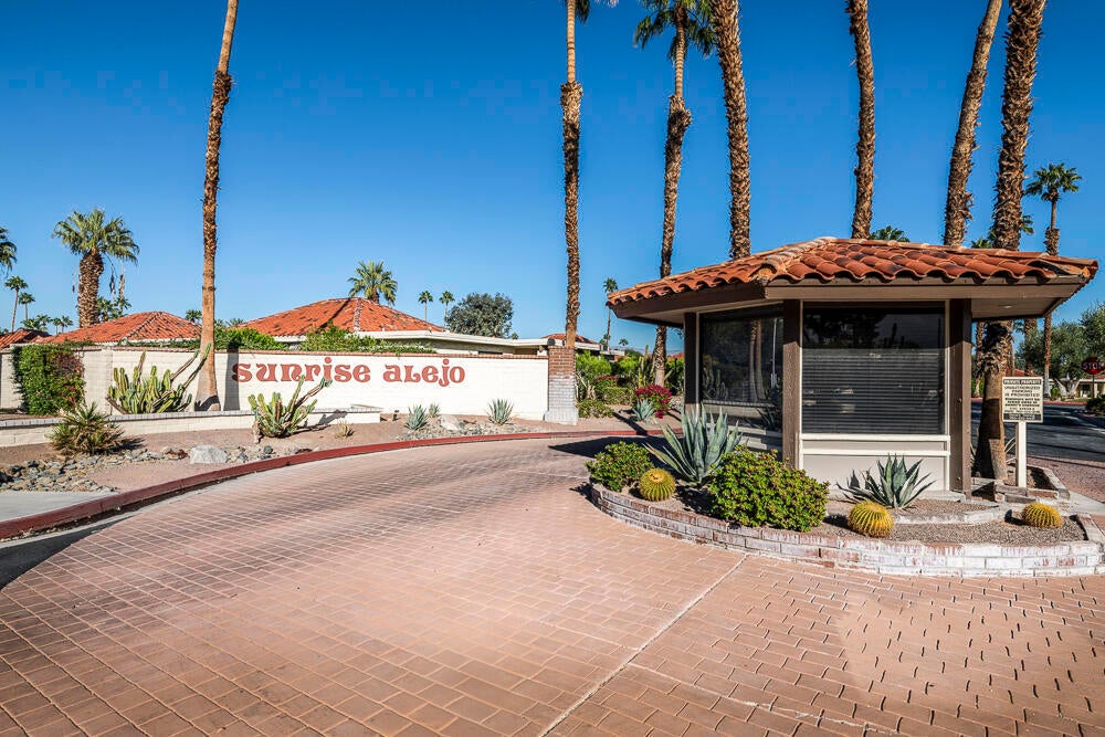 Welcome to this nicely updated condo in the very desirable and well located community of Sunrise Alejo. Unbeatable value on Fee Land (no lease) in low density community of single level garden villa homes. Situated on a quiet cul-de-sac, this 2 bedroom 2 bath condo features an open floorplan with luxury vinyl flooring throughout, a well appointed kitchen and beautifully updated bathrooms. There is a private entry courtyard to enjoy and a back patio on the greenbelt to relax and take in the magnificent mountain views. Spacious primary retreat with gorgeous ensuite with walk-in shower opens to the patio and view. The guest bedroom is well separated for privacy and hall bath is adjacent for convenience. Enjoy resort style living with the 3 pools/spas, tennis/pickleball courts and lush landscaping. And so close to all the restaurants, shopping and entertainment in downtown Palm Springs. Makes a perfect full time residence, vacation getaway or investment property. Don't miss out on this exceptional opportunity... schedule your showing today.