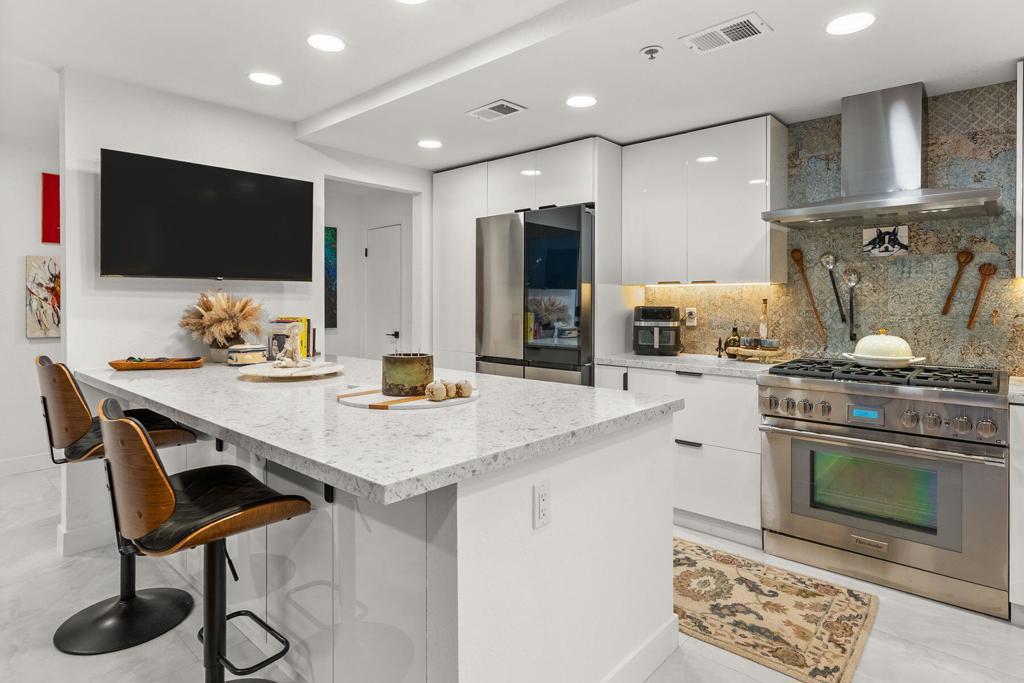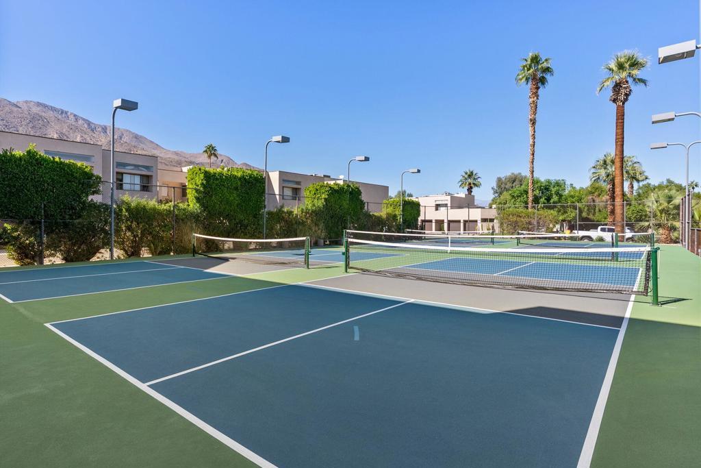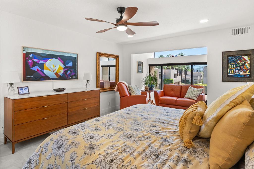 This light-filled, open, and airy multi-level townhome, located in the gated community of Village Racquet Club, has been completely renovated with style and sophistication. Situated in the heart of Palm Springs, it's just minutes away from all the shopping, dining, gaming, and nightlife of downtown. The townhome offers convenient access to major thoroughfares, making it easy to explore everything the Coachella Valley has to offer.The living area level features massive vaulted ceilings, a fireplace, and clearstory windows, creating an impressive volume and natural sunlight. A new wet bar adds to the living space's appeal. The attached balcony provides seamless indoor-outdoor living, with a tropical-like canopy and mountain views to the northwest. Throughout the year, breathtaking sunsets can be enjoyed from this balcony.The upstairs primary suite boasts large open spaces, a reading nook, dual vanities, and a walk-in closet. The ground level features a sleek kitchen equipped with Wi-Fi-enabled appliances, a Thermador 36-inch range, modern cabinetry, and granite slab countertops and full backsplashes. A dining area leads out to a patio, perfect for grilling and dining al fresco.Village Racquet Club offers a range of amenities, including eight pools, spas, tennis, pickleball, racquetball, a fitness center, and a clubhouse. An attached covered space and a large single-car garage with SUV-size parking, a backup refrigerator, a laundry area, and ample storage complete this home.