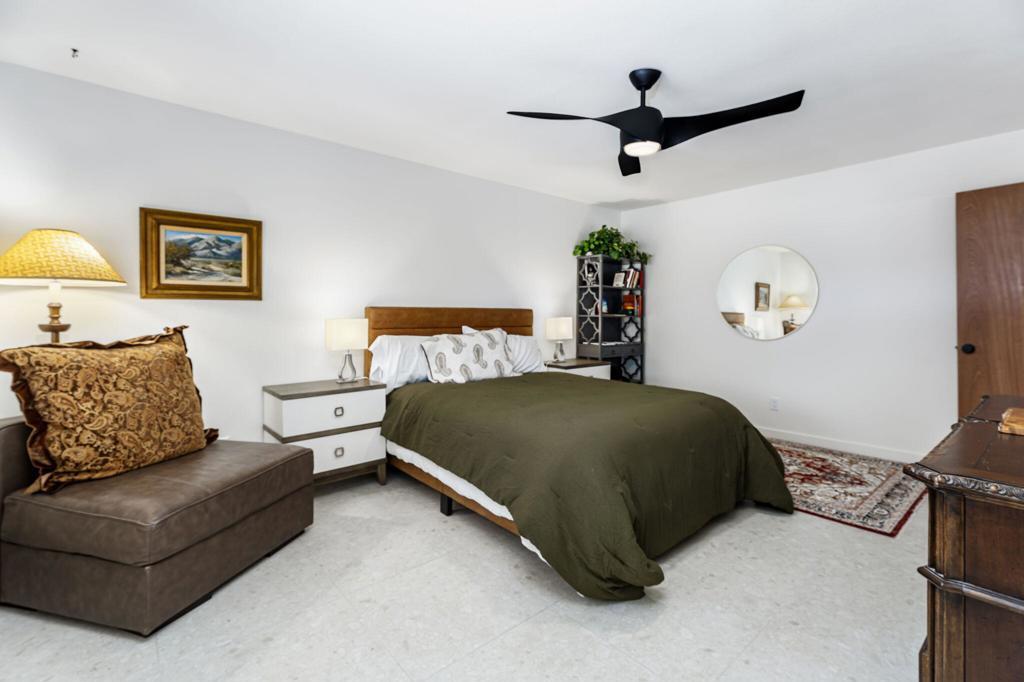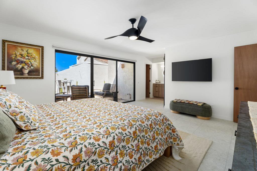 Taking Back up offers~Significant Price Improvement! ~ Now Offering Exceptional Value on this fully updated Mid-Century Modern 2-bedroom, 2-bath end unit - Condo designed by renowned architect Hugh Kaptur. Offered fully furnished--just bring your toothbrush! Nestled on a peaceful cul-de-sac in South Palm Desert, this residence blends iconic architectural style with modern comfort and convenience. Step inside to a spacious open-concept living area where a striking stone fireplace serves as the focal point. Soaring vaulted ceilings and clerestory windows fill the home with natural light, complemented by elegant tile flooring and motorized shades for privacy. The updated Kitchen features sleek Quartz countertops and Stainless Steel Appliances, while the adjacent dining area provides an inviting space for everyday living or entertaining.The Primary Bedroom offers a walk-in closet, en-suite bath, and direct access to the patio with beautiful mountain views. The Guest Bedroom also features a walk-in closet, and an additional updated full bath provides comfort. The inviting private Patio creates the perfect indoor-outdoor lifestyle, Mountain Views & Ideally located near El Paseo's world-class shopping and dining. Don't miss this opportunity! Additional highlights include direct access to a 2-car garage with a laundry area complete with washer, dryer, and an extra refrigerator. Outdoor recreation including desert hiking and biking. Community amenities include a Pool, Spa, and Tennis Courts--offering a resort-style lifestyle in the heart of Palm Desert. Experience the perfect blend of mid-century architecture, modern updates, and desert tranquility in this exceptional home.