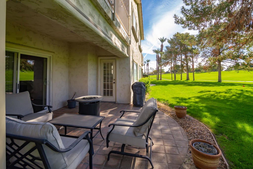 Tastefully Remodeled 2BR/2BA Condo with Stunning Southern Golf Course Views. Step into this beautifully remodeled downstairs condo featuring two bedrooms and two baths, perfectly positioned for sweeping southern views across multiple fairways. The custom kitchen showcases quartz countertops, newer cabinetry, stainless steel appliances, designer lighting, and a built-in desk. Enjoy the desirable kitchen nook, ideal for a breakfast table or extra workspace.The primary suite offers an updated bath with quartz countertops, framed mirrors, LED lighting, and a sleek frameless glass shower with floor-to-ceiling tile. An updated wet bar with quartz countertop enhances the open-concept living area, which features wood-look tile flooring throughout, plantation shutters, and a newer sliding door leading to the Saltillo-tiled patio, perfect for relaxing and enjoying the views. Short-term rentals permitted and offered nicely furnished per inventory list.Community Highlights:Prime mid-valley location with easy I-10 access, close to dining, shopping, grocery stores, and the new Acrisure Arena.Desert Falls amenities include pickleball, tennis, fitness center, 24-hour guard-gated security, internet, and extended cable. Golf is available with pay-as-you-play or optional membership. Enjoy the best of resort-style desert living in this stylish and move-in ready Desert Falls Country Club condo.