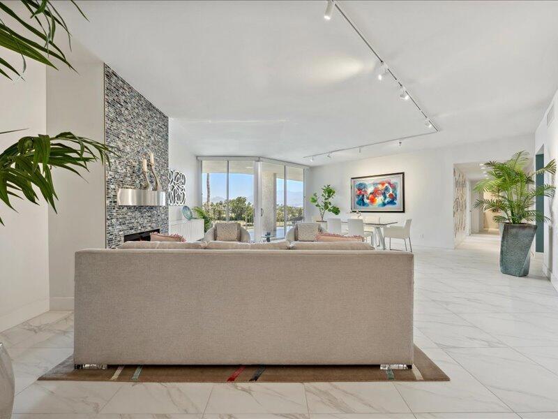 This remodeled home features stylish, contemporary design and offers tranquil lake, mountain, and golf course views from every room. It includes attractive marble-look tile flooring throughout, custom lighting, a living room with striking glass-tiled fireplace and 9-foot floor-to-ceiling windows leading to spacious terrace perfect for relaxing. The spacious main bedroom suite has walk-in closet, built-in custom cabinetry and desk area, and ensuite bath with quartz counters, double sinks and walk-in shower. The flexible guest room serves as a den with a Murphy bed and terrace access. The kitchen boasts Euro-style cabinets, quartz waterfall counters & glass tile backsplash. There is also a spacious laundry room with second refrigerator.Simply pack your toothbrush, as this home is already furnished with high-quality contemporary pieces from ''Eriks Furniture'' all included.The HOA fees cover 24-hour guard-gate, Spectrum cable TV, Wi-Fi Internet along with water, trash, gas and the maintenance of landscaping and common areas, providing a low-maintenance easy lifestyle. It is conveniently located close to shopping, dining, theaters, galleries, and casinos, and has easy access to Eisenhower Medical Center. Desert Island is a unique high-rise condominium community nestled on a lush green 25-acre island, surrounded by a sparkling lake and immaculate 18-hole championship golf course. Homeowners enjoy the open park-like grounds with walking paths, fruit trees, benches, tennis and pickleball courts, heated swimming pools and spas, pedal boats, fishing and guard gate entry. Buyer to verify square footage