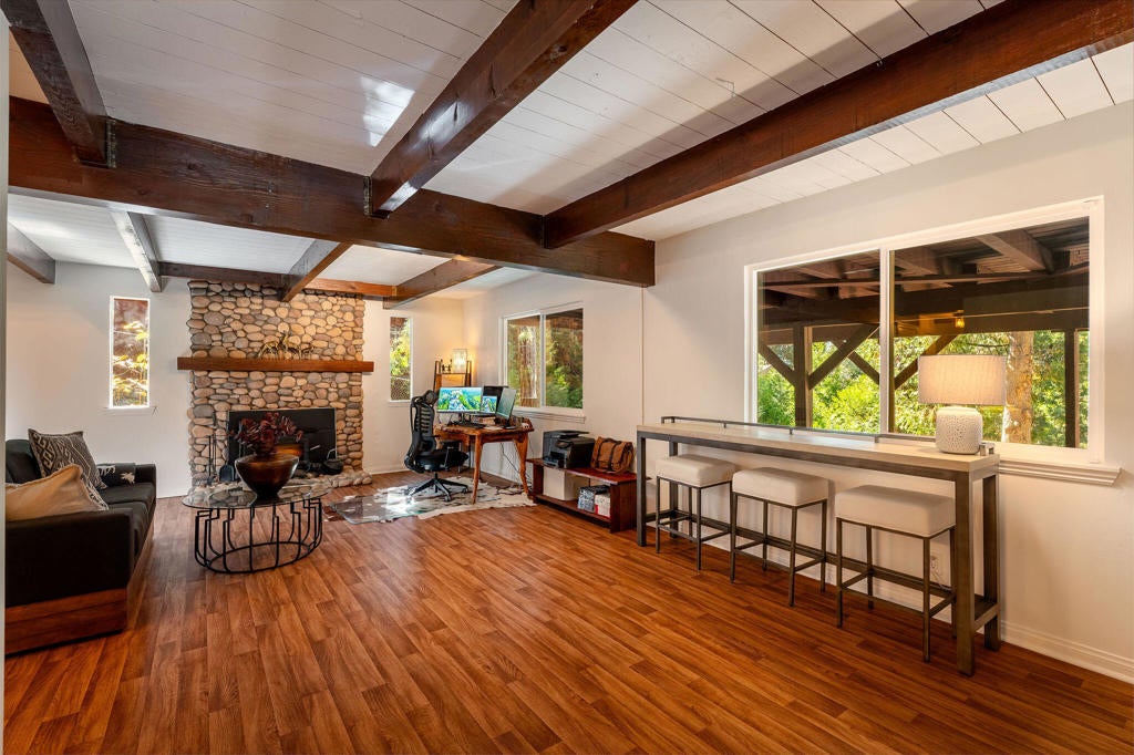 Tucked at the end of a quiet cul-de-sac, is this beautifully updated 3 bed, 2 bath mountain country modern home The open-concept living area features a river rock fireplace with airtight wood-burning stove, vaulted ceilings with exposed beams, and a fully renovated kitchen with granite counters, stainless steel appliances, and knotty pine cabinetry. Enjoy year-round comfort with dual-pane windows, unit, new mini-split system, new tile and vinyl flooring. Additional features include a propane back-up Generac, tankless water heater ,propane wall heat unit, fully fenced yard, routine pest control, and a 2-car garage. Downstair has minimum development possibility to add a little kitchenette if desired and features a wood stove as well as outdoor access with full bath. Most furnishings and appliances are included--ready for move-in turnkey enjoyment. Expansive deck surrounded by tall pines and cedars offers peaceful forest outdoor living at its best. Very well Maintained, motivated seller submit all offers.