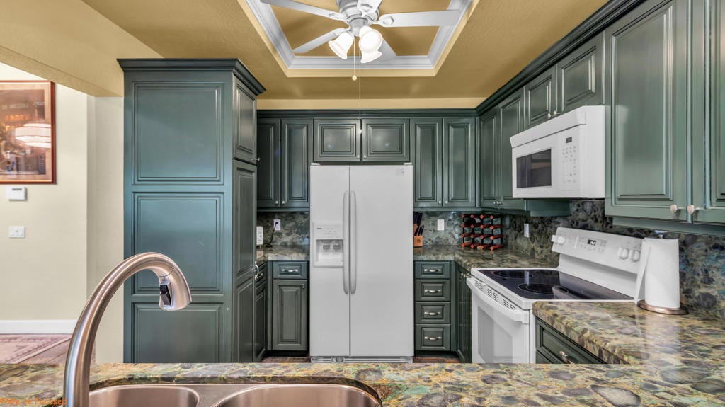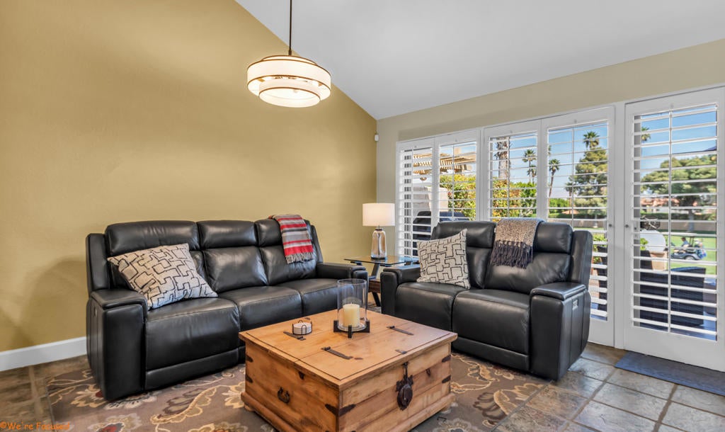 Experience refined desert living in the prestigious Woodhaven Country Club. Perfectly positioned on the 10th fairway, this beautifully renovated Oakmont condo showcases sophisticated slate flooring, luxurious granite countertops, and custom cabinetry throughout. Enjoy seamless indoor-outdoor living with a new extendable patio umbrella, natural gas BBQ, and stylish outdoor furnishings--ideal for entertaining or relaxing in the serene golf course setting.Inside, the open-concept living area features an electric reclining leather sofa set, flat-screen TVs, and elegant plantation shutters. The kitchen is equipped with newer, high-end appliances, while both bathrooms have been thoughtfully updated with modern walk-in showers for a spa-like retreat. Offered turnkey, this home is move-in ready--inviting you to immediately embrace the tranquil views and vibrant lifestyle of this sought-after desert community. HOA amenities include reduced rates for homeowners, golf memberships available, 7 newly resurfaced tennis, 4 pickleball courts; fitness facility and classes, club house, with full restaurant and lounge services and entertainment; banquet facility, 4 pools, putting course, activities and classes; guarded gate, landscaping, trash/sewer, cable/internet included in HOA dues. Don't miss your opportunity to own a piece of paradise in Woodhaven Country Club.