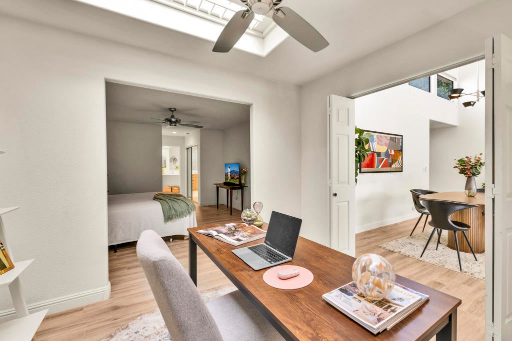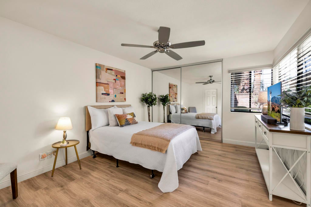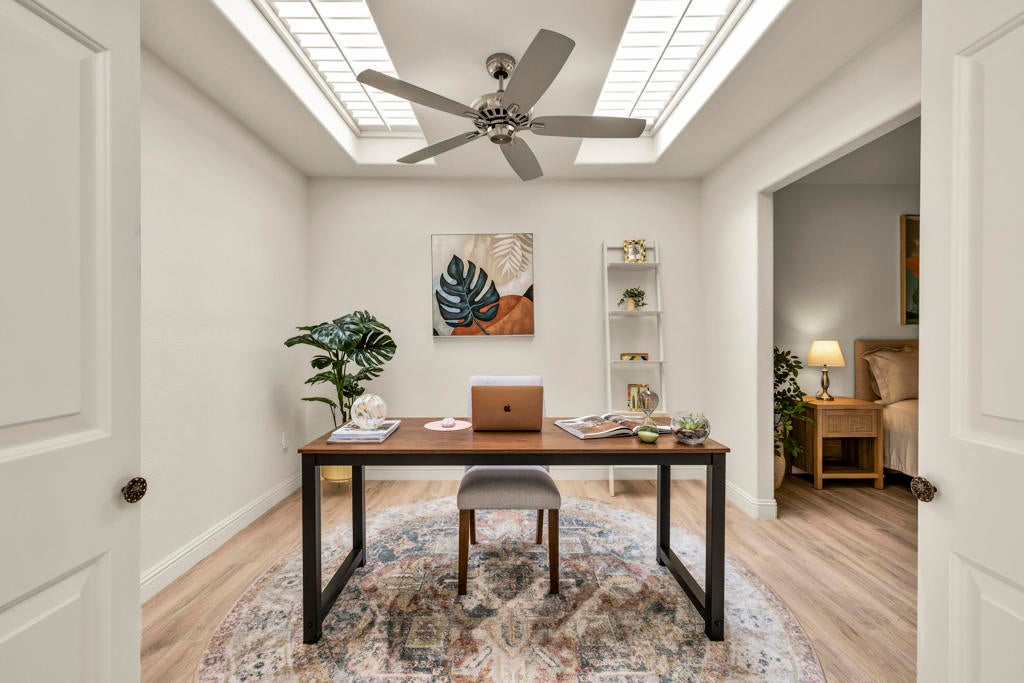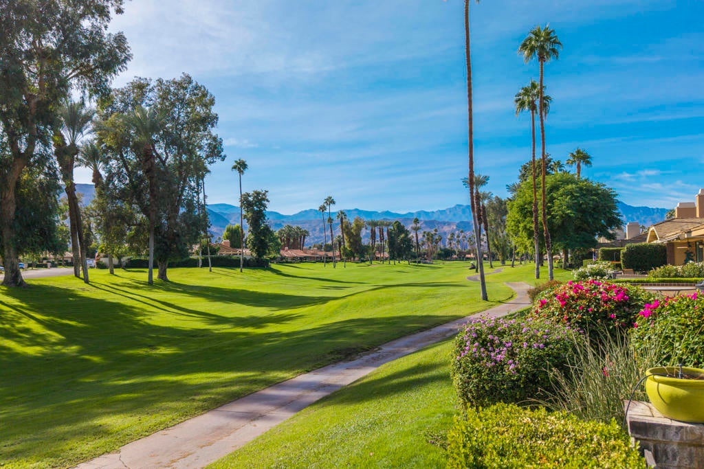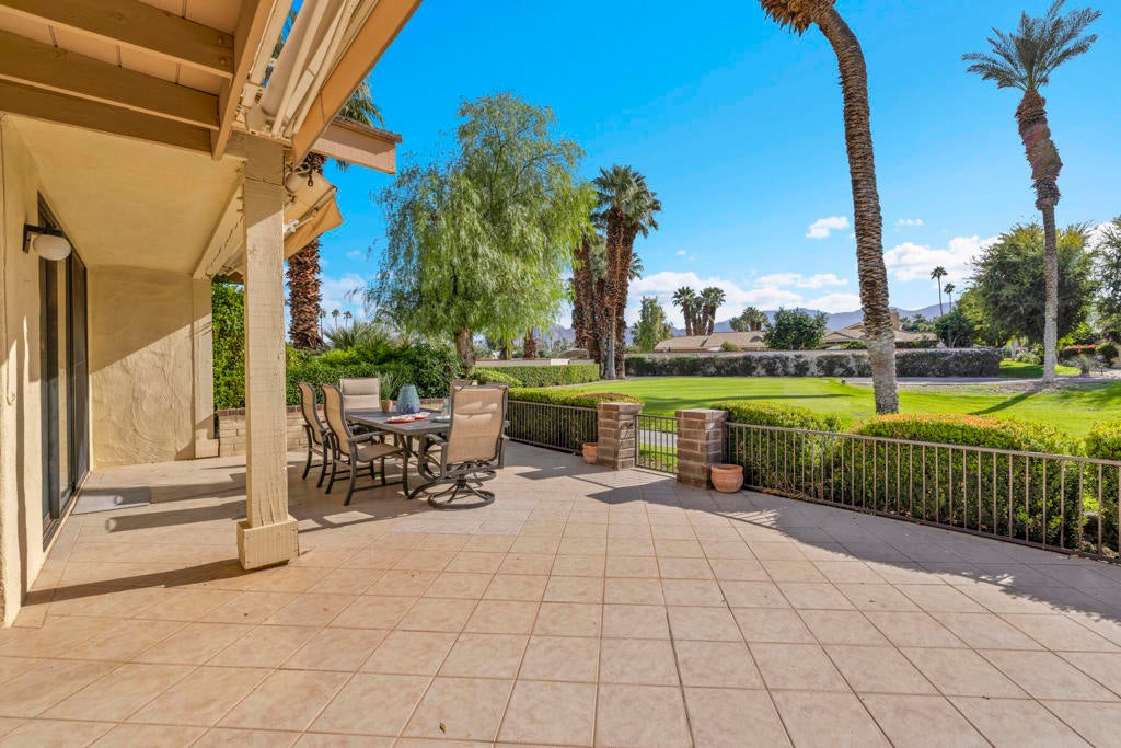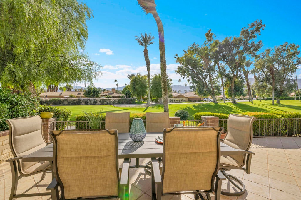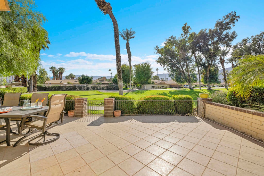 This two-bedroom, two-bath home also offers a great den/flex space and sits in a prime spot at the end of the street. With ideal south exposure, the home has seen thoughtful updates. The atrium has been converted into a cozy office/TV room just off the spacious primary bedroom, which includes two closets and a beautifully remodeled, modern primary bath.The kitchen is large and open, with fantastic storage, new appliances, and a generous island that opens to the living room--perfect for everyday living and entertaining. Luxury vinyl plank flooring has been installed throughout, replacing all carpet.The south-facing patio overlooks the men's 9th tee of the South Ted Robinson course in a location that avoids golf ball concerns. The patio has been expanded and tiled, and retractable awnings offer comfort on sunny days. The view is truly exceptional, stretching down the fairway with the mountains as your backdrop.