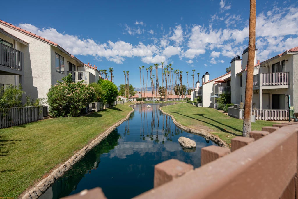 One of the best values in Palm Desert! This move in ready 2 bedroom, 1 bath home is filled with natural light, featuring an open-concept living and dining area that flows seamlessly into the kitchen. The kitchen includes ample cabinet space which leads one out to the private patio with tranquil pond views The unit also offers in unit laundry for everyday convenience and an assigned covered parking space just steps away. Whether you're looking for a full-time residence, a seasonal escape, or an investment property with strong rental potential, this home checks all the boxes. Palm Lake offers resort-style amenities including two pools and spas, tennis and volleyball courts, a fitness center, clubhouse, and more--all just minutes from world-class shopping, dining, and entertainment on El Paseo, Palm Desert Charter Middle School & Palm Desert High School.