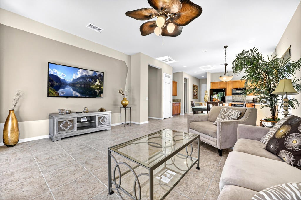 Stylish comfort in a prime location! Welcome to Sun City Shadow Hills, a premier 55+ active adult community. This popular Serrente floor plan is TURNKEY FURNISHED, offering 1,488 sf (EST.) of thoughtfully designed living space featuring 2 bedrooms, 2 bathrooms, and a versatile den--perfect for a home office, craft room, or guest space. A welcoming entry leads into the open-concept living area with elegant tile flooring, creating a seamless flow for entertaining and relaxation. The kitchen boasts granite slab countertops, black appliances, and ample cabinetry, combining functionality with a modern touch. Soft carpeting in the bedrooms adds warmth and comfort, creating a relaxing retreat. Enjoy indoor-outdoor living from your covered patio, perfect for morning coffee or evening gatherings. Additional highlights include a spacious primary suite with walk-in closet and dual vanity bath, a guest bedroom with nearby full bath, and an inviting den that enhances the home's flexible layout. With its comfortable floor plan, quality finishes, and desirable location, this home is ready to make your desert lifestyle complete! The garage is equipped with an energy-efficient AC mini split, ideal for year-round comfort--whether used for projects, storage, or a fitness space. Residents of Sun City Shadow Hills enjoy access to two golf courses, two clubhouses, fitness centers, pools, pickleball and tennis courts, and a variety of social clubs and activities--offering a vibrant and active desert lifestyle.