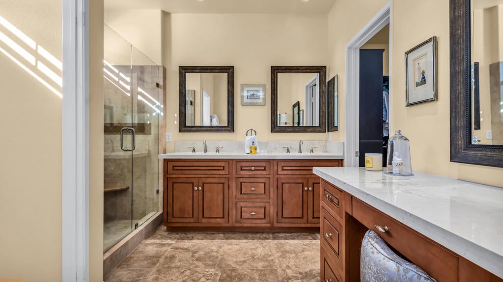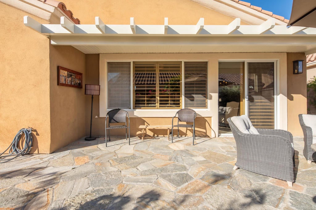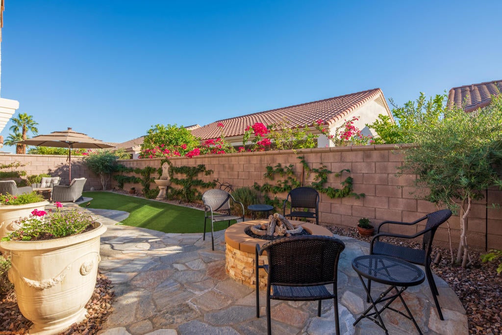 Welcome to this stunning, meticulously maintained, and beautifully upgraded one-of-a-kind St. Maarten model offering 2 Bedrooms PLUS Den & 2 Baths. A home that truly stands apart for its elegance, warmth, and attention to detail. You're greeted by a gorgeous custom courtyard featuring stacked stone accents, wrought iron detailing, and a soothing water feature that instantly sets a tone of tranquility. Step inside to discover spacious living areas with 20-inch tile flooring and rich hardwood floors in the bedrooms and den and attractive custom shutters throughout. The open-concept great room is designed for effortless entertaining and everyday comfort. It flows seamlessly into the reimagined chef's kitchen, a showpiece with custom Alder wood cabinetry, pullout shelving, inset glass panels, a generous granite island with pendant lighting, and stainless-steel appliances, including a new refrigerator. The inviting great room features a custom Alder media center and expansive views of the sunny, south-facing patio, perfect for relaxing or hosting guests. The luxurious primary suite is a serene retreat offering a custom walk-in closet with built-in organizers and a spa-inspired ensuite with dual sinks, makeup vanity, elegant cabinetry, marble countertops, and a travertine-tiled shower. A spacious guest suite on the opposite side provides privacy. The guest bath is enhanced with attractive cabinetry, rimless glass shower enclosure, and high-end finishes. The versatile den makes an ideal office, hobby space, or additional guest area. Step outdoors to your private entertainer's paradise, a south-facing patio featuring an alumawood cover that has been freshly painted, flagstone hardscape, lush artificial turf, and a cozy natural gas fire pit perfect for evening gatherings & conversations beneath the stars. Additional highlights include: indoor laundry with new stackable washer/dryer (2024), two-car garage with utility sink, tankless water heater, and MaXimum workbench/storage, HVAC (2022), refrigerator (2023), garbage disposal (2023), kitchen faucet (2024), and new smoke/CO₂ detectors. Offered turnkey furnished. This exceptional, move-in-ready home embodies comfort, sophistication, and true pride of ownership, a must-see!