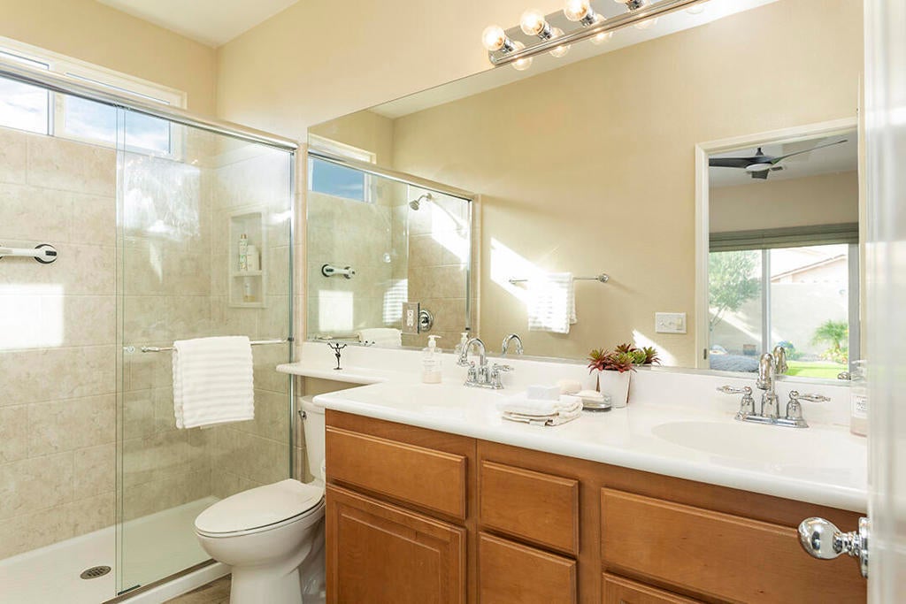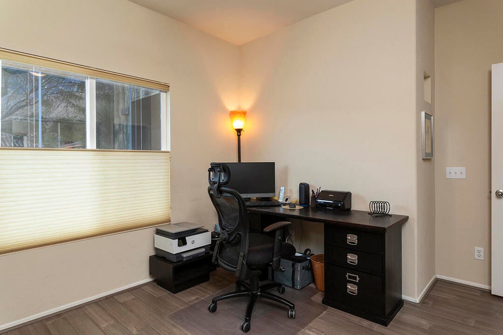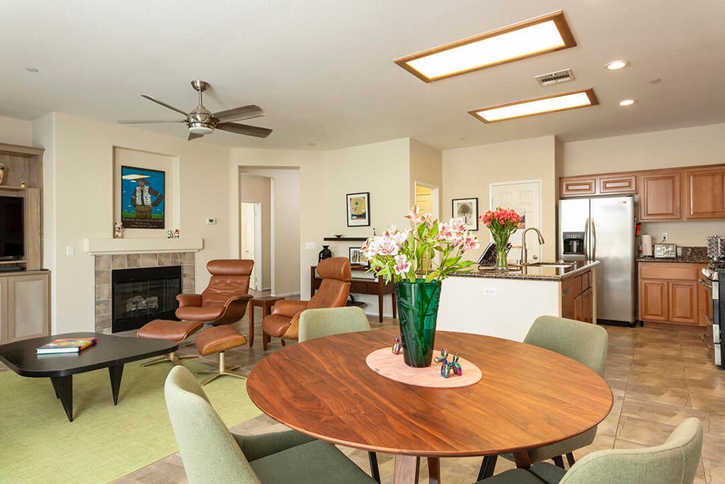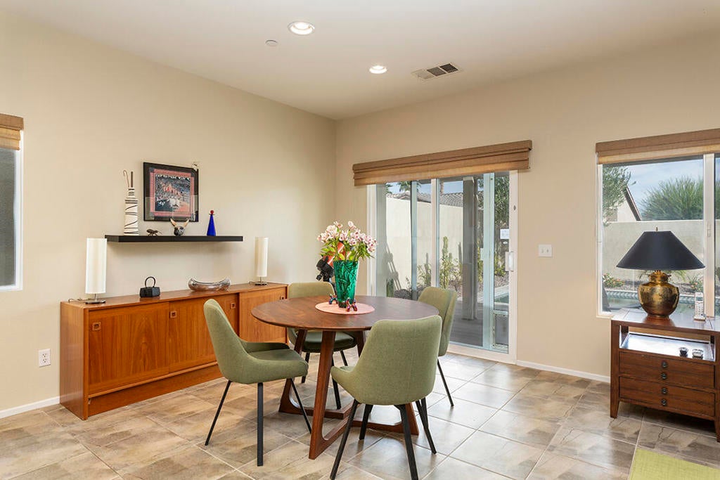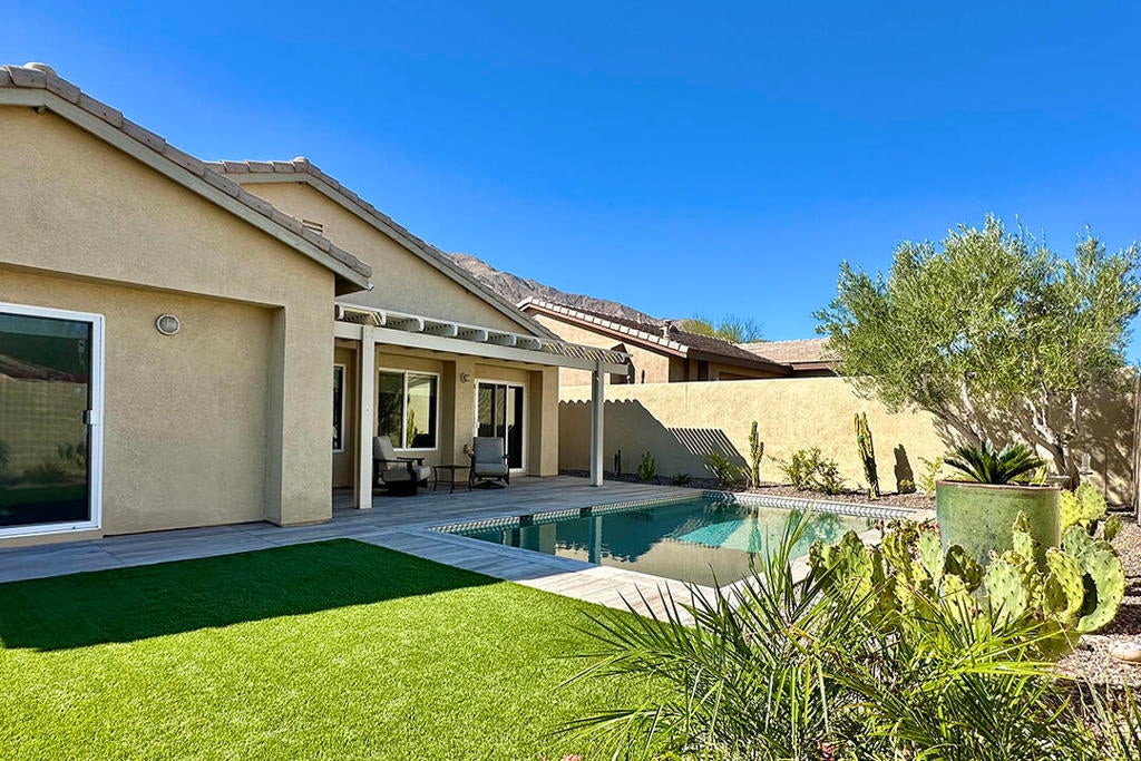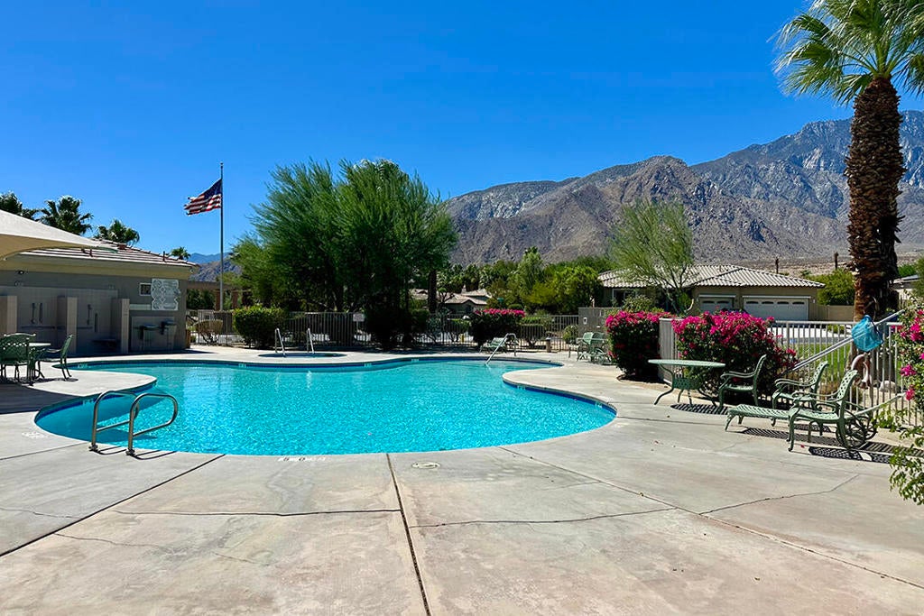 Experience the best of desert living in this beautifully updated home in the desirable Mountain Gate community of Palm Springs. This charming 3-bedroom residence has 2 bathrooms and owned solar with a battery backup. It is the ideal choice for anyone seeking a contemporary, move-in-ready property. The light-filled interior features designer tile and rich engineered bamboo flooring.The main area of the home has an open floor plan, with a refreshed gas fireplace in the living room and a media center with indirect lighting installed by California Closets. The kitchen is designed for both style and function with a dine-in prep island, warm wood cabinetry, and granite countertops. The adjacent dining area has large windows and sliding glass doors to the wood-grain-tiled back porch with an Alumiwood pergola. The private backyard includes a recently installed heated spool, artificial turf, and lush landscaping creating an oasis perfect for indoor-outdoor entertaining.The primary suite also accesses this backyard retreat. It includes an en-suite bathroom with an updated shower; there is also ample closet space. A second bedroom, located at the front of the home, offers a versatile library wall with a full-size Murphy bed--also crafted by California Closets--making it ideal as a guest room or office. The central bedroom with a French-door entry can provide even more flexibility as a media room or workspace. The guest bathroom is off the hall and features an updated tub/shower, a new sink, and a new toilet.Mountain Gate is a tranquil, gated community known for its outstanding amenities, including multiple pools, tennis courts, parks, playgrounds, and access to nearby hiking trails. The CV Link bike and pedestrian path circles the community, offering easy connectivity throughout the Coachella Valley. This Palm Springs home blends comfort, convenience, and resort-style living in one of the area's most sought-after neighborhoods.