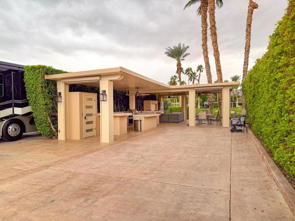 This stunning Outdoor Resort Indio lot overlooks the golf course, fountain, and bridge with sweeping mountain views and glowing afternoon sunsets. Your coach windshield faces east, welcoming gentle morning sun before the desert colors come alive each evening.The outdoor living area features a large pergola with a brand-new roof, electric privacy screens, and a comfortable lounge with entertainment center, sofa, coffee table, and dining for six. The impressive outdoor kitchen offers granite counters, stainless appliances -- refrigerator, dishwasher, oven, BLAZE BBQ, 5-burner cooktop, sink with hot water, and abundant storage -- all centered around a stylish island.With three ceiling fans, four ceiling heaters, a large storage closet with coded door, and surfaced RV pad with mid-lot hookups, this lot blends comfort, privacy, and convenience, just steps from pickleball, golf, and the clubhouse -- the ultimate in resort-style RV living.Outdoor Resort Indio is a Class A RV only resort.