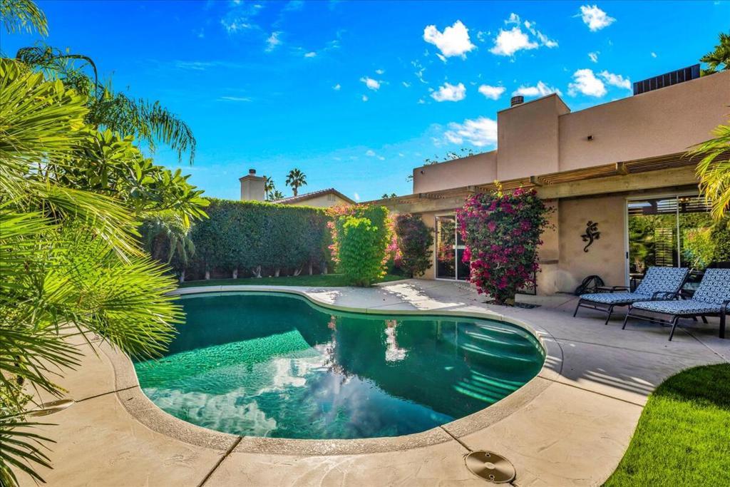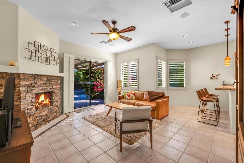 Welcome to Tucson--an intimate, gated enclave of just 72 Santa Fe-style homes crafted by award-winning builder Lance Alcano. This meticulously maintained Sedona model is a rare offering, showcasing true pride of ownership, thoughtful upgrades, and an exceptional indoor/outdoor lifestyle just minutes from the Indian Wells Tennis Garden, the Coachella Music & Arts Festivals, Desert Willow Golf; with steeply discounted resident rates! From the moment you step through the private courtyard with its Spanish-style wooden door and fountain, you'll sense the quality and warmth of this home. Voluminous ceilings, wood shutters, custom paint, stone accents, and rich wood flooring create an inviting, light-filled ambiance throughout. The open great room is anchored by a striking stone fireplace, and a stylish bar with SubZero wine refrigerator-- food / beverage drawers; perfect for entertaining. The upgraded kitchen features slab granite counters, abundant cabinetry, Stainless Steel Wolf range, SubZero refrigerator, with both a breakfast nook and a separate formal dining room nearby. The primary suite is a true retreat, offering patio access, a walk-in closet, and a spacious bath with dual vanities, separate tub, and enclosed shower. All guest bedrooms are generously sized. Additional features include ceiling fans throughout, dual-pane windows/sliders, a dedicated laundry room, fresh interior/exterior paint, and new HVAC. Home also includes an evaporative cooling system (never used by part-time owners). Step outside to your own private desert oasis with lush landscaping, landscape accent lighting, green space, a newly refinished sparkling saltwater pool and elevated spa, newer equipment, covered patio, misters, and outdoor kitchen. The epoxy-finished garage offers extensive built-in cabinetry for exceptional storage. Beautifully maintained, rich in character, and designed for effortless entertaining, this stunning Southwestern hacienda is the lifestyle home you've been waiting for. Quality furnishings available outside escrow.