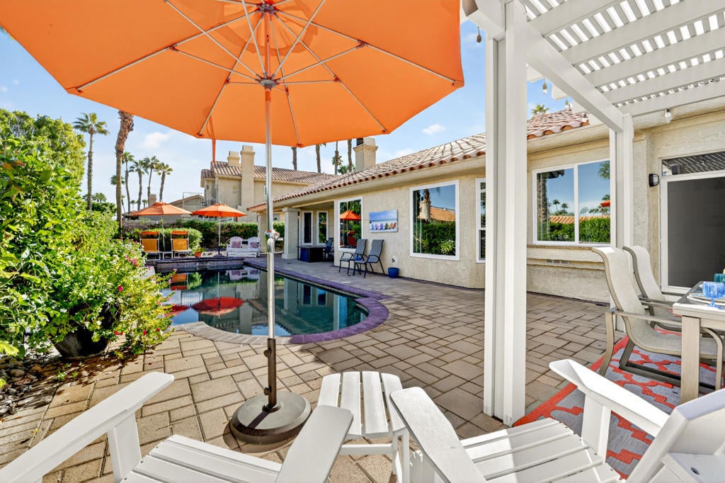 Welcome to this beautifully appointed 4-bedroom residence offering 2,596 square feet (EST.) of refined living in the highly sought-after gated enclave of The Links at Desert Falls Country Club. Turnkey upscale beautiful designer furniture is included in the sale, with a few exceptions--creating a move-in-ready opportunity for the buyer.From the moment you arrive, a grand double door glass entry sets the tone for the sophisticated style and warm hospitality that define this exceptional home. Step inside to soaring ceilings, abundant natural light, travertine flooring in the main living areas and a spacious layout designed for both comfort and elegance. The gourmet kitchen is a chef's delight--featuring rich cabinetry, granite countertops, stainless steel appliances, double ovens, a center island, and a charming breakfast nook overlooking the backyard. Multiple living spaces, including a formal living room, inviting family room with fireplace, and refined dining area, offer the perfect setting for both relaxed daily living and elevated entertaining. The primary suite is a serene retreat with backyard access, a cozy sitting area, fireplace, and a spa-inspired bathroom. Three additional guest bedrooms provide wonderful flexibility for visitors, home office needs, or a hobby space. Two full bathrooms, a half bath and a powder room offer comfort and convenience throughout the home. A bonus room, which would be perfect for a home office, game room, hobby room or workout room. Truly a smart home with all the bells and whistles! New energy efficient windows installed throughout the entire house, as well as a new pool heater, pool pump and hot water heater. Smart home technology including keyless entry, remote pool application and smart home Ecobee thermostat controls. Outside, your private desert oasis awaits. Enjoy a sparkling pool and spa surrounded by bountiful fruit trees, lush landscaping with mature hedges that create a true privacy lot. Multiple seating and dining areas, along with a built-in BBQ under the pergola, make this backyard perfectly suited for year-round desert living. Located in one of Palm Desert's most desirable guard-gated communities, The Links at Desert Falls offers a picturesque setting, beautifully maintained grounds, and close proximity to world-class golf, tennis, shopping and dining!