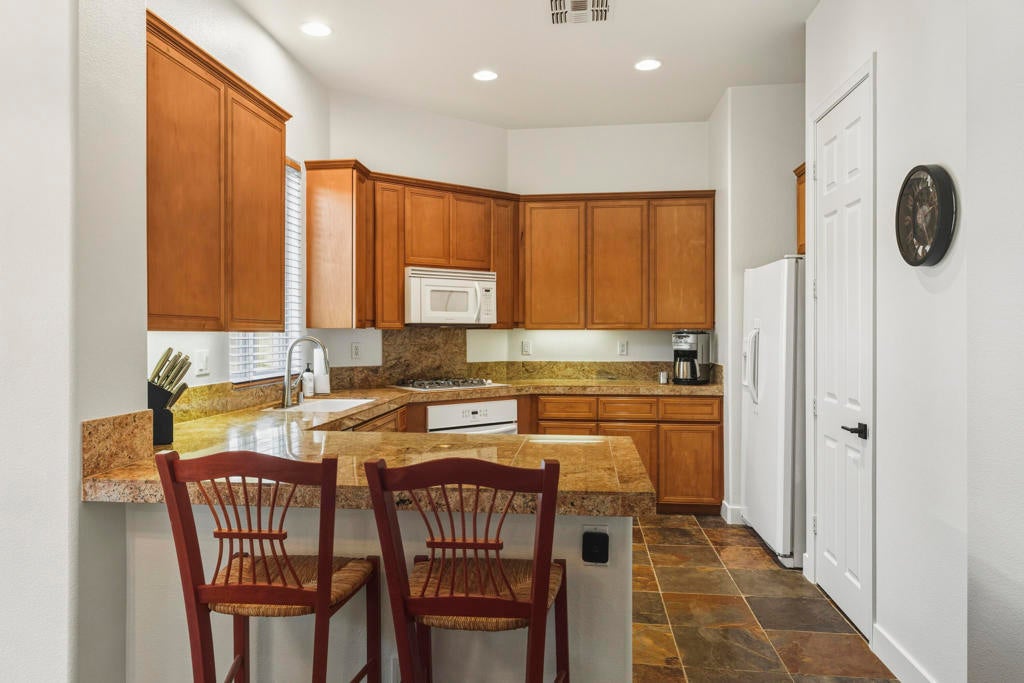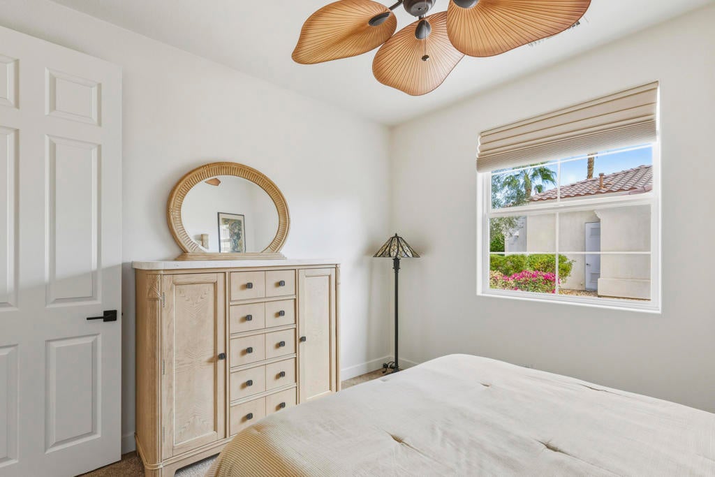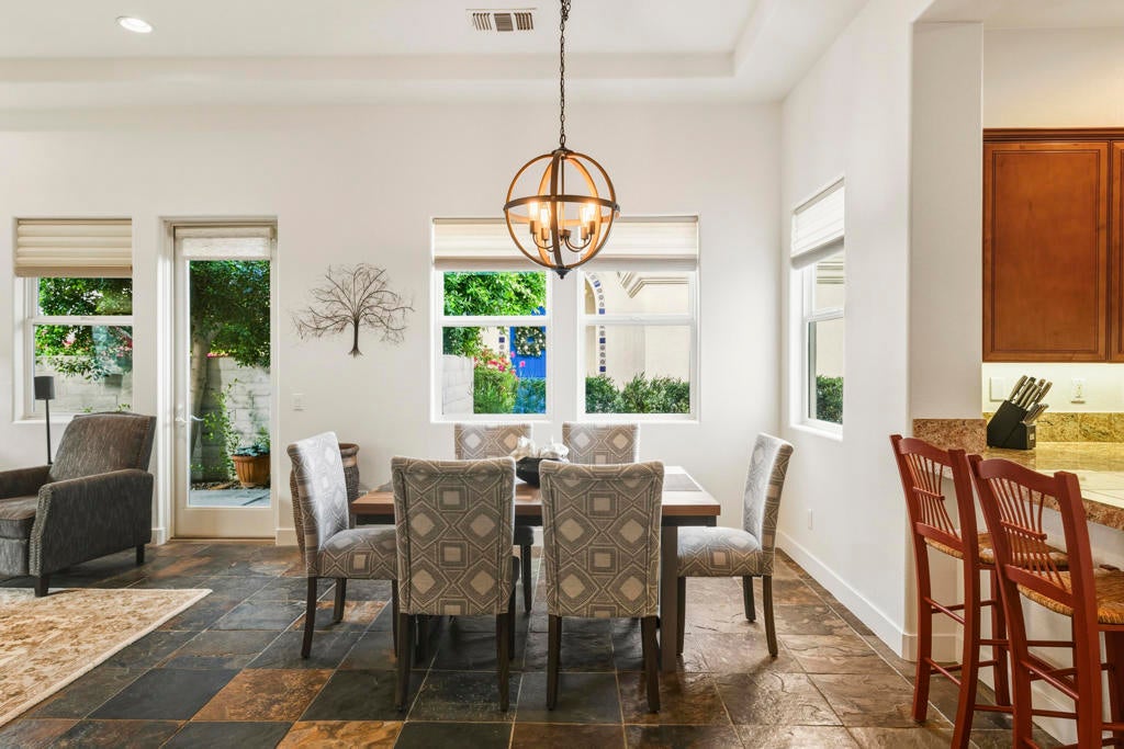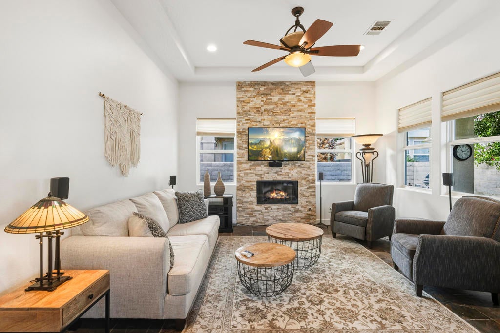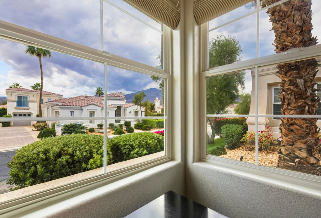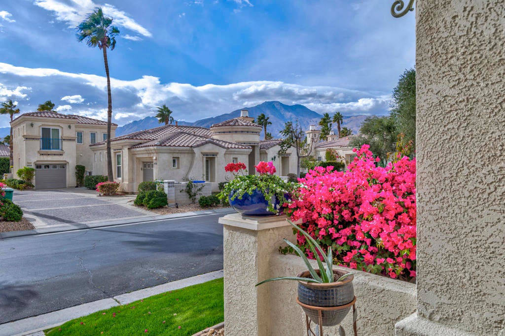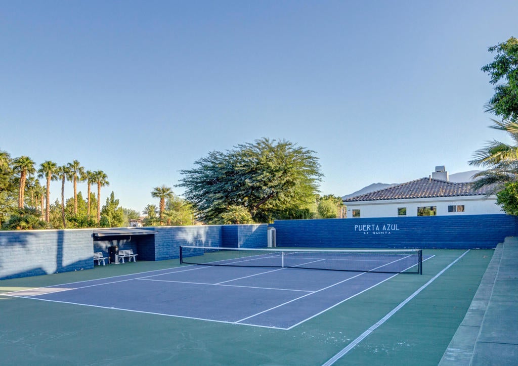 Puerta Azul's a charming village-like gated community with only 128 condos has luxury resort-like amenities. A mix of snowbirds, full time residents, and an opportunity for STR RENTAL INCOME.. One of only 4 STR communities in La Quinta! Turnkey Furnished 2bdrm/2bath. Residents and guests enjoy access to two large pools with huge views ... a lap pool and a huge resort-like lounging pool. Also a fully equipped clubhouse, a gym, tennis, bocce. Adjacent to PGA West's world-class golf, biking and hiking trails, only 10+ minutes to the heart of Old Town La Quinta or 20+ to dine or peruse El Paseo with world class shopping and it's plethora of art galleries.Just professionally painted, also upgraded with a custom stone fireplace wall that highlights the spaciousness provided by12' coffered ceilings and wrap around light filling windows. Great room opens onto an outdoor patio with BBQ. Perfectly positioned to take full advantage of all LQ and Coachella Valley 2025-26 season offers? Huge domestic and international attendance for PGA AMEX Tournament, famous BNP Tennis Tournament, world renowned Coachella and Stagecoach. The highly ranked LQ Art Celebration and lots of 5 Star entertainment at the McCallum and Casinos. For the horse crowd ... Azul is very close to Polo Fields and HITS. And almost every outdoor activity. Or indoors on ice with the new AHL Firebirds Enjoy it all ... or potential income as your guests enjoy it all!