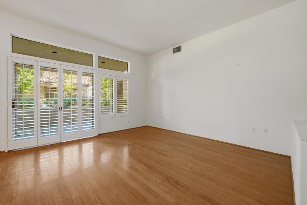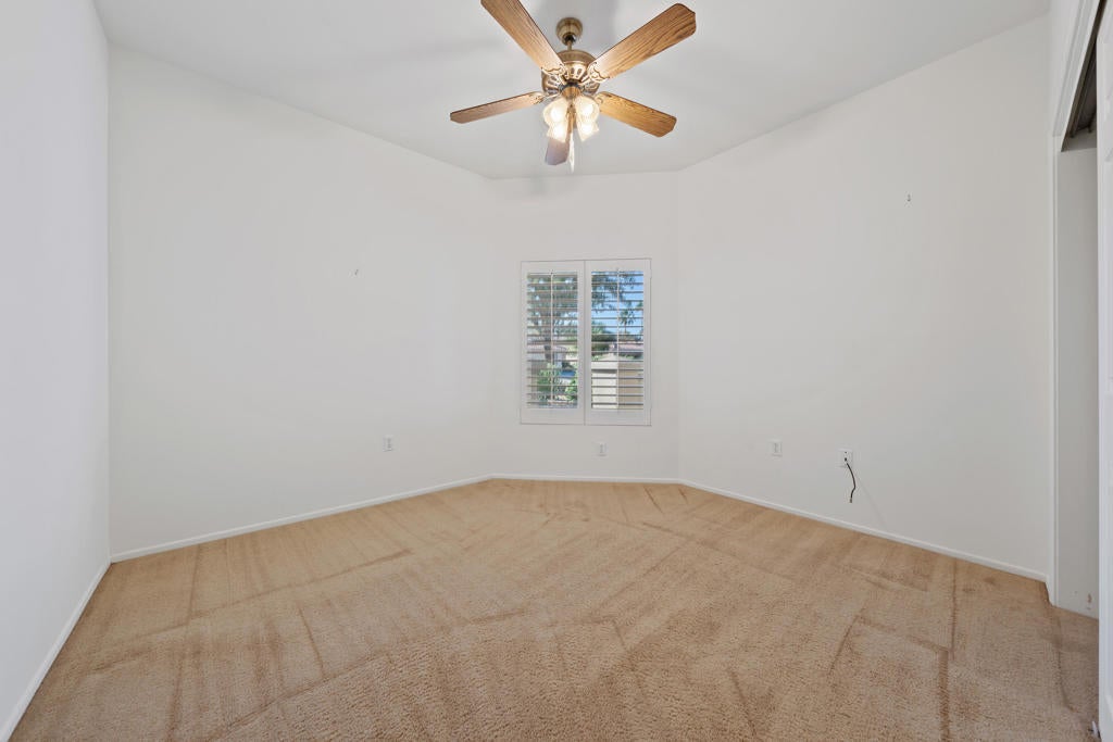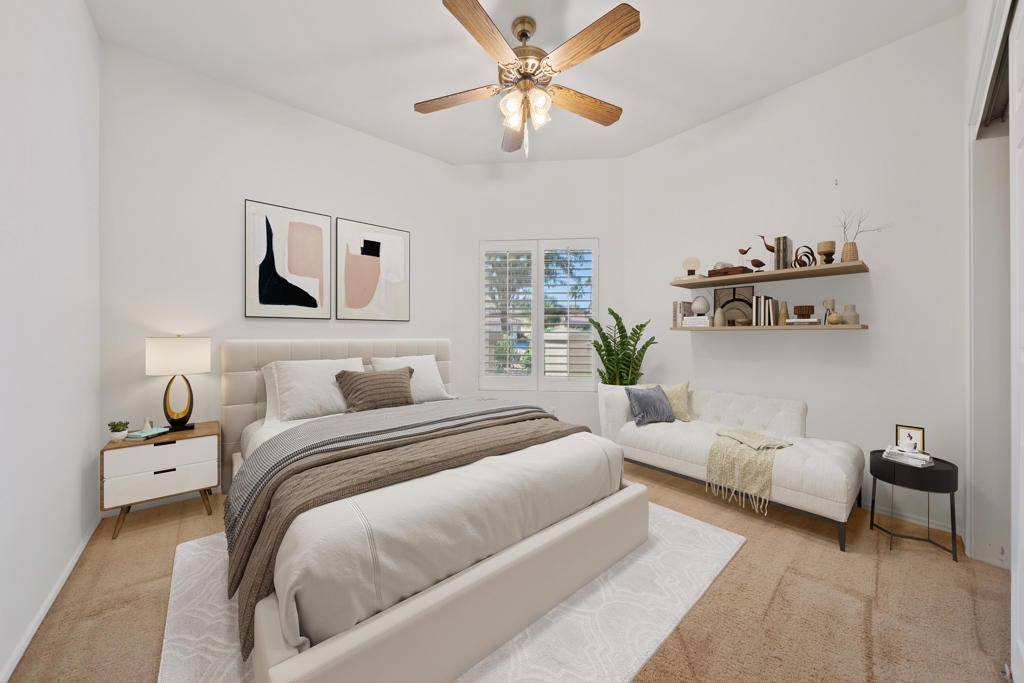 Sun City Palm Desert - Garnet. Ideally located in the heart of Sun City and just moments from both the Mountain View and Sunset View Clubhouses, this sought-after Garnet model offers low-maintenance living with HOA-maintained landscaping, roof, and stucco. The home features a spacious north-facing rear patio overlooking a lush greenbelt, plus a welcoming front courtyard that adds both charm and functionality. Inside, shutters are found throughout, and hardwood flooring extends through most of the home. The living room opens directly to the rear patio through a sliding glass door. The kitchen offers corian countertops and a convenient pantry. The primary suite includes a bay window and mirrored wardrobe closet, along with an ensuite bath featuring dual sinks and a glass-enclosed stall shower. A guest bedroom is served by a full bath with a tub/shower combination. The laundry room is located inside for added convenience. Additional highlights include a spacious two-car garage and a newer AC installed in 2019.
