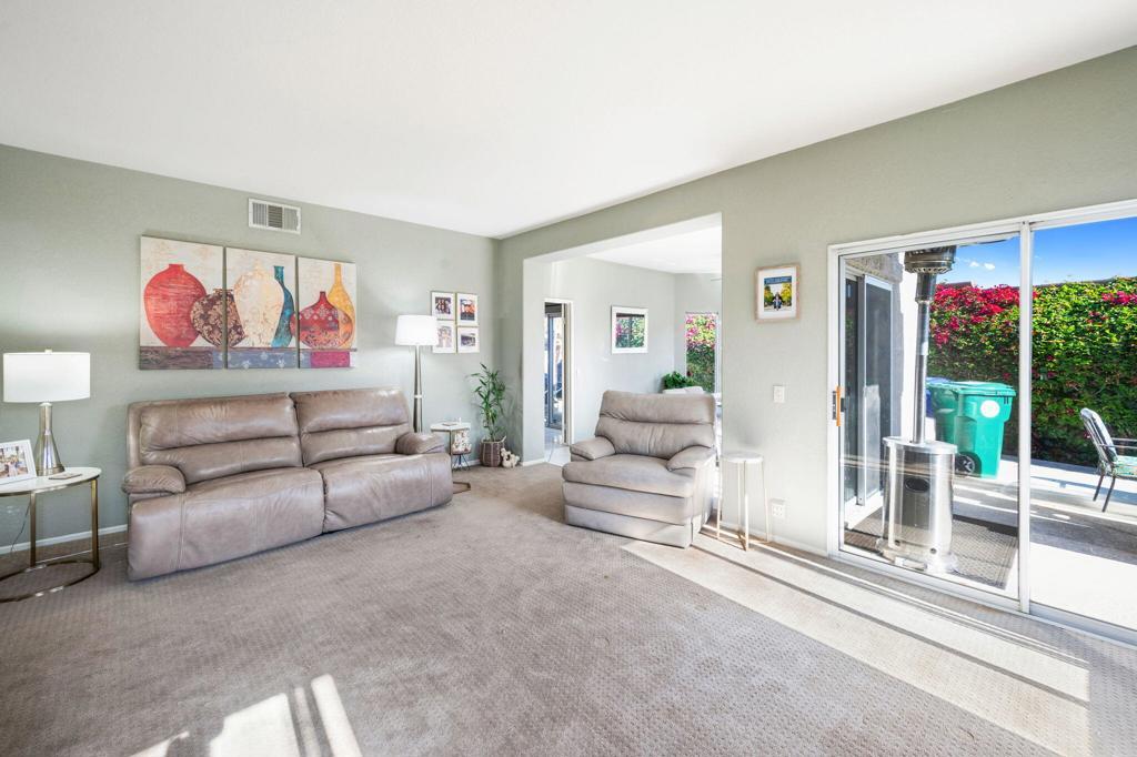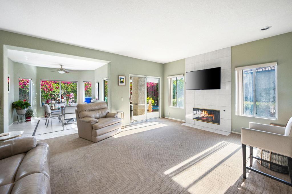 Laguna De La Paz, an upscale private community between the tennis gardens and old town La Quinta. The primary bedroom is huge with a closet bigger than most bedrooms. The spa like bath has a soaking tub, dual sinks, a shower built for two and a private water closet. Two more bedrooms each with its own bath, tile floors in the living areas and new carpet in all bedrooms. The formal dining room has custom tile and windows all around. the Gas fireplace ready for a big screen above and wet bar in the living room with new carpet. A big kitchen with breakfast nook with a ceiling fan and sliders to the wrap around patio. LED lighting throughout, recent AC and water heater for trouble free living in the IID electric service area.