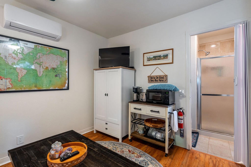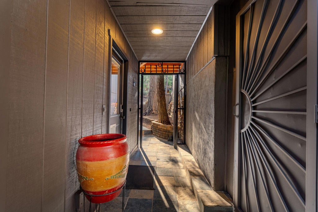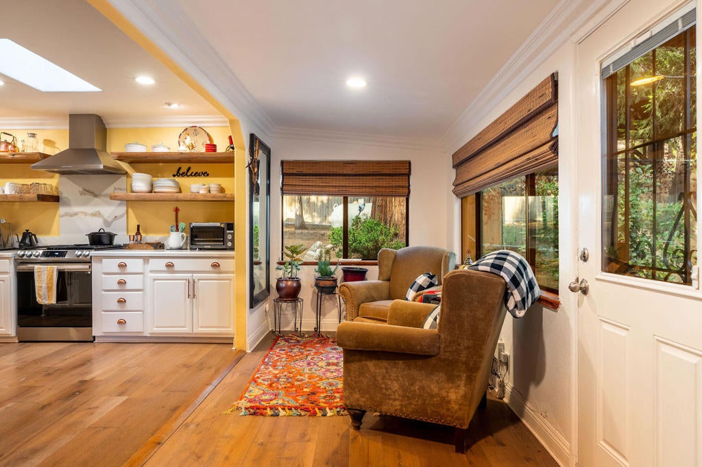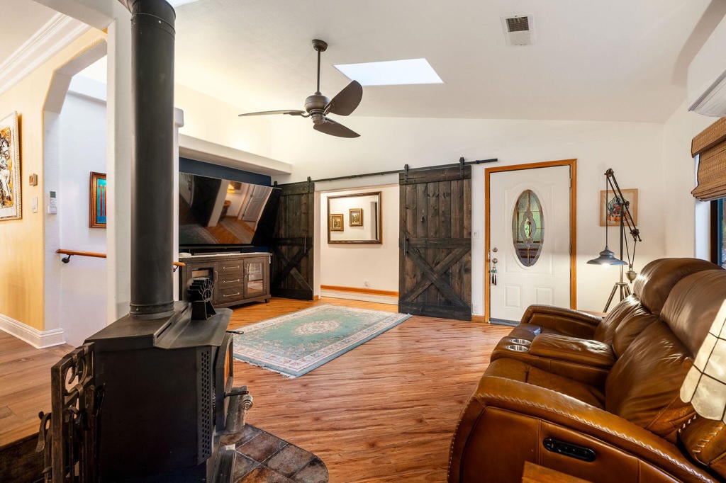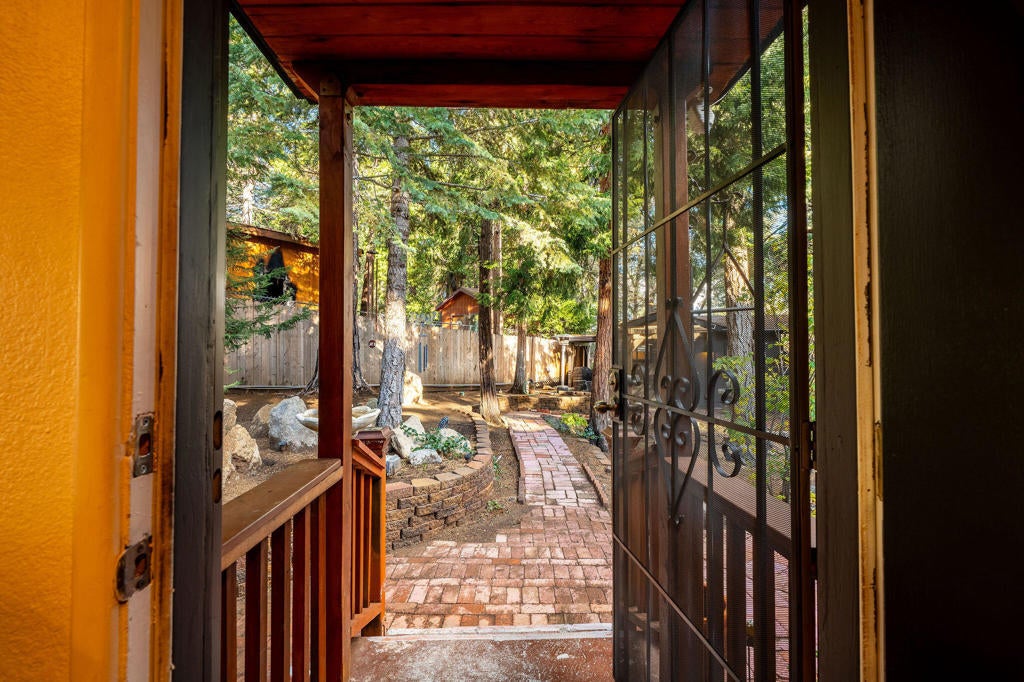 Surrounded by towering pines and fresh mountain air, this updated property offers a 3-bedroom main home plus a private guest studio--ideal for visitors, or a dedicated workspace. It's one of the rare properties in the area that includes a garage, two carports, a storage shed, and an RV lot, giving you flexibility and parking you don't often find.A welcoming entry with Tiffany-style lighting opens into an airy, light-filled living space. The remodeled kitchen follows a Modern Mountain Rustic style with quartz counters, a large island, farmhouse sink, warm copper lighting, handcrafted Idyllwild cedar shelves, and matching copper pulls. Skylights and windows in the living space fill the home with natural light and frame serene views of the surrounding forest trees.Cozy evenings center around the wood-burning stove, backed by 2 efficient forced-air heat, while a mini-split keeps things cool in summer. The rear of the home features well-planned sleeping quarters down a private hallway. The primary bedroom opens to a fenced yard through a sliding door. The second bedroom works well for guests or personal use and has access to its own bathroom. The third bedroom currently serves as a home office. The primary bathroom includes a relaxing soaker tub and a clean, warm rustic design.Outside, a renovated studio casita extends your options with its own bathroom and mini-split--great as a guest suite, rental, or creative space. The exterior is freshly painted, the yard is fully fenced, and the garage includes professional ceiling-mounted storage. Located on a maintained road in a quiet mountain setting.A rare Modern Mountain Rustic property with handcrafted details, extensive parking, multiple covered structures. Schedule your appointment today.