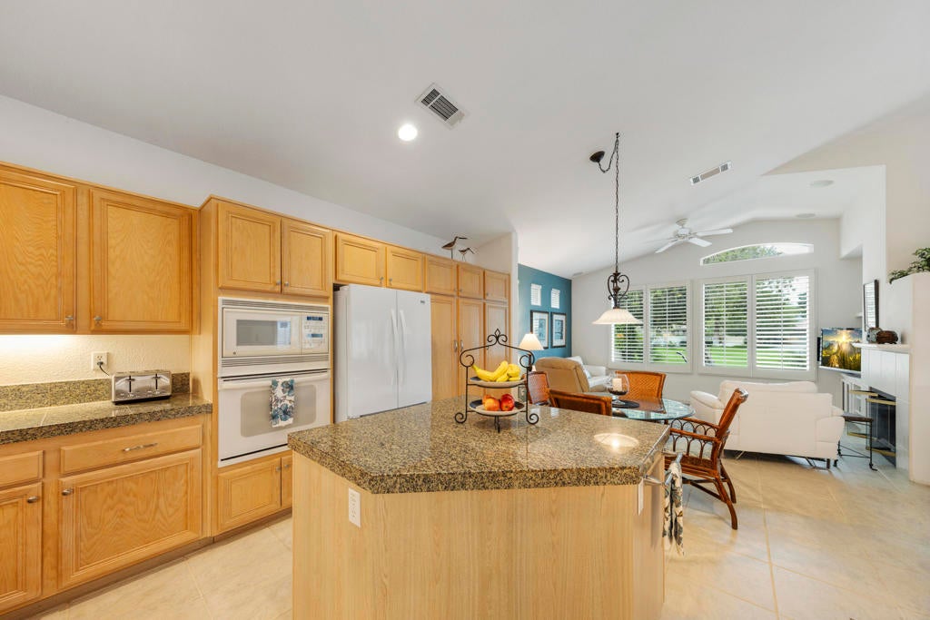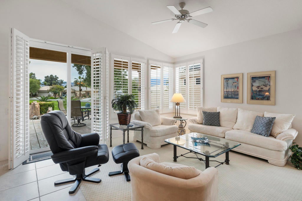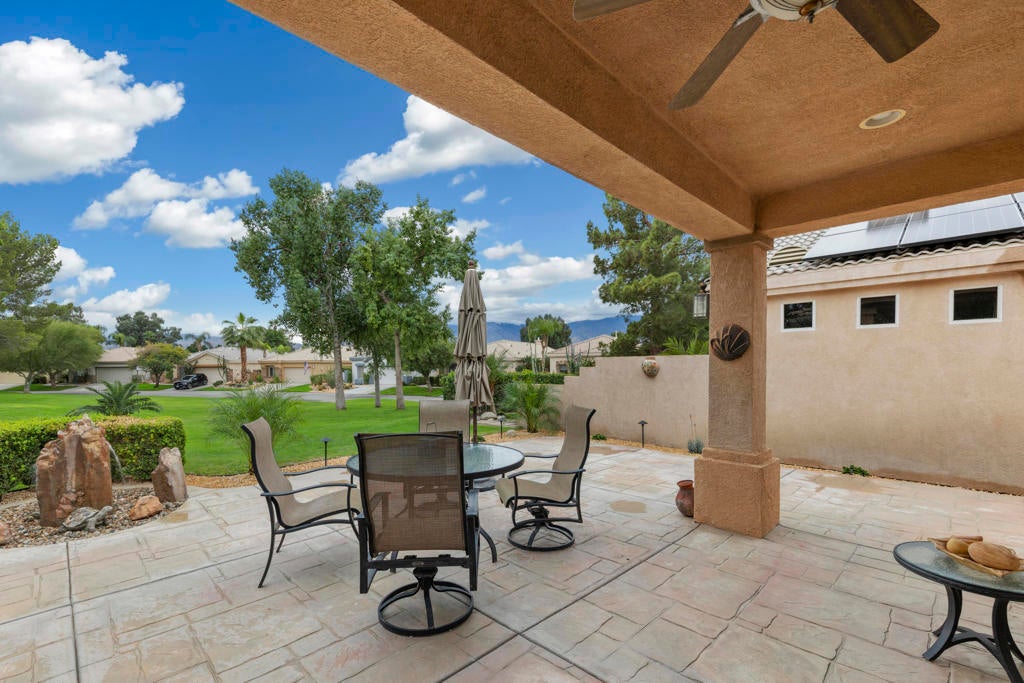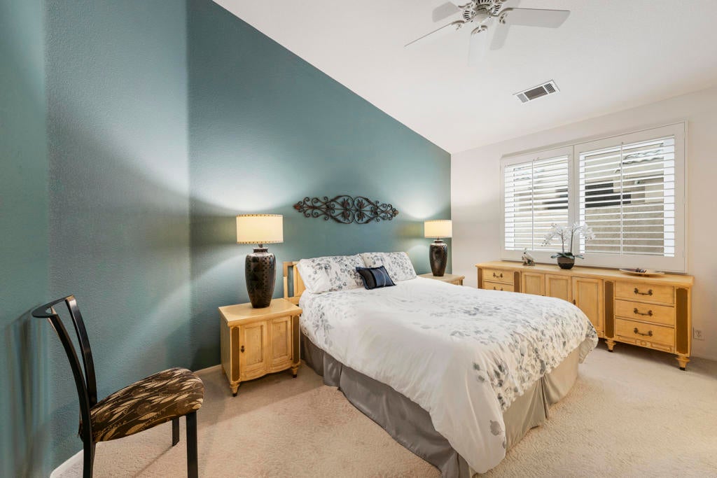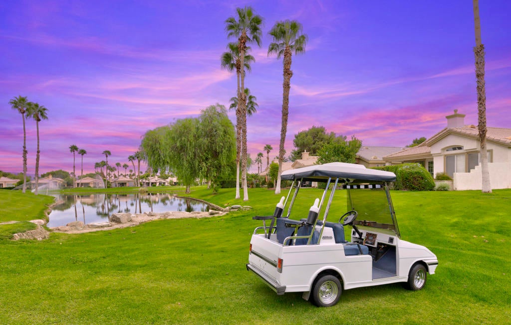 If you are looking for a home where you OWN THE LAND with a Spectacular location then this is it. Featuring the most sought after Saint Andrew's model home on a quiet cul-de-sac with your patio facing a beautiful greenbelt with mountain views. Completely Furnished Turnkey, with Plantation Shutters. This 3-bedroom 2.5 bath home features an open floor plan with natural lighting illuminating throughout the home. The Kitchen features granite countertops, with a center island. This GEM of a home has just undergone over $40,000 worth of upgrades, including Windows with a lifetime warranty, Furnace, Dishwasher, and new Landscaping, just to name a few. For a complete list call the Listing agent. A Golf Cart is included with newer lithium batteries with seating for passengers. Also included two bicycles. The Desert Princess offers a 27-hole PGA championship golf course, with discounts and preferred tee-times for owners with no initiation fees, rated among the best in the valley, beautifully maintained open year-round (except for overseeding). Member golf rates are some of the lowest in the valley. HOA dues include a social membership to the very active golf club, cable internet, including HBO and Showtime, bocce ball and 12 pickleball courts, EV charging stations, tennis courts, and fitness center, 34 swimming pools and spas. Grounds are maintained to your doorstep (you pay only for inside water). Desert Princess Country Club is conveniently located just minutes away from Palm Springs International Airport, Downtown Palm Springs, restaurants, shopping, nightlife and hiking. Several casinos are nearby. Agents be sure to show your buyers the restaurant, clubhouse, tennis courts, and fitness center.