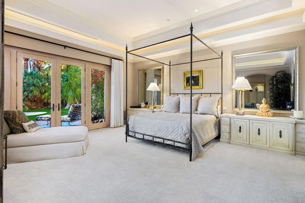 Gracefully set beyond the Canyons 12th green and fairway, this Santa Barbara-style estate welcomes you through electric entry gates into a generous motor court surrounded by cantera stone accents, custom water features, and lush meticulous gardens. Sprawling across nearly an acre, this romantic setting leads to double glass doors with custom metalwork, opening into a stunning living room with travertine floors, masonry fireplace, elegant furnishings, and seamless access to outdoor living spaces. An intimate wet bar with wine cooler, refrigerator, icemaker, and custom cabinetry is easily accessed by both the living and dining areas.The dining room is designed for both intimate gatherings and larger parties, featuring a warm wood table and seating, beveled mirror, and chandelier, with convenient flow to the kitchen and outdoor spaces. The chef's kitchen offers full-size Sub-Zero refrigerators with freezer drawers, Dacor appliances, a 6-burner range, center island with sink and bar seating, Miele dishwasher, walk-in pantry, and an inviting morning room with direct access to the outdoor barbecue. Opens nicely to the family room.Indoor-outdoor living shines in the family room, where two disappearing walls of glass frame unobstructed views of the green, fairway, and San Gorgonio Mountains. Outside, enjoy resort-style amenities including a large masonry fireplace, multiple lounge areas, infinity-edge pool, spa, waterfall feature, and custom firepit.The master retreat offers a cozy lounge with fireplace, custom furnishings, electronic window treatments, and direct access to the pool, spa and private terrace. The spacious bath includes dual vanities, garden-view soaking tub, double-entry shower, dual lavs, and generous walk-in closets. A handsome den features rich wood paneling, coffered ceiling, custom cabinetry, and abundant natural light.Two guest suites provide luxurious accommodations--one within the main residence, with closet and full bath. The detached guest house includes a full bath, morning bar, walk-in closet, masonry fireplace and built-in window seat.Additional highlights include a 3-car plus golf cart garage with generous storage room, epoxy floors and A/C. Room to add 2nd guesthouse. Unobstructed golf course views, the orientation of this home provides seating to enjoy both sunrise and sunset. Quick golf cart access to Member amenities, such as the Clubhouse, Spa & Wellness Center. Furnished per inventory, excluding art and artifacts.
