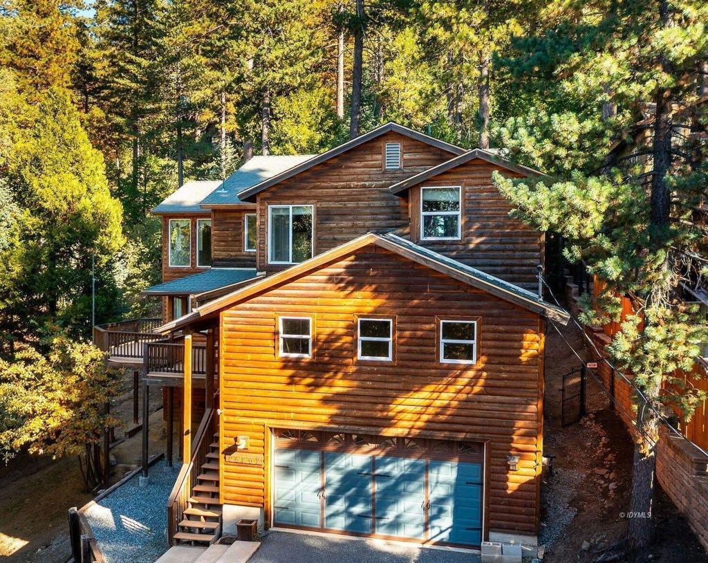 Stunning custom 3BDRM/2/5BTH log cabin style home with attached huge 2-car garage, nestled among the pines on a quiet cul-de-sac provides room for the entire family. Designed for those who love nature, comfort and lots of room, this home blends rustic charm with modern luxury. The grand living room welcomes you with soaring open-beam ceilings, floor-to-ceiling windows that frame views of towering trees and unforgettable sunsets. The impressive rock fireplace, with a high efficiency insert, provides cozy evenings by the fire. The large gourmet kitchen, breakfast nook, separate dining area, plus 1/2 BTH finish off the main level. Upstairs finds large main bedroom suite, two additional bedrooms and shared full BTH. So many extras, including new carpeting, hardwood floors, on-demand water heater, whole house fan, two decks to enjoy sunsets or relaxing moments in time, covered porch with swing, fenced back yard and additional storage space under the house. There's even room for the kids to play down by the seasonal creek.