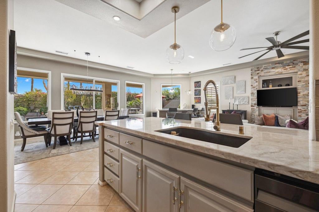 Welcome to 47410 Via Florence-- *OFFERED PARTIALLY FURNISHED*a beautifully upgraded former model home in the coveted guard-gated community of Lake La Quinta. Offering 3 bedrooms, 3 bathrooms, and 2,468 sq. ft. of thoughtfully curated living space, this residence blends high-end comfort with effortless desert style. From the moment you arrive, the curb appeal sets the tone: a paver driveway, custom landscape lighting, a gated front courtyard, and a welcoming patio create an inviting first impression. Inside, soaring ceilings, modern designer paint tones, and tile flooring throughout provide a refined backdrop for everyday living. The open-concept great room is anchored by a dramatic stone-accented fireplace and complemented by a built-in wet bar--an ideal setting for both entertaining and relaxation. Carefully selected designer light fixtures warm the home and elevate each space with character and style. The updated chef's kitchen is a true highlight, featuring quartz countertops, a sleek glass tile backsplash, black stainless steel appliances including a double oven, and abundant prep and storage space. The primary suite overlooks the serene backyard and offers wood-look tile flooring, a spa-inspired bathroom with an oversized soaking tub, custom tile shower, dual vanities with tile backsplash, and two generous walk-in closets. The versatile front guest bedroom functions seamlessly as a home office, complete with a built-in desk, Murphy bed, and private en-suite bathroom. A third en-suite bedroom ensures guests enjoy their own comfortable and private retreat. Step outside to your own private oasis. The backyard features a shimmering saltwater Pebble Tec pool and spa with a dramatic cascading waterfall, misters, roll-up shades, flagstone decking, and multiple lounging and dining zones shaded by custom umbrellas. Whether enjoying quiet mornings by the pool or entertaining beneath the desert stars, this outdoor haven delivers a resort-caliber experience. Additional features include an epoxy-coated garage with a mini split and ample storage. Within Lake La Quinta, residents enjoy exclusive access to a private 25-acre lake for electric boating, kayaking, and catch-and-release fishing, along with a 3-acre community park with a pool, tennis and pickleball courts, a BBQ area, and more. A lifestyle of comfort, serenity, and resort living awaits--this exceptional home will not last. Contact the listing agent for a private showing today.