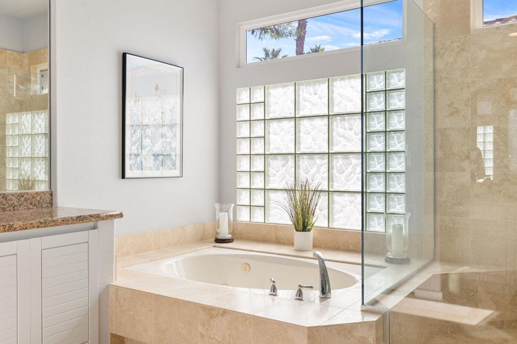 Beautifully remodeled Bougainvillea 2 with unforgettable west-facing water, fairway and mountain views! This 3BD/3.5BA, 2,742 sq. ft. home lives like a modern desert retreat - featuring sleek 24x24 Italian quartz tile, wool Berber carpet, fresh paint inside and out, and designer furnishings throughout. The living space feels bright and open with the removal of pony walls and columns, creating a seamless flow between the kitchen, dining, and great room areas. Enjoy a reimagined great room with a new gas fireplace insert, custom stone surround, recessed TV walls, and all-new LED lighting. The kitchen shines with freshly painted cabinetry and new appliances including refrigerator, dishwasher, and wine fridge. Smart-home upgrades include Nest thermostats, Lockly camera door lock, smart TVs, and new blinds with blackout in the primary. Outdoors, relax under the 17-ft remote-control awning, entertain with natural gas hookups for fire table & BBQ, and enjoy refreshed landscaping and gorgeous golf course views. Turnkey, stylish, and sitting on Arroyo #16 - this home delivers the ultimate Indian Ridge lifestyle. Sold furnished. Club Membership available.