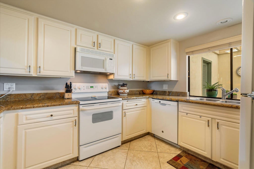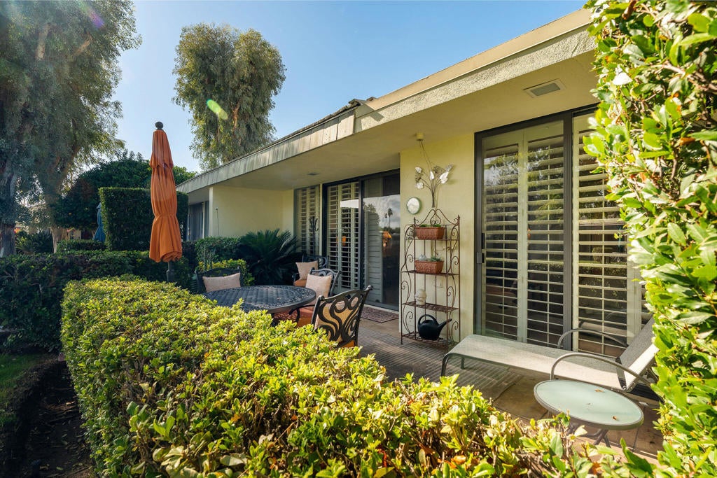 Welcome home to a stunning retreat nestled in the highly sought-after community of Sunrise Villas. The impeccably maintained two-bedroom, two-bath condo features a stylish remodel and is offered turnkey furnished. Step inside to find exquisite solid granite countertops in the kitchen, complemented by a sleek newer dishwasher. Elegant ceramic tile flows through the entry, dining area, and living spaces, while cozy carpeting welcomes you in both bedrooms. Bask in the glow of natural light streaming through wooden-shuttered windows, and enjoy the soaring vaulted ceiling in the spacious living room, which creates an ambiance of grandeur. Enjoy the private covered courtyard, complete with an outdoor dining set and a gas BBQ. The second patio is beautifully curated and landscaped. Indulge in the luxury of a primary bedroom with a remodeled ensuite featuring a stunning shower and a generous walk-in closet. A second well-appointed bedroom and full bathroom. The laundry closet, with a newer washer and dryer, is located off the courtyard. This condo also comes with a shared attached garage and a private storage locker. The HOA covers exterior landscaping, building structure, insurance, roof, painting, cable TV, internet,8 pools,3 spas,3 tennis courts. Schedule your appointment today!