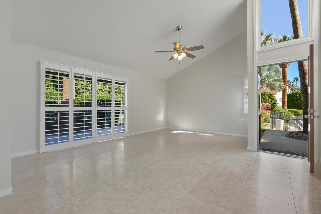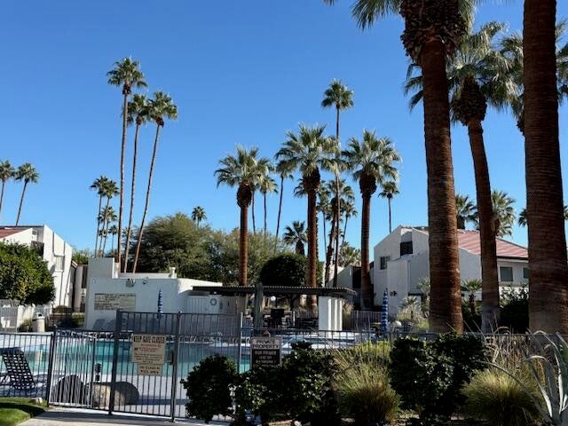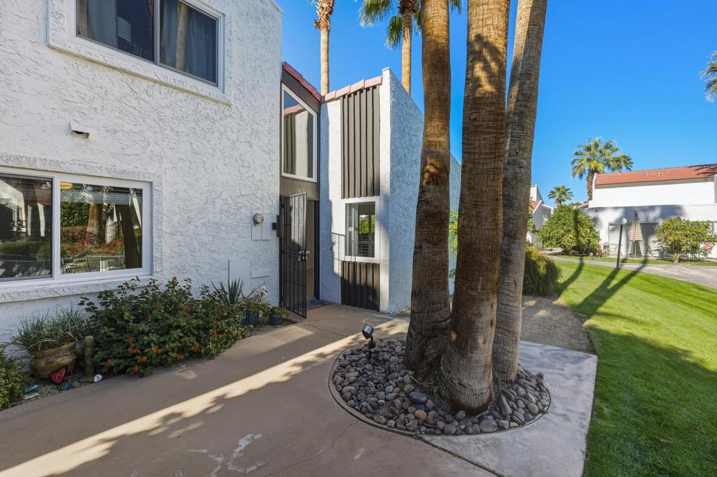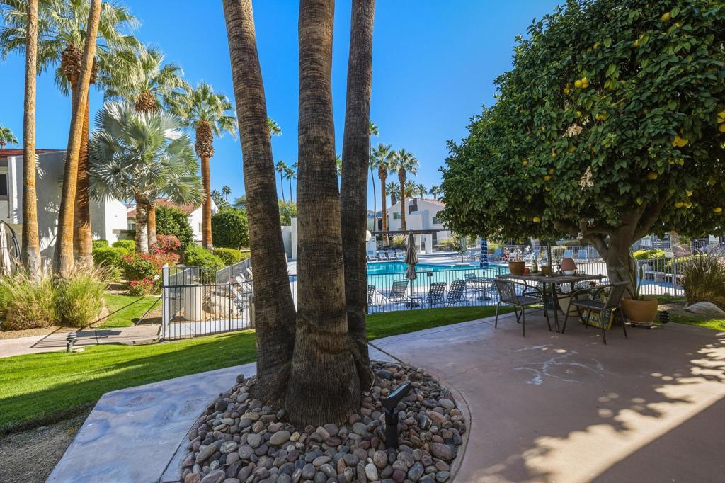 Stop looking! Look no further! Well maintained fantastic South Palm Springs single story upgraded two bedrooms, two bath condo in the highly desirable Biltmore Phase I. Coveted area of the community, interior corner greenbelt location. Open floor plan with vaulted ceiling in living area, bright and beautiful light comes in through the newer windows featuring custom shutters. Level patio spaces in front and in the back. The lovely condo is overlooking and just steps to the crystal-clear blue pool which is heated in the winter and chilled in the summer. Party cabana-BBQ's-Hot Spa-Community kitchen, wireless Wi-Fi featured at the pool, Tennis/Pickleball court. Unit has an upgraded kitchen and bathrooms, featuring granite counter tops, Interior laundry, neutral color tile flooring, good quality vinyl flooring and refined touches. Plus, a good-sized garage is attached. Very clean and move-in ready. Very close to the heartbeat of downtown Palm Springs and all it has to offer. Close to everything!