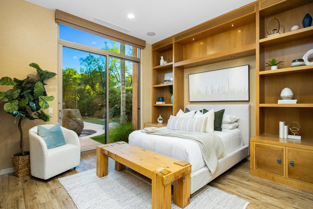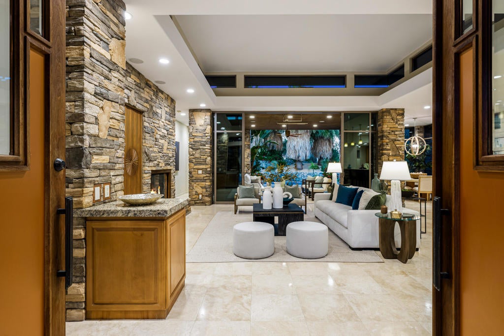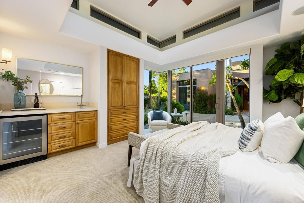 This is a lovely desert contemporary villa, located in the world-renowned Bighorn Golf Club (on the Canyons side), in picturesque South Palm Desert, boasting a spacious 3,314 SF, on a nearly .40 acre lot! Enter through a beautifully landscaped courtyard with a bubbling water feature, into a large great room featuring dramatic ceilings, Travertine flooring, a convenient wet-bar and a lovely stacked-stone, raised hearth fireplace. The open concept kitchen invites seamless entertaining and features granite countertops, high end appliances and a wine refrigerator. The large primary suite has a cozy fireplace and a generous bath. There are two additional ensuite bedrooms in the main house (one is currently being utilized as an office), plus a powder room. The private, detached casita features high ceilings and a convenient refrigerator and sink. The great room leads out to a covered patio with large fireplace, and the backyard is absolutely gorgeous, with a recently refurbished lagoon style pool, a spa that bubbles into a small pond, a custom BBQ area, firepit feature, and a fun putting green! This home embodies the deserts' coveted indoor/outdoor lifestyle! Home is staged and furnishings can be purchased outside of escrow. Come home to Bighorn!