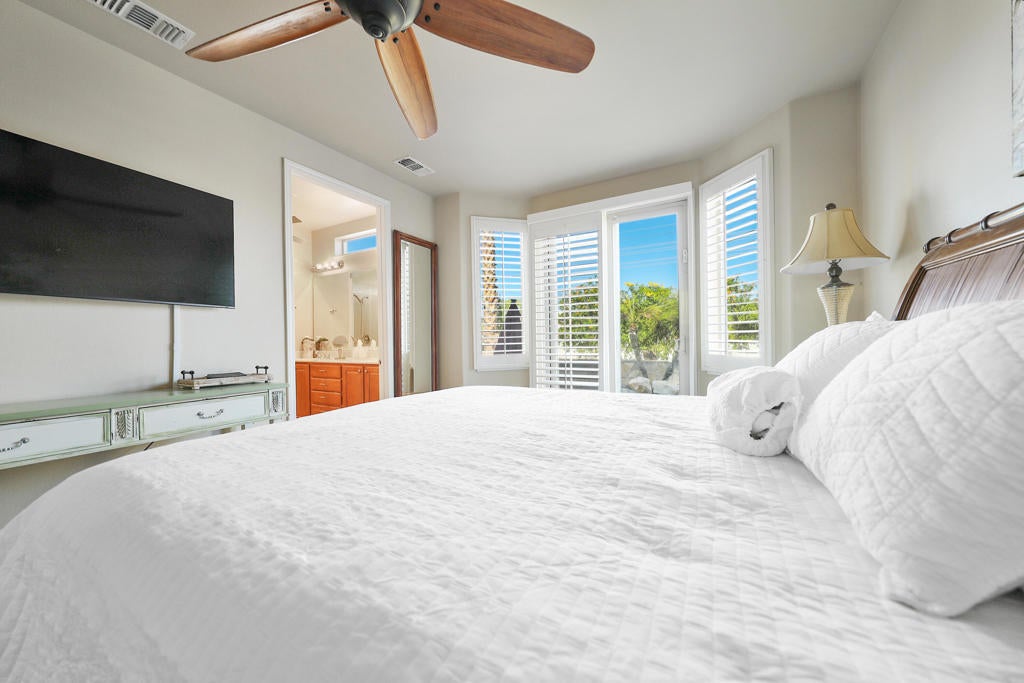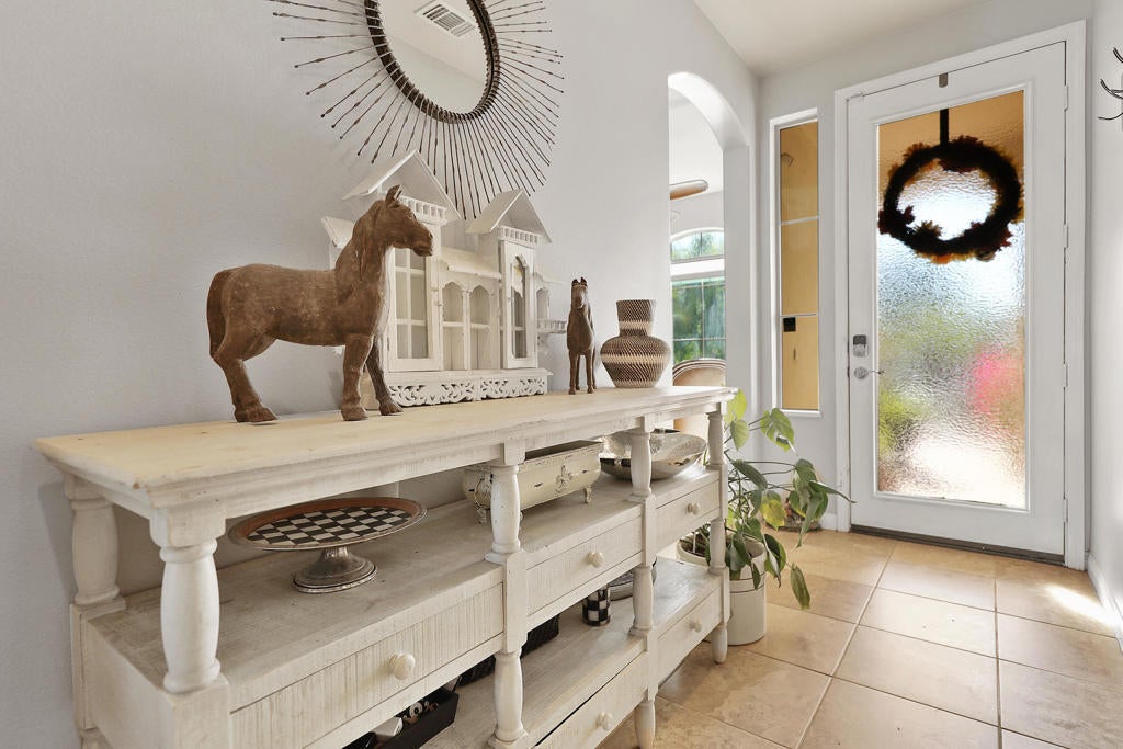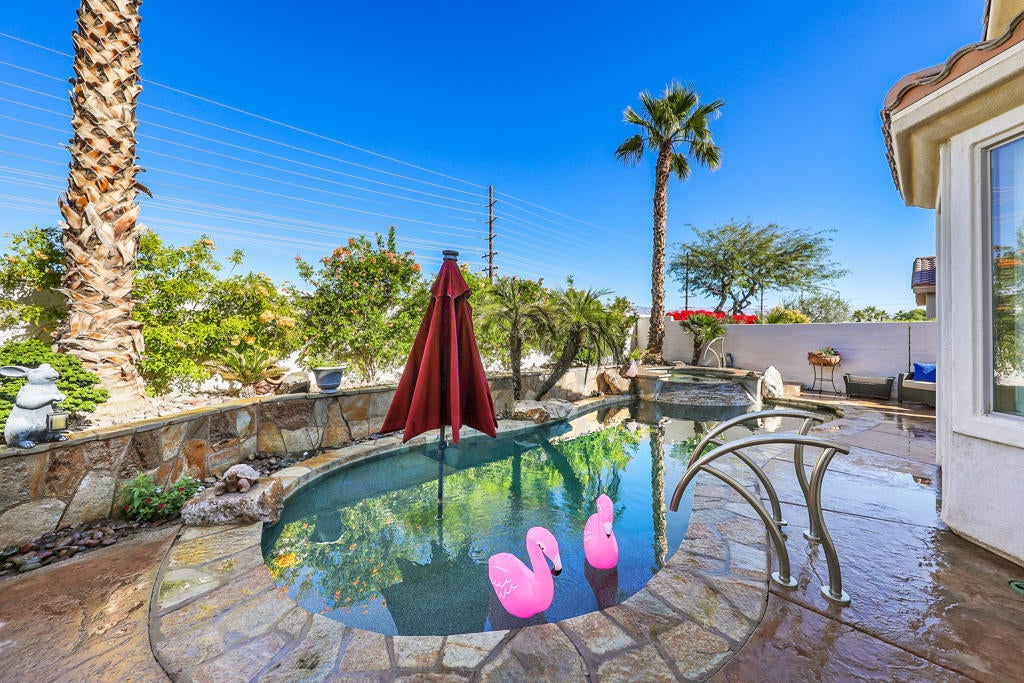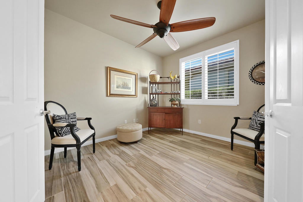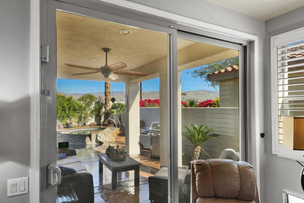 This San Vicente model offers 2BD/2BA plus a den, providing a comfortable and versatile layout suited for everyday living. Tile flooring runs throughout the home, creating a clean and cohesive finish with no carpet. The kitchen features updated quartz counters for both durability and a polished appearance. The living area includes a welcoming fireplace, adding warmth and character to the space. The primary suite is appointed with a generous walk-in closet and private bath, while updated ceiling fans throughout the home support year-round comfort. The garage features epoxy flooring and a swamp cooler, making it ideal for projects or additional workspace. The backyard presents a private pool and spa framed by open views--an inviting setting for relaxation or casual gatherings. Sun City Shadow Hills further enhances the lifestyle with two clubhouses, a fitness center with indoor and outdoor pools, bocce courts, billiards, lighted tennis courts, an 18-hole golf course, a restaurant, and numerous social clubs and activities. A wonderful opportunity to enjoy a well-cared-for residence in a community appreciated for its recreation, comfort, and welcoming atmosphere.