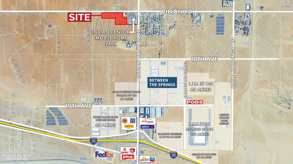 Ideally located just north of I-10 at Indian Canyon Drive just outside the city limits of Palm Springs and Desert Hot Springs. In the Sphere of Influence of Palm Springs. Excellent visibility on Dillon Rd. Prime growth area just north of Amazon's new 650,000+ sq. ft. distribution center currently under construction. First eastbound interchange for the Coachella Valley. Just 6 miles from Palm Springs International Airport.