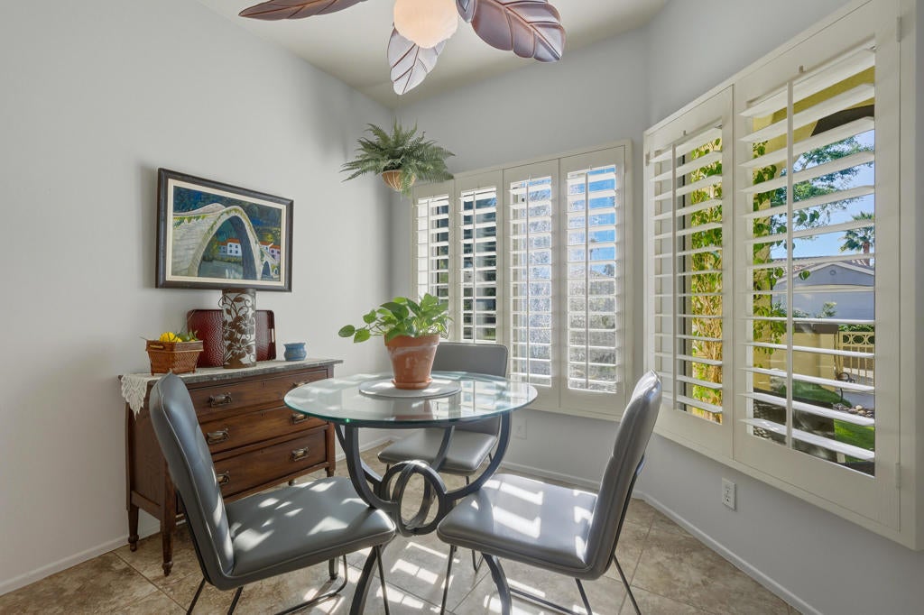 Sun City Palm Desert - Topaz. This beautifully appointed home is located in one of Sun City's most desirable neighborhoods, where the HOA maintains the common-area landscaping, stucco, and roof for truly carefree living. Ideally situated just a short distance from both the Mountain View and Sunset View Clubhouses, the property enjoys easy access to the community's premier amenities. Set along a lush greenbelt, the home's north-facing rear patio offers a tranquil space for relaxing or entertaining while enjoying the natural surroundings. The gated, south-facing front courtyard enhances curb appeal with additional patio space and low-maintenance artificial turf. Inside, the home features tile and luxury vinyl plank flooring throughout, complemented by plantation shutters, transom windows, and Solatubes that fill the space with natural light. The kitchen boasts granite countertops, a breakfast bar with pendant lighting, and upgraded sink and fixtures. The primary suite includes a charming bay window, a walk-in closet with built-in storage, and mirrored wardrobe doors. Its en-suite bathroom offers a granite-topped vanity with upgraded dual sinks and fixtures, along with a stall shower framed by a glass enclosure. The guest bathroom features a tub/shower combination and an upgraded vanity with granite counters. A spacious guest bedroom and a two-car garage with built-in storage complete this exceptional home.