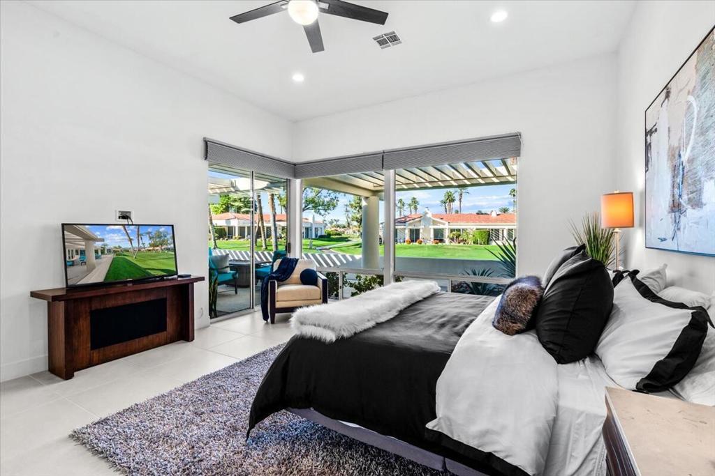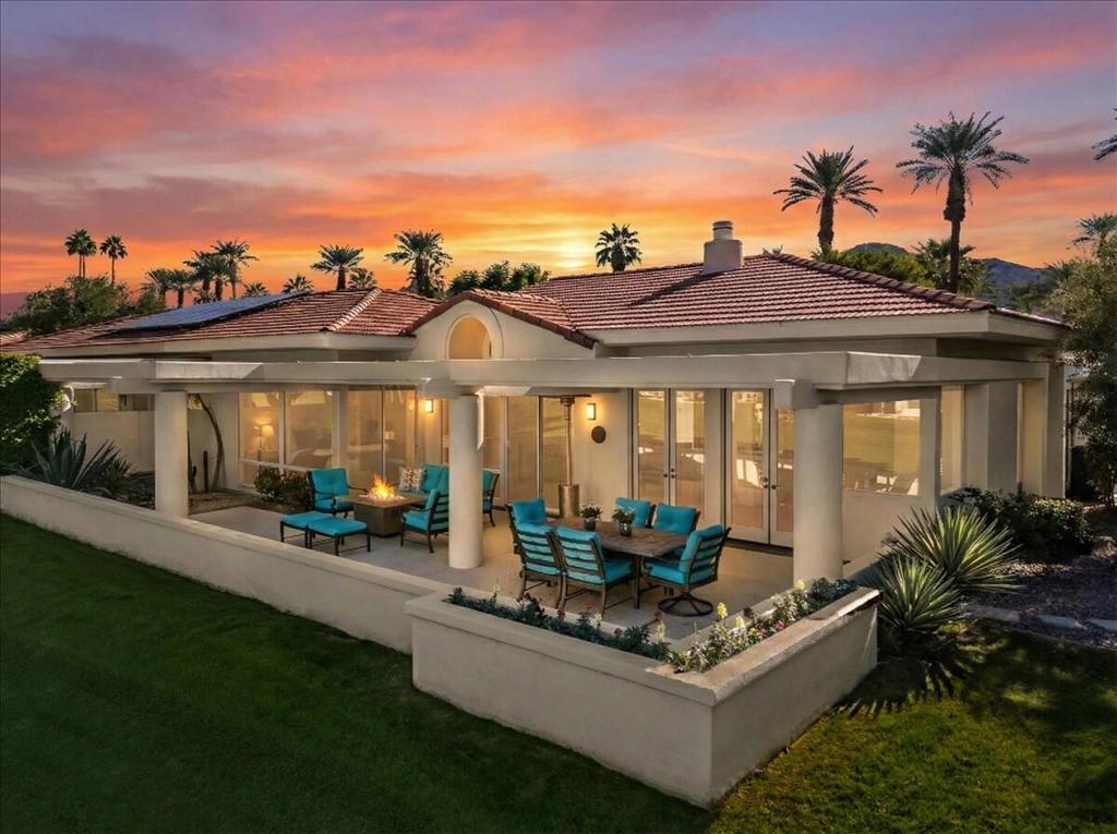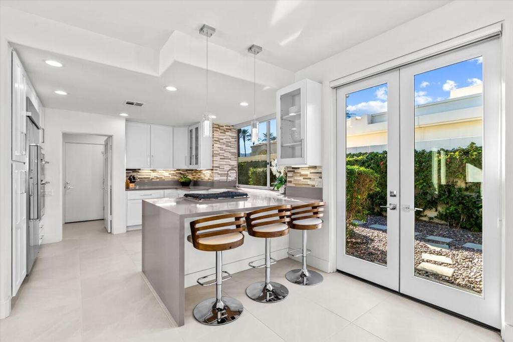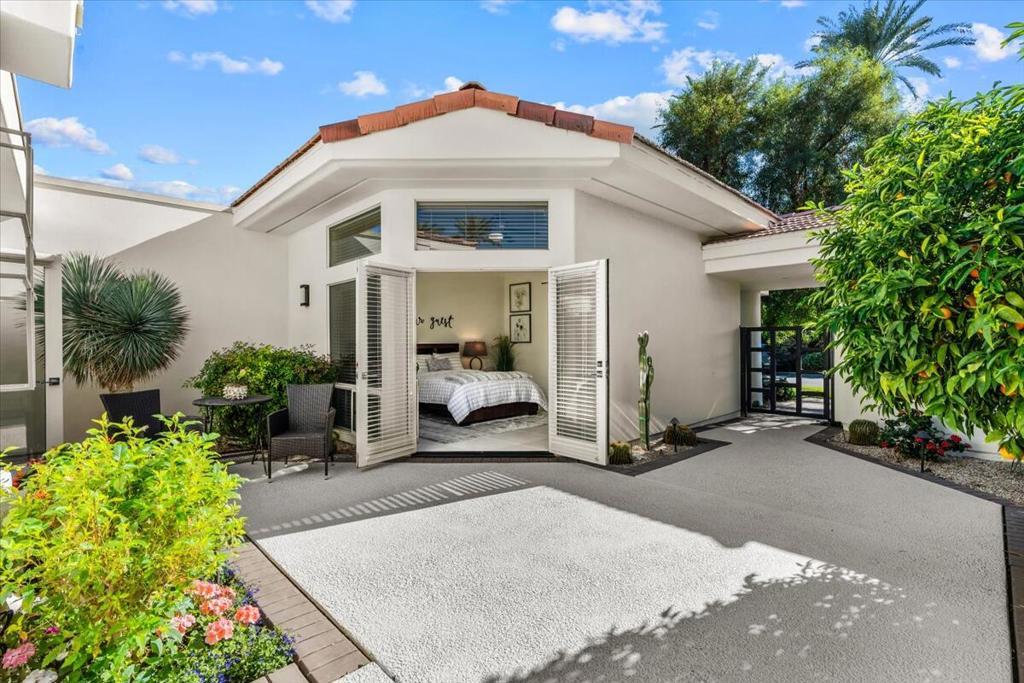 Fairway and mountain views are yours from this spectacular, completely remodeled 3 bedroom/3 bath partially furnished solar home situated on the 18th hole. Designed with chic modern finishes, neutral tones, and custom upgrades throughout, this bright and airy residence blends contemporary style with relaxed desert living. Enter through an enclosed, landscaped courtyard, which offers a private entrance to the casita, and step through glass doors into a grand open concept with defined spaces for the living room (anchored by a fireplace), formal dining, family room, and wet bar. An upgraded kitchen features stainless steel appliances, white shaker cabinetry, a farmhouse sink, quartz counters, and a stylish backsplash. The luxurious primary suite offers quartz counters, a spa tub, subway-tiled shower, and his-and-her closets. A second guest room features French doors leading to the patio, while the separate casita includes its own en-suite bath with a barn door entry. The expanded rear patio provides both outdoor dining and lounge seating, all framed by tremendous golf-course and mountain vistas. Move-in ready with modern furnishings, tile flooring throughout, upgraded bathrooms, new fixtures, and solar, this home truly checks all the boxes.