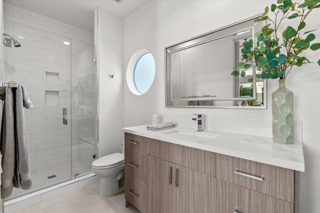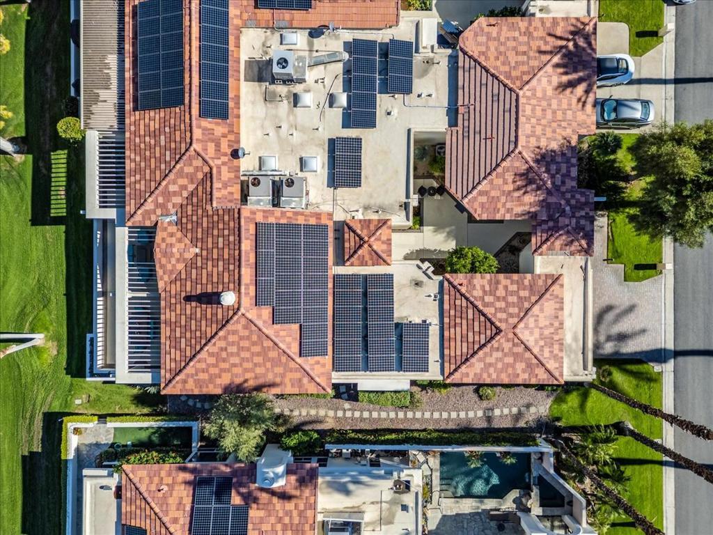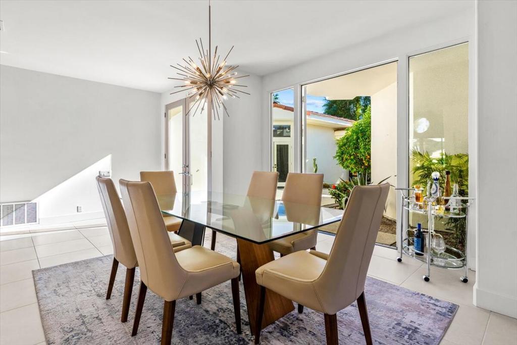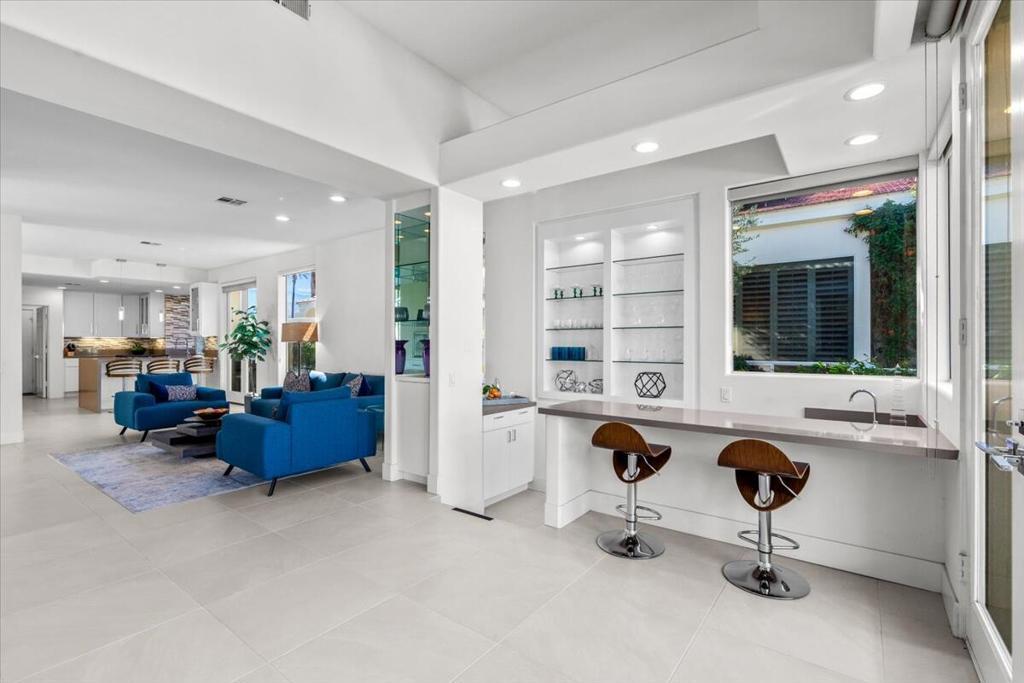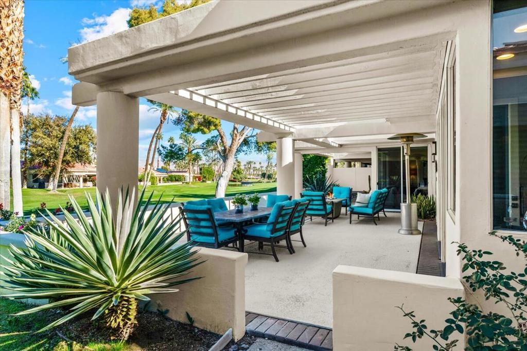 Fairway and mountain views are yours from this spectacular, completely remodeled 3 bedroom/3 bath partially furnished solar home situated on the 18th hole. Designed with chic modern finishes, neutral tones, and custom upgrades throughout, this bright and airy residence blends contemporary style with relaxed desert living. Enter through an enclosed, landscaped courtyard, which offers a private entrance to the casita, and step through glass doors into a grand open concept with defined spaces for the living room (anchored by a fireplace), formal dining, family room, and wet bar. An upgraded kitchen features stainless steel appliances, white shaker cabinetry, a farmhouse sink, quartz counters, and a stylish backsplash. The luxurious primary suite offers quartz counters, a spa tub, subway-tiled shower, and his-and-her closets. A second guest room features French doors leading to the patio, while the separate casita includes its own en-suite bath with a barn door entry. The expanded rear patio provides both outdoor dining and lounge seating, all framed by tremendous golf-course and mountain vistas. Move-in ready with modern furnishings, tile flooring throughout, upgraded bathrooms, new fixtures, and solar, this home truly checks all the boxes.