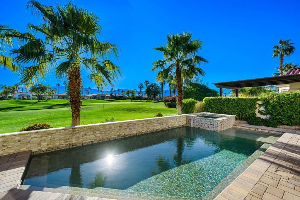 South Views & Private Pool! GOLF Membership available to Buyer with NO wait! Experience desert luxury living at Indian Ridge Country Club in Palm Desert CA in this Ocotillo 3G model with private saltwater pool and spa and spectacular south-facing fairway and mountain views. Additional highlights include a pavered driveway, walkways and patio, Owned Solar, and newer HVAC systems, delivering enhanced efficiency and comfort. Offered for the first time on the resale market, this popular floor plan features 4 bedrooms and 4.5 bathrooms, including an attached 1-bedroom, 1-bath Casita - ideal for guests, extended family, or a private office. This home is ideally positioned overlooking the #2 and #3 fairways of the Arroyo Course, one of two Arnold Palmer Signature golf courses at Indian Ridge CC. The professionally designed landscaping frames the resort-style outdoor living space, complete with a saltwater pool and spa, fire feature, and built-in BBQ, creating an exceptional setting for entertaining or relaxing while enjoying the expansive south golf course and mountain views. Inside, the gracious foyer opens to a sun-filled living room and centrally located wet bar for a seamless indoor-outdoor flow to the fairway patio. A space often used as a formal dining room has been thoughtfully reimagined as a library/den with built-in bookshelves, offering flexibility for today's lifestyle. The family room and open kitchen offer beautiful views and direct access to the BBQ and patio area. The Kitchen features a large center island, counter seating, and walk-in pantry, making it functional and inviting. The Primary Suite offers ample space for a sitting area and features a spa-style ensuite bath with dual vanities, two large walk-in closets, and a separate tub and shower. Two additional ensuite guest bedrooms in the main residence are thoughtfully separated to ensure privacy and comfort. The attached 1-bedroom/1-bath Casita, accessed from the front courtyard, provides a private retreat for visitors. The two-car garage plus golf cart garage provides direct access into the home. Indian Ridge Country Club amenities include two Arnold Palmer Signature golf courses, tennis and pickleball courts, a state-of-the-art fitness center, full-service spa, multiple restaurants, 38 pools and spas, and a vibrant social calendar. Come Join the Fun!