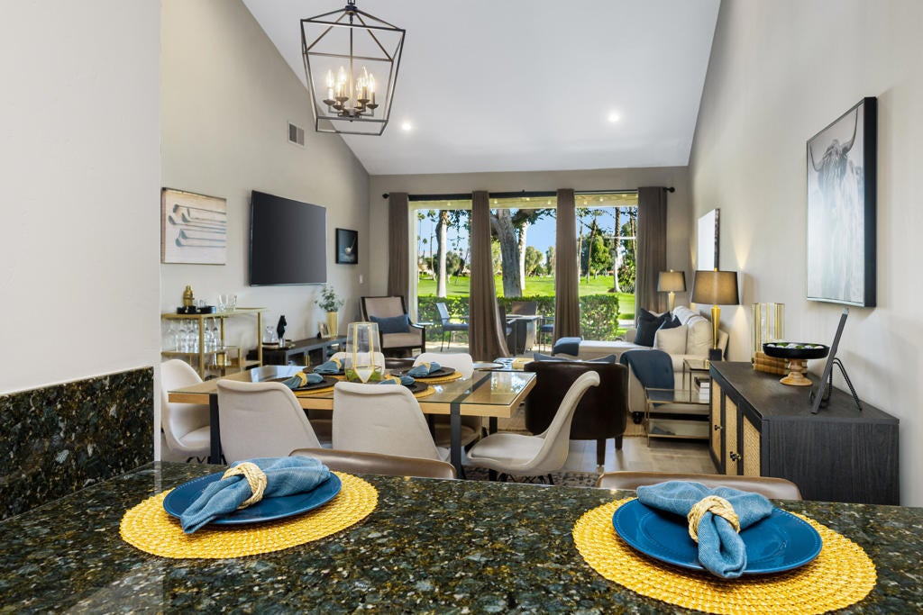 You won't want to miss this beautifully updated 2-bedroom, 2-bath condo in Monterey Country Club with spectacular golf course and water view. New recessed lighting throughout. New paint, new kitchen sink, new toilets, new mirrors, new fixtures. Stainless steel appliances, granite counters, and new upgraded tile flooring. Private front courtyard with low-maintenance landscaping. Country Club features private golf course, tennis, pickleball, gym, and clubhouse. SHORT-TERM rentals allowed--making this the perfect full-time home, seasonal retreat, or income-producing property! Monterey Country Club offers: 27 holes of golf, 13 tennis courts, 20 pickleball courts, bocce ball courts, 37 pools & spas, and clubhouse & fitness center. All just minutes from El Paseo shopping, fine dining, hiking, Palm Springs Airport, and more. Don't miss this rare opportunity--schedule your private showing.