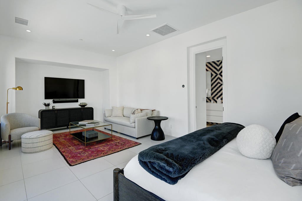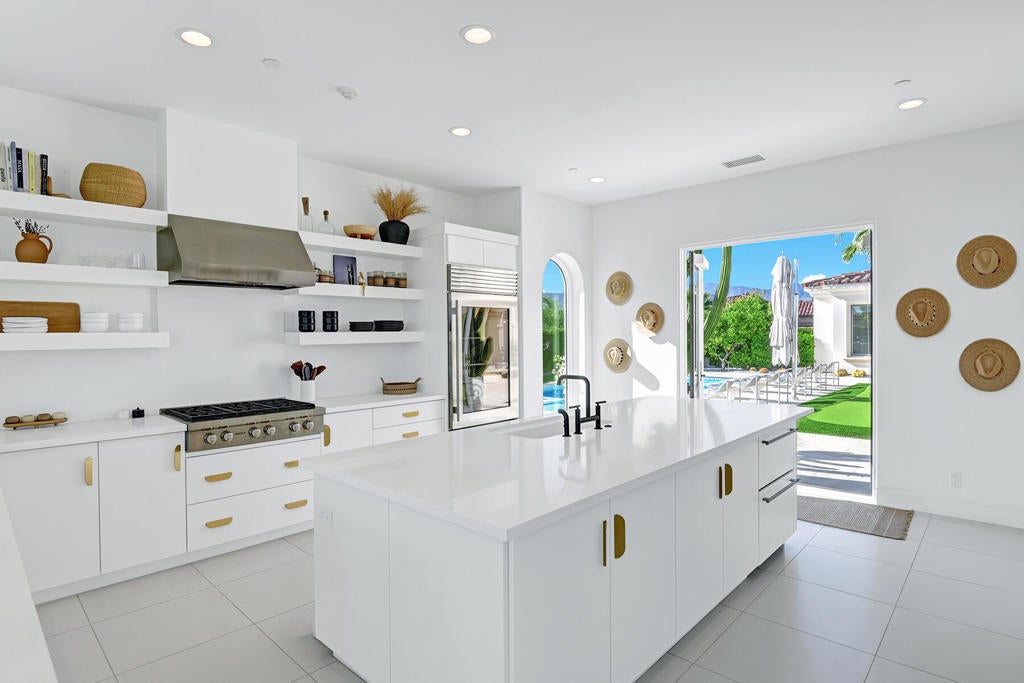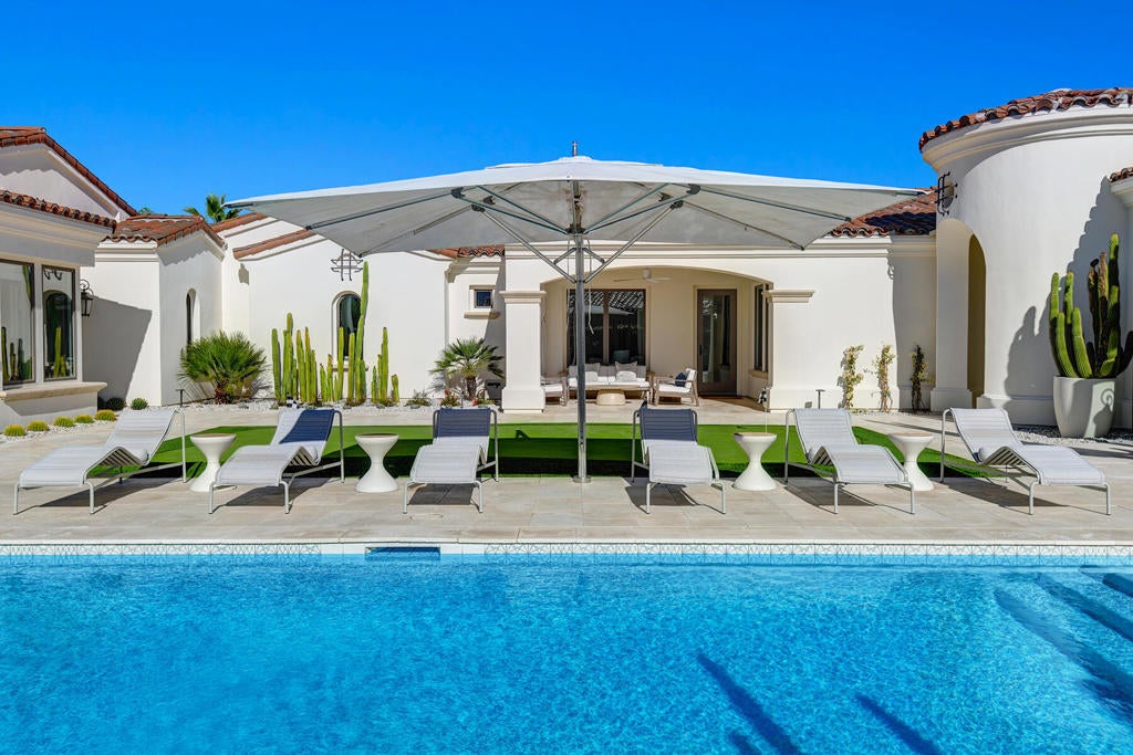 Step into a world of unparalleled luxury the moment you arrive. Behind the gates of Toscana CC on an oversized 1/3 + acre lot, this fully remodeled contemporary masterpiece commands sweeping unobstructed mountain & multiple fairway views from an elevated position off the 10th hole of Jack Nicklaus Signature North course. Owned solar w/ battery backup, multiple resort-style entertaining patios, & meticulous high-end finishes define a lifestyle of privacy, sophistication, & effortless desert sanctuary. A dramatic, oversized Travertine courtyard sets the tone, instantly immersing you in a private resort experience. Southern exposure highlights the pool & spa, Tuuci umbrella, BBQ cook station, putting green, & lush landscaping--all complemented by serene mountain views, creating effortless outdoor living. The backyard offers a second, equally stunning entertaining space w/ Travertine patio, sunken fire pit, & expansive views across multiple fairways to the surrounding mountains. Inside, the home has been completely transformed through a meticulous luxury remodel, achieving a light-filled, modern aesthetic. Porcelain tile flooring, Lutron LED lighting, & walls of glass flood the home w/ natural light. A custom glass front door frames the views beyond, while a sleek modern fireplace & floor-to-ceiling Fleetwood sliding pocket doors dissolve the boundary between indoors & out. The great room is designed for entertaining, wet bar flows seamlessly into the dining area & gourmet kitchen. Quartz countertops, top-tier commercial-grade appliances, a glass-front Sub-Zero refrigerator plus dual under-counter refrigeration drawers, & a dedicated wine fridge elevate the space to true chef's caliber. The home offers 3,622 sqft w/ 4 bedrooms & 4.5 baths--all ensuite--including a private guest house. The primary suite is a serene retreat w/ direct patio access & panoramic views, complemented by a spa-like bath including makeup vanity & a custom walk-in closet. All ensuites feature Quartz countertops & designer wall tile to complete the look. Additional highlights include a custom mudroom organizer off the laundry room & an air-conditioned 2 car garage plus golf cart garage w/ epoxy floors & EV charger hookup. Built in 2017, the move in residence seamlessly blends modern construction w/ the sophistication of a meticulous luxury renovation & energy-efficiency in one of Indian Wells' most coveted enclaves, just moments from premier shopping, fine dining, & world-class amenities.
