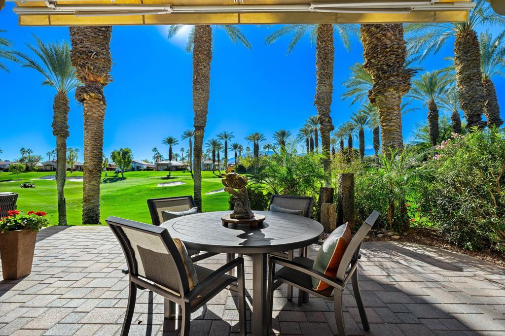 Nestled at the end of a peaceful cul-de-sac, this totally remodeled, south-facing residence with no steps captures the very best of desert living with stunning year-round light and exceptional outdoor comfort. A pavered driveway and walkway lead you to a beautifully reimagined interior, where large-format tile flooring flows throughout, enhancing the home's spacious, modern feel. The newly installed windows frame breathtaking mountain views and showcase the pristine Arnold Palmer Grove Course, Hole #12, creating an extraordinary backdrop from morning to sunset.Inside, the upgraded kitchen features sleek stainless steel appliances, refined cabinetry, and stylish finishes ideal for both entertaining and everyday ease. Step outside to expansive patios enhanced with custom awnings, perfect for relaxing or hosting while enjoying the warm southern exposure and sweeping golf-course views. Every detail has been elevated, including an epoxy garage floor, tankless water heater, and comprehensive remodeling throughout that brings a fresh, contemporary elegance to every room.Offered fully furnished/inventory, this home is move-in ready and includes a lithium-battery golf cart, adding both convenience and lifestyle appeal. Whether you're taking in the dramatic scenery, enjoying quiet evenings on the patio, or heading straight out for a round of golf, this exceptional property delivers the ideal blend of luxury, comfort, and location--an immaculate desert retreat designed for effortless living. Club membership available with no wait.