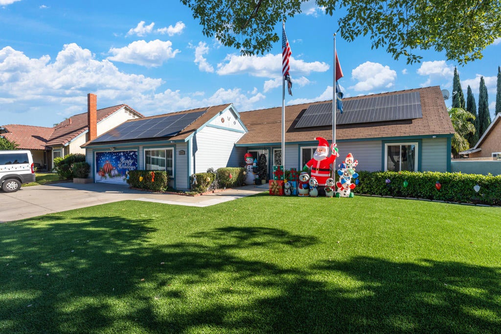 This well-maintained 3-bedroom, 2-bathroom home is located in a quiet neighborhood with convenient access to the 210 and 10 freeways. The home features modern upgrades throughout, including stainless steel appliances, recently renovated bathrooms, and durable LVP and tile flooring. A spacious laundry room off the kitchen offers ample space and versatility, easily doubling as a crafting room or home office. Additional highlights include a tankless water heater, whole-house water filtration system, reverse osmosis system, and leased solar panels for energy efficiency.Designed with accessibility in mind, the home includes wheelchair ramps for easy entry and a walk-in shower. The primary suite features a walk-in closet and a large bay window that fills the space with natural light. Outdoors, the property boasts high-grade artificial turf in both the front and backyard for low-maintenance living, a large covered patio ideal for entertaining, two Tuff sheds for extra storage, and a greenhouse.