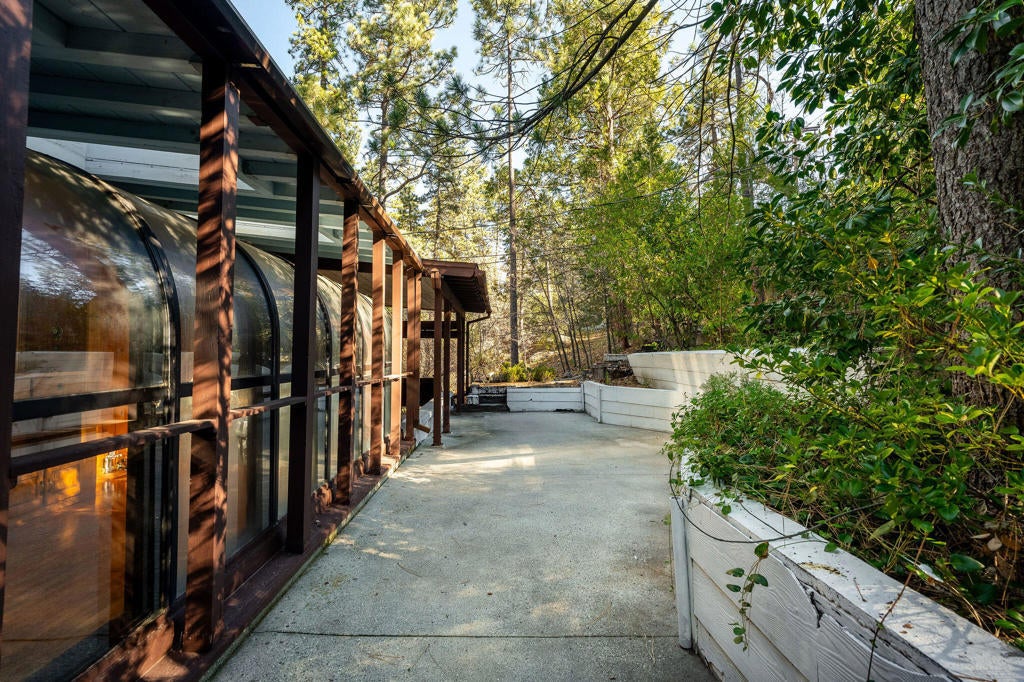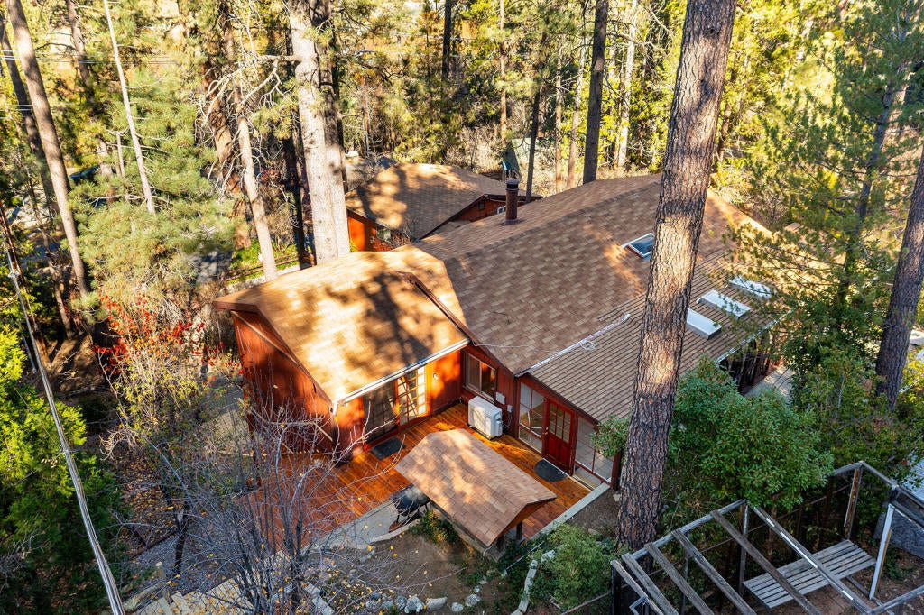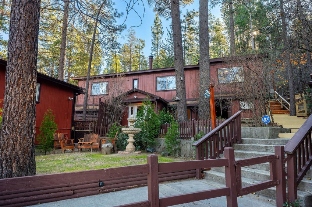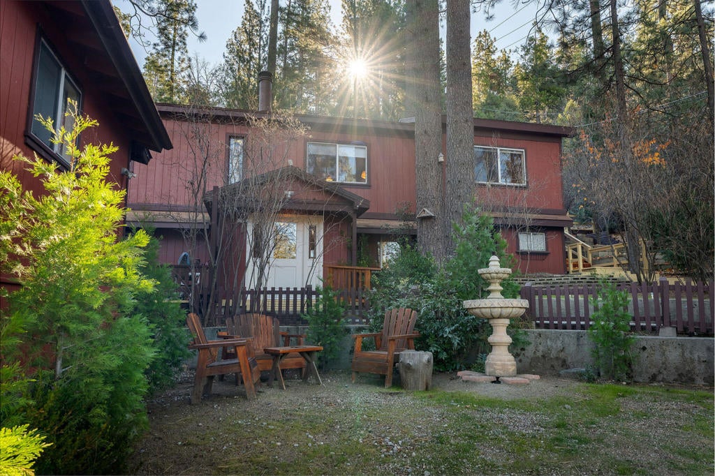 Discover a versatile mountain home offering comfort, flexibility, and income potential. This charming two-story residence features 3 bedrooms and 2 bathrooms with a welcoming living room, an additional room just off the living area ideal for an office or den, and a dining room highlighted by a dramatic windowed ceiling that fills the space with natural light. A bonus indoor-outdoor patio provides the perfect garden room or creative retreat, while a separate covered patio with hot tub hookups invites year-round relaxation. Enjoy outdoor living with a dedicated dog run and an additional patio ideal for entertaining under the mountain sky. The property also includes a detached two-car garage with a permitted one-bedroom rental. Currently rented for $1,250 per month, offering excellent rental income or guest accommodations. Conveniently located near Idyllwild Arts Academy, this property blends mountain lifestyle, functionality, and opportunity in one exceptional setting. Towering trees, fresh mountain air, and a functional layout make this an ideal full-time residence, weekend escape, or investment property with long-term appeal. Ideal for multigenerational living or creative use.