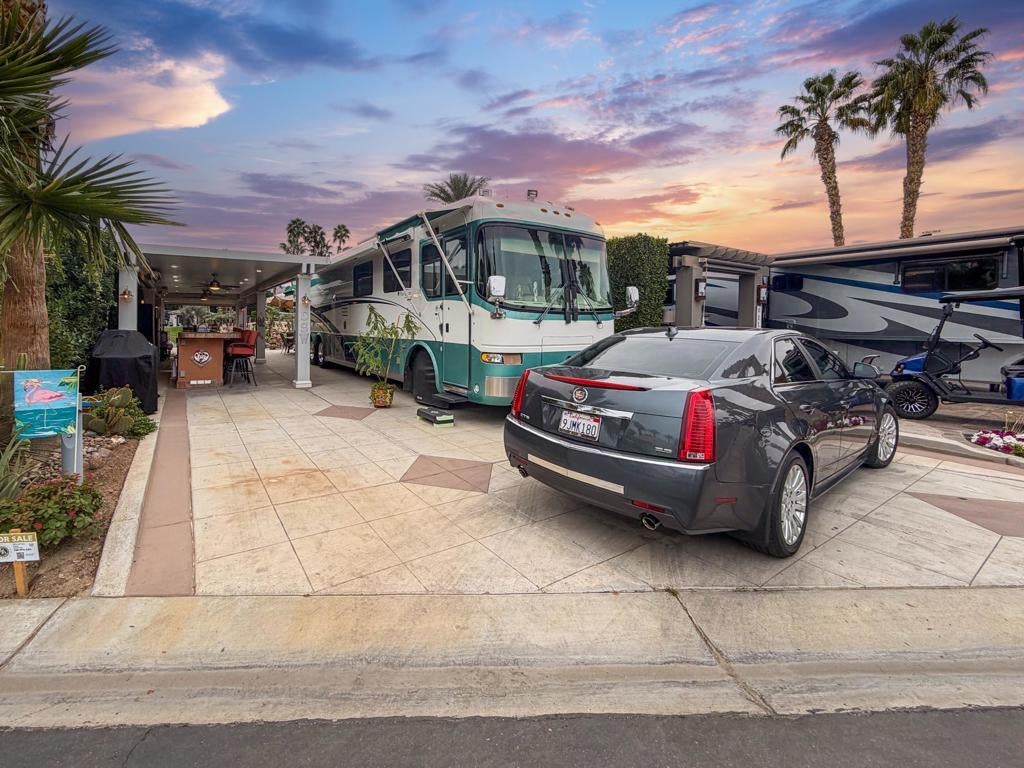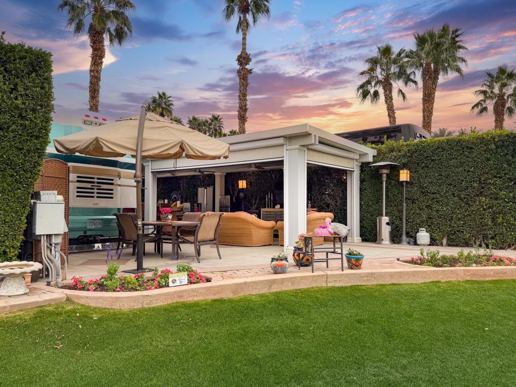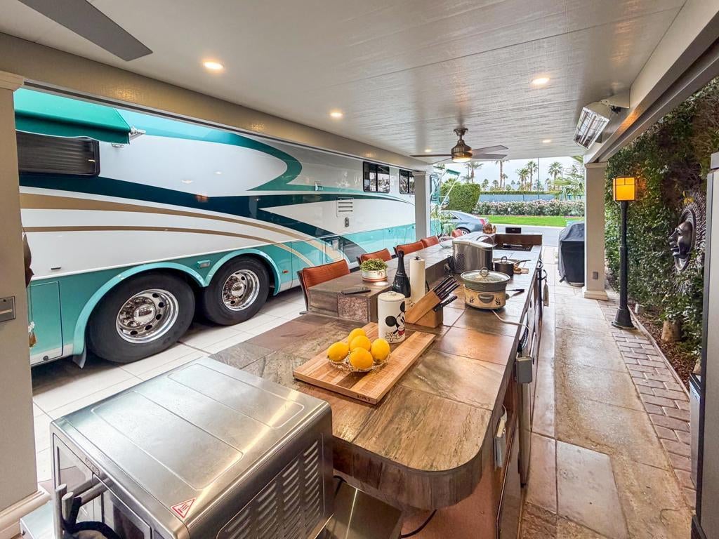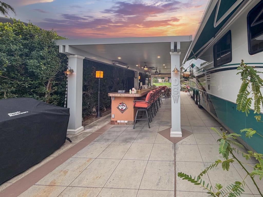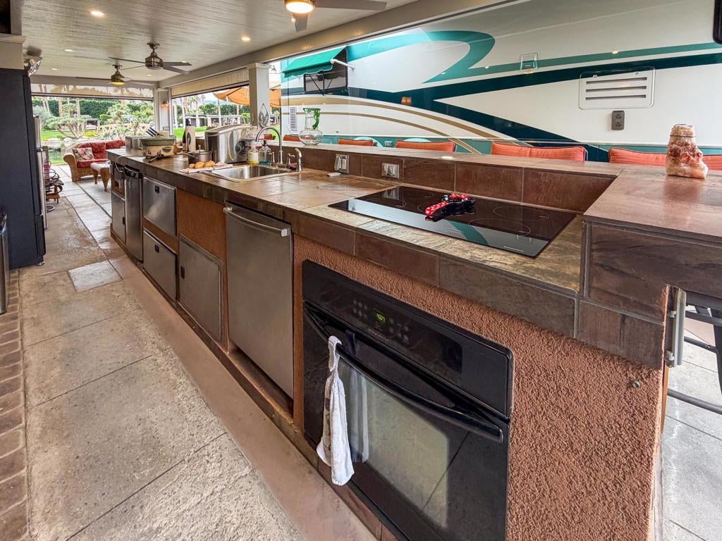 Outdoor Resort Indio is a Class A Motorcoach resort. This is an RV lot. Experience the best of Outdoor Resort Indio living from this beautifully upgraded RV lot featuring one of the most breathtaking sunset views in the entire resort. With a perfect southwest orientation, your private back-porch retreat overlooks the shimmering lake, picturesque bridge, rolling golf course greens, and the dramatic mountain backdrop--an unforgettable setting for evening relaxation and entertaining.The expansive outdoor kitchen is designed for both style and function, offering a long bar with tile countertops, a 5-burner electric cooktop, large sink, oven, dishwasher, under-counter refrigerator, plentiful storage, hot water, and a garbage disposal. It's the ideal setup for hosting friends or enjoying quiet meals with a view.A long solid-roof pergola creates a spacious, shaded living area complete with two wicker sofas, a coffee table, and a large rolling storage cabinet topped with a TV. Two electric privacy screens allow you to close off the space for added comfort. With three ceiling fans and two radiant ceiling heaters, the outdoor living room stays comfortable early or late in the day.Six cushioned bar chairs line the kitchen bar, making this a social hub for gatherings. Behind the coach, a comfortable back-porch seating area with a table and four chairs invites you to take in the incredible views--sunsets, glistening water, and the serenity of the surrounding desert landscape.