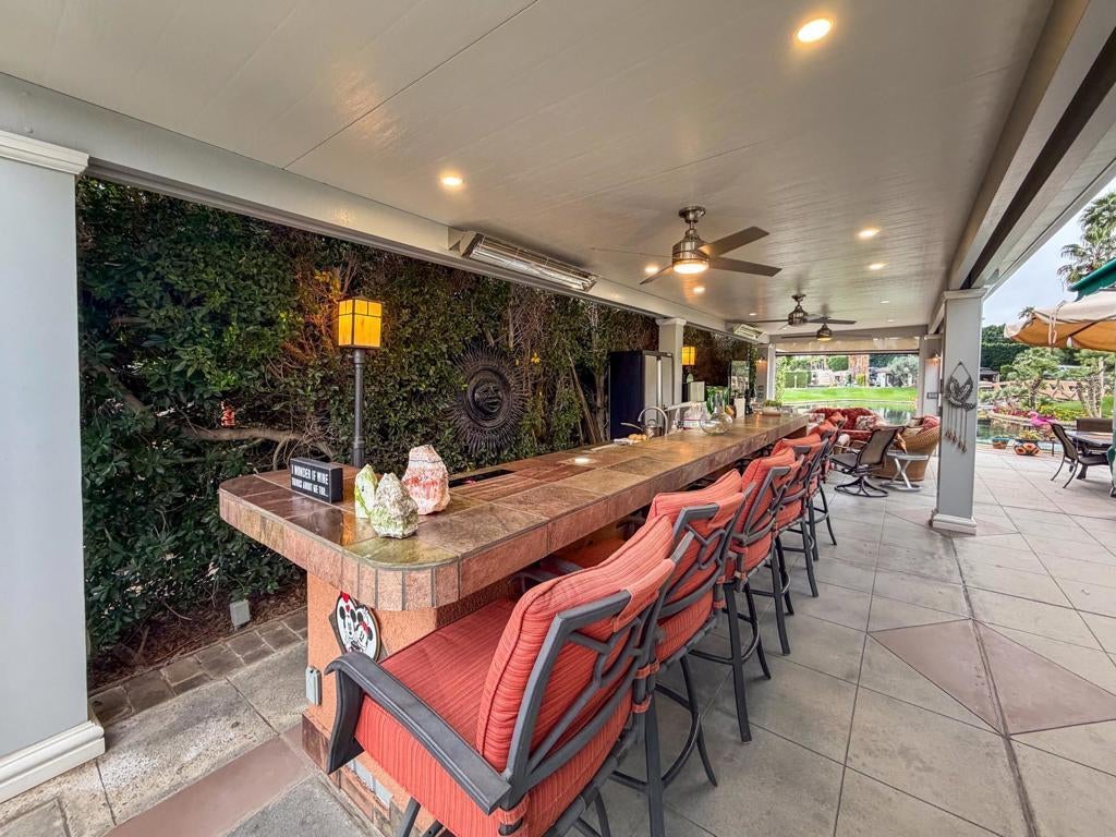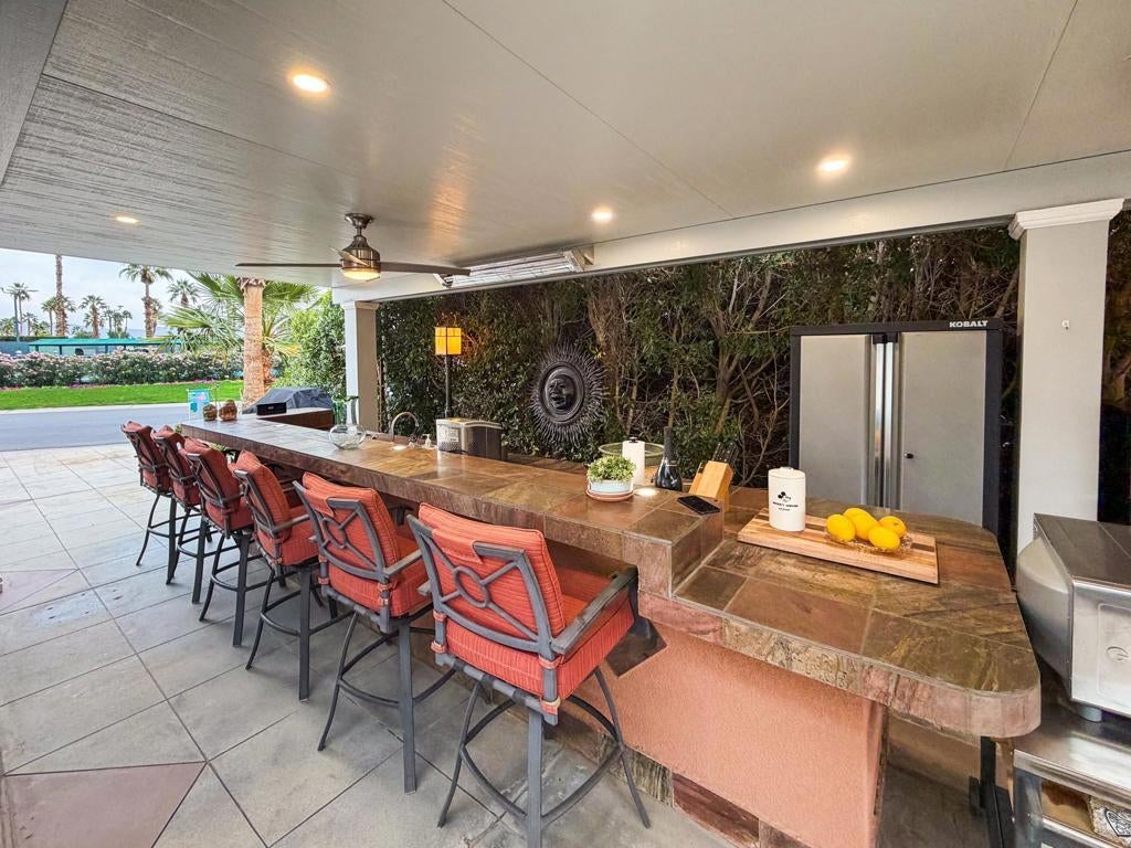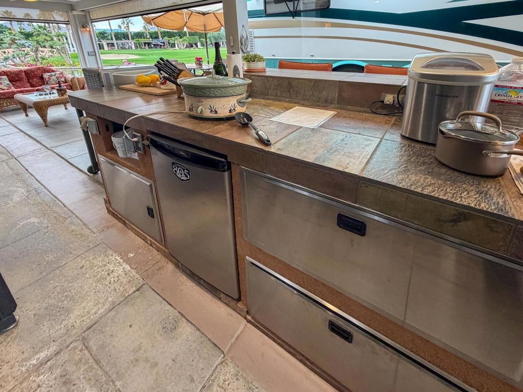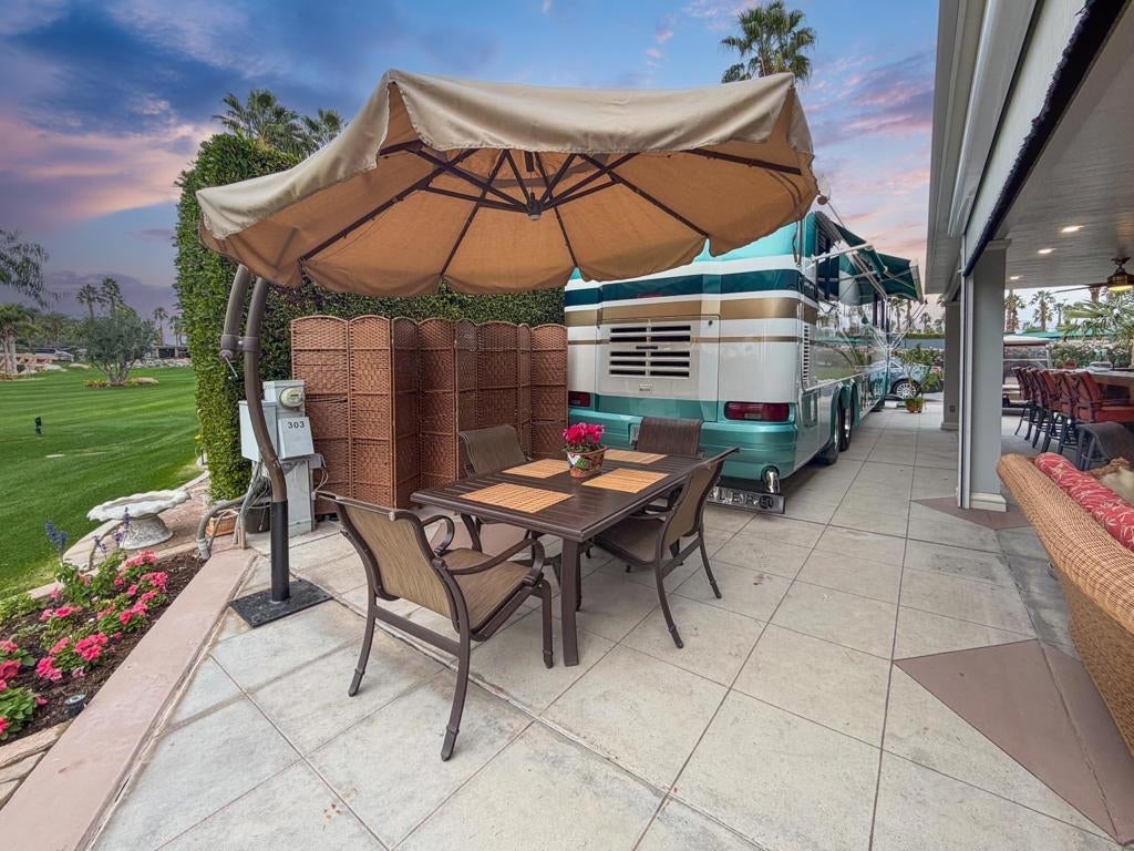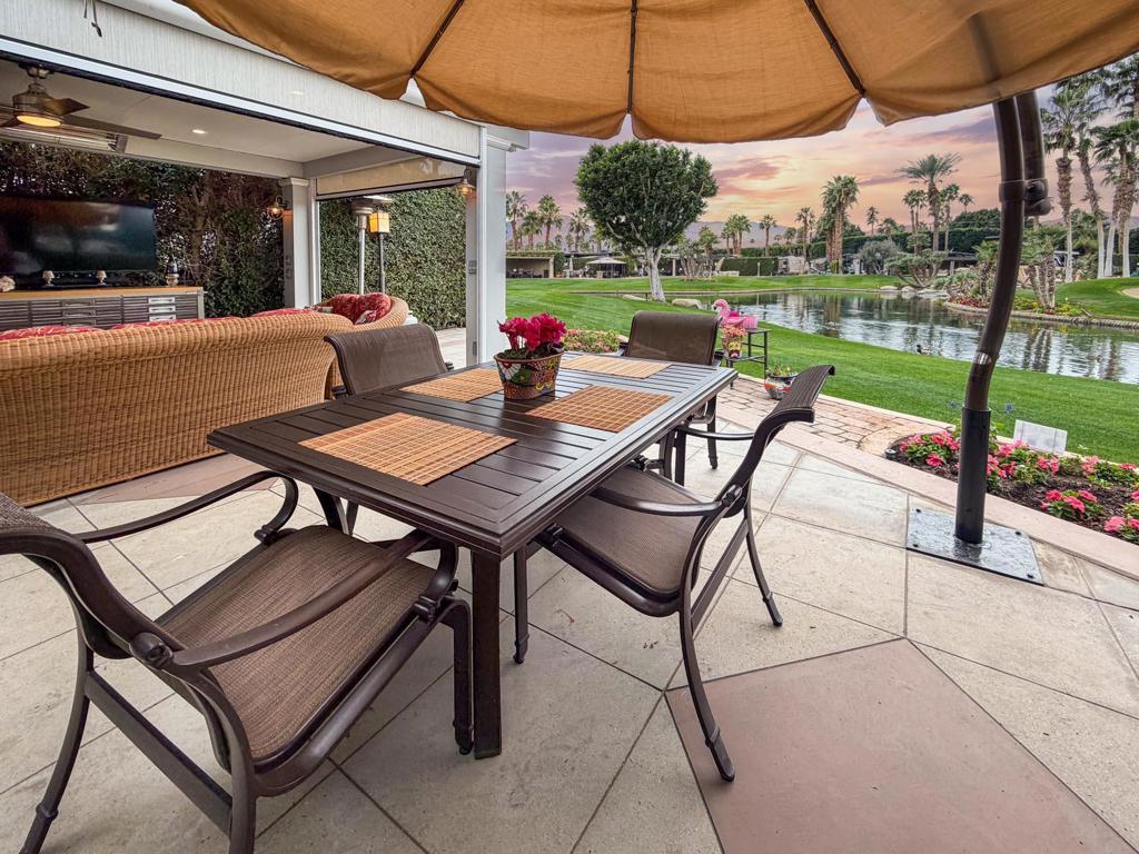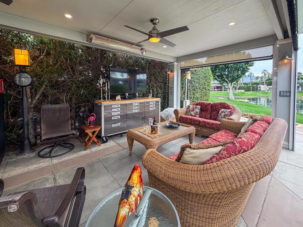 Outdoor Resort Indio is a Class A Motorcoach resort. This is an RV lot. Experience the best of Outdoor Resort Indio living from this beautifully upgraded RV lot featuring one of the most breathtaking sunset views in the entire resort. With a perfect southwest orientation, your private back-porch retreat overlooks the shimmering lake, picturesque bridge, rolling golf course greens, and the dramatic mountain backdrop--an unforgettable setting for evening relaxation and entertaining.The expansive outdoor kitchen is designed for both style and function, offering a long bar with tile countertops, a 5-burner electric cooktop, large sink, oven, dishwasher, under-counter refrigerator, plentiful storage, hot water, and a garbage disposal. It's the ideal setup for hosting friends or enjoying quiet meals with a view.A long solid-roof pergola creates a spacious, shaded living area complete with two wicker sofas, a coffee table, and a large rolling storage cabinet topped with a TV. Two electric privacy screens allow you to close off the space for added comfort. With three ceiling fans and two radiant ceiling heaters, the outdoor living room stays comfortable early or late in the day.Six cushioned bar chairs line the kitchen bar, making this a social hub for gatherings. Behind the coach, a comfortable back-porch seating area with a table and four chairs invites you to take in the incredible views--sunsets, glistening water, and the serenity of the surrounding desert landscape.