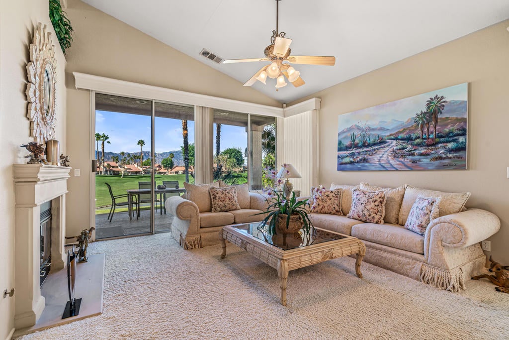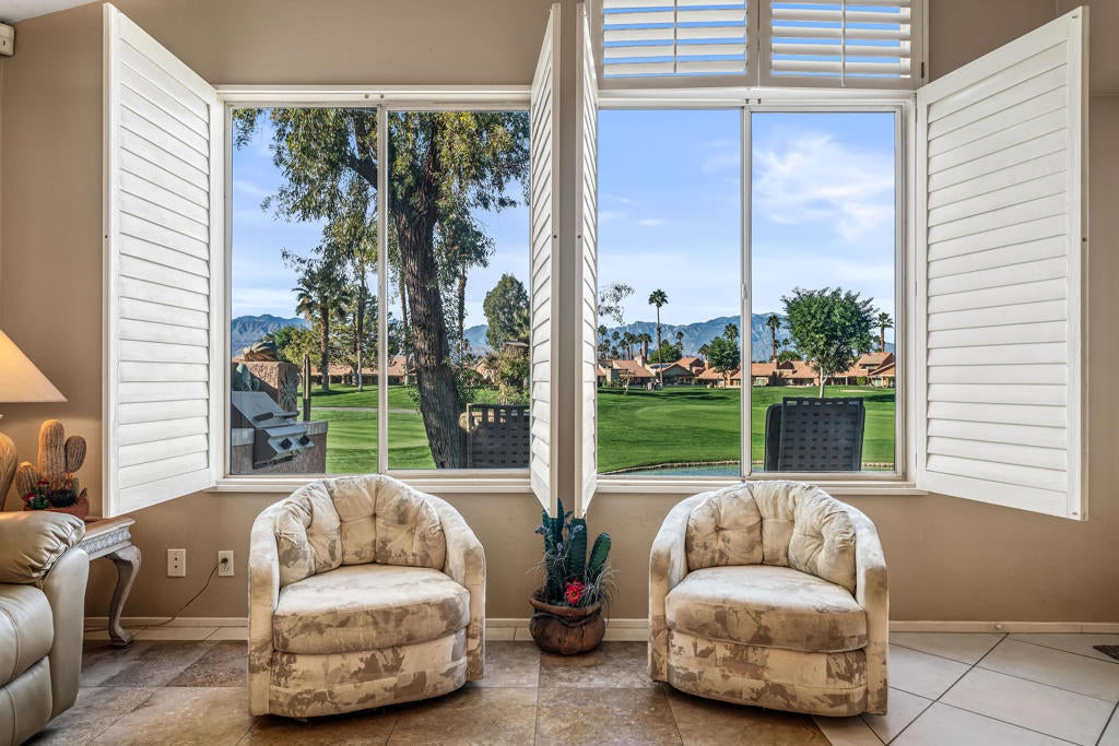 This home features three bedrooms and two bathrooms and is the largest floor plan in the Oasis, providing a spacious and comfortable layout. 3rd bedroom is being used as an office and the other two bedrooms have large walk in closets. Nicely furnished the interior is filled with natural light, with windows that capture the surrounding landscape. The golf course frontage and well designed patio is ideal for both everyday living and entertaining. Golf cart included!! Its prime location within the community provides effortless access to pools, the clubhouse, pickleball courts, and the full range of activities Oasis Country Club is known for. Residents enjoy the amenities, including 18 pools, an 18-hole executive course recognized as one of the finest in California, an 18-hole putting course, a well-appointed pro shop, fitness room, fine dining, and the popular grill room. This is a move-in-ready opportunity in a highly desirable setting--perfect for those seeking comfort, convenience, and an exceptional country club lifestyle.