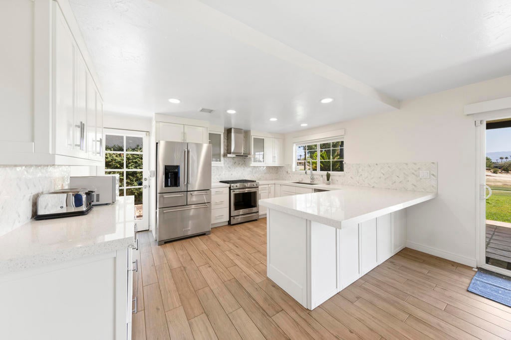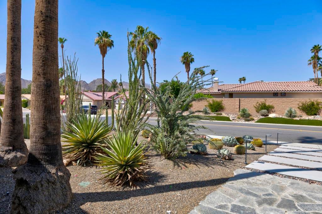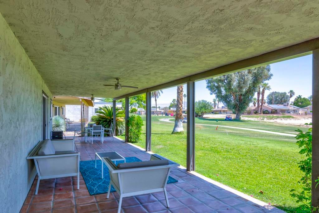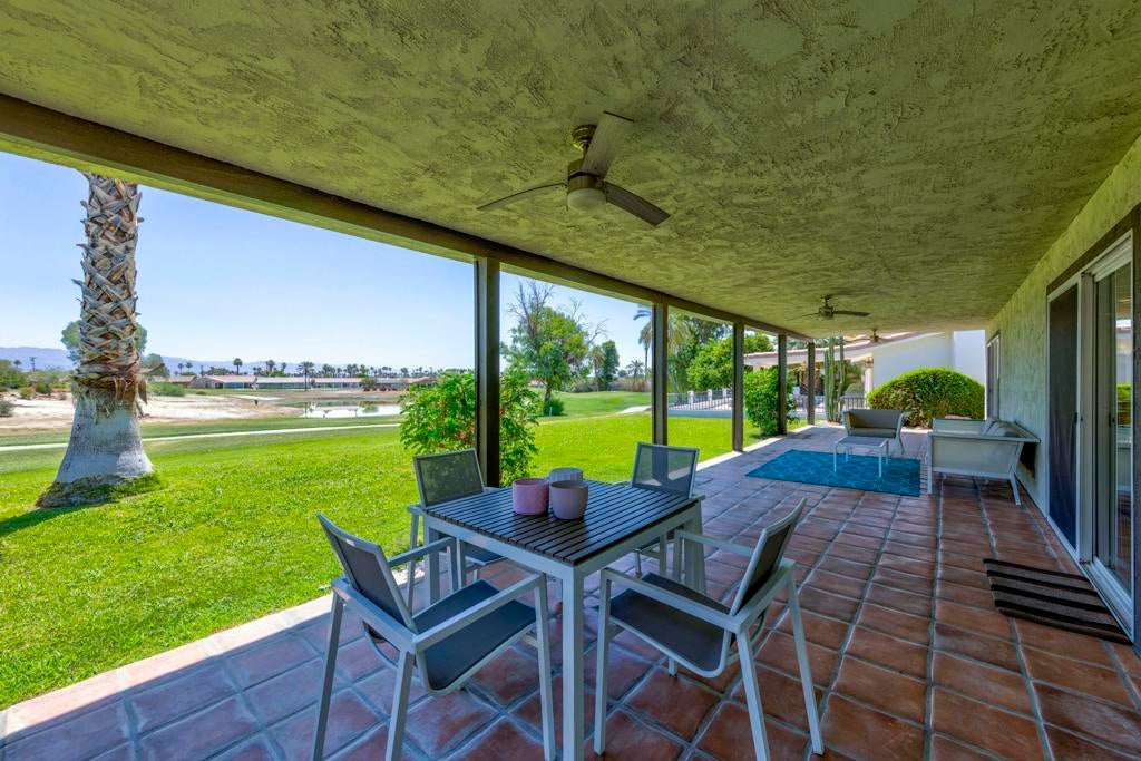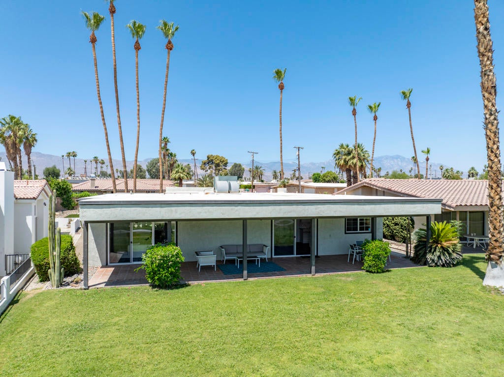 Beautiful Golf Course, Lake, and Mountain Views!! Ideally situated near the Indian Wells Tennis Garden and just minutes from El Paseo's premier dining, shopping, golf, theaters, and excellent schools, including Gerald R Ford Elementary, a 2025 California Distinguished School, this 3-bedroom, 2-bath Palm Desert home blends mid-century charm with thoughtful contemporary upgrades. Set directly on the 16th hole, it offers sweeping views of fairways, water features, and mountains, uninterrupted by power lines. Beautifully emodeled home with an open-concept layout, the light-filled living area flows effortlessly into a stylish kitchen with quartz countertops, custom kitchen cabinets, stainless steel appliances, dining area, and a breakfast bar, perfect for easy entertaining. The spacious primary suite features fresh carpet, custom closet doors, and a sleek en-suite bath. Both bathrooms have designer tile and modern fixtures. Additional highlights include dual-pane windows, new bedroom carpet, custom window treatments with shade screens, a spacious 2-car garage with extra space for a golf cart, bikes, a gym, or a workshop, and roof certification. The back covered patio invites you to relax and take in the serene golf course, water, and mountain views--your own desert retreat! Home is sold partially furnished.