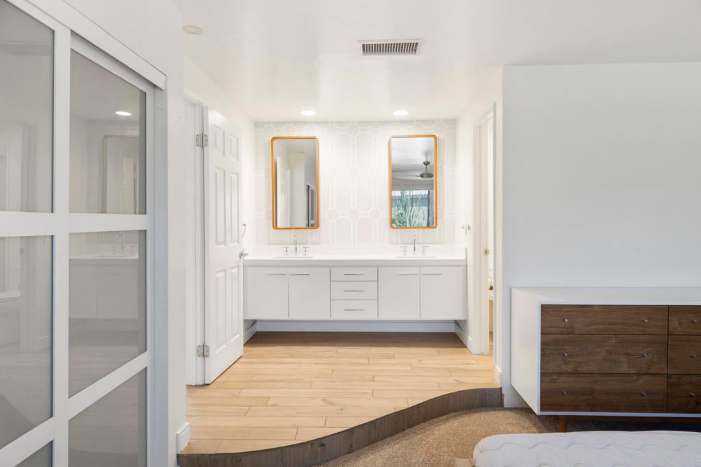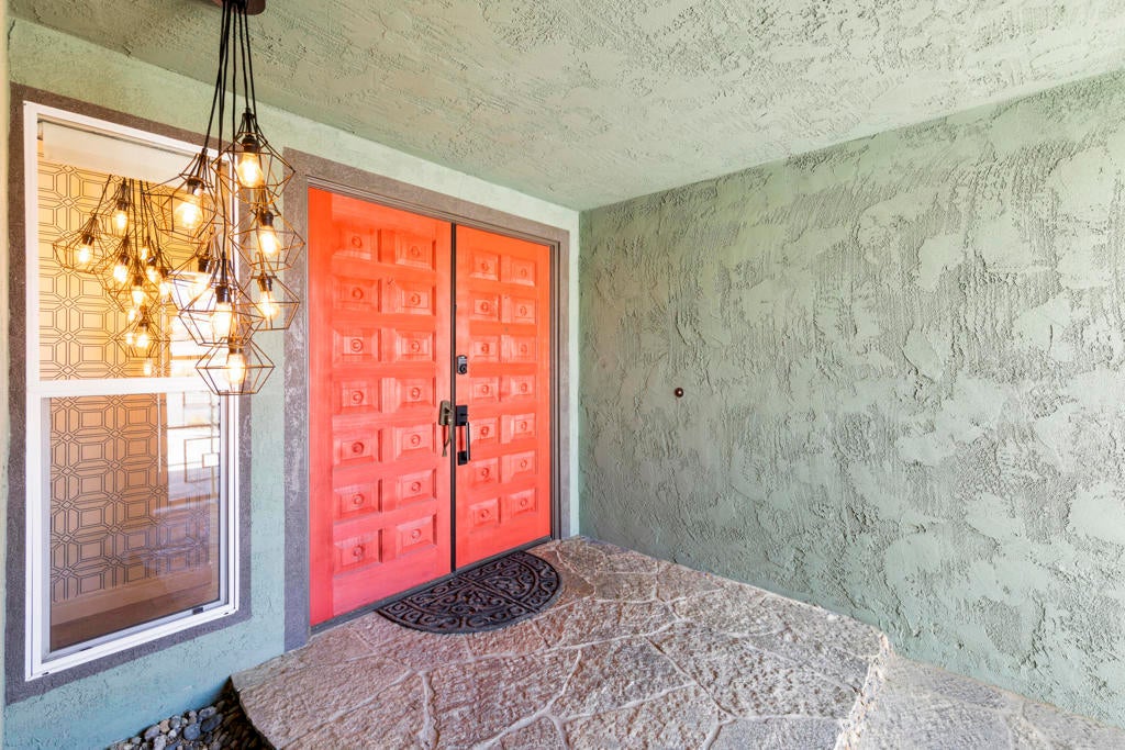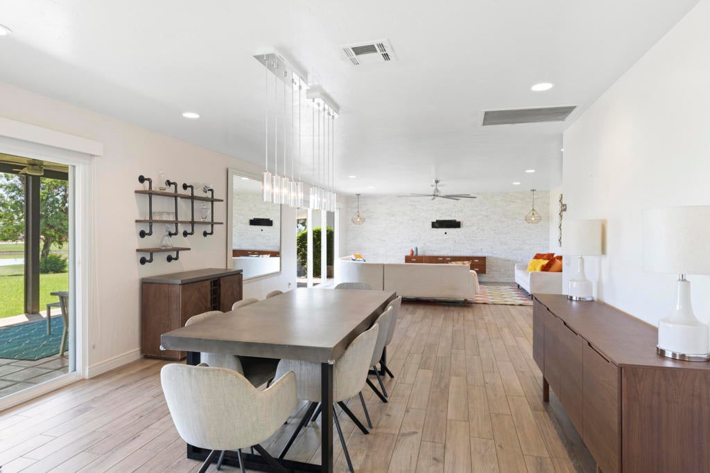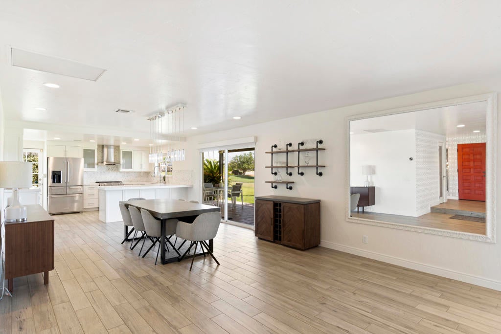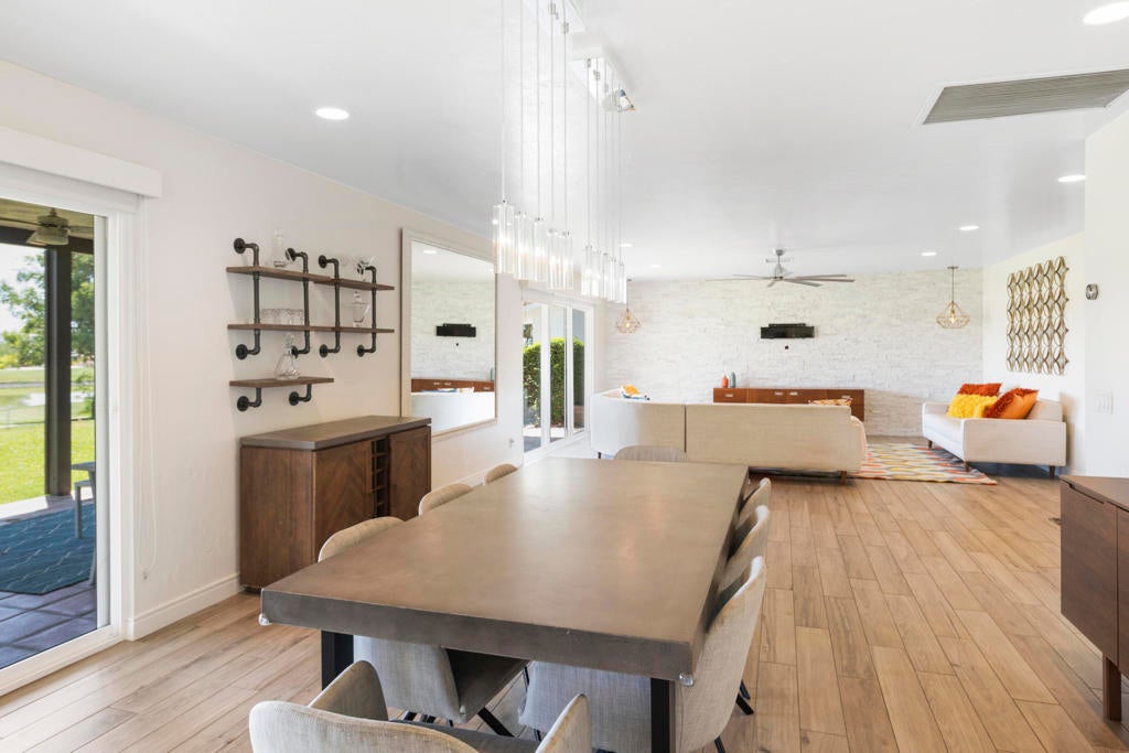 Beautiful Golf Course, Lake, and Mountain Views!! Ideally situated near the Indian Wells Tennis Garden and just minutes from El Paseo's premier dining, shopping, golf, theaters, and excellent schools, including Gerald R Ford Elementary, a 2025 California Distinguished School, this 3-bedroom, 2-bath Palm Desert home blends mid-century charm with thoughtful contemporary upgrades. Set directly on the 16th hole, it offers sweeping views of fairways, water features, and mountains, uninterrupted by power lines. Beautifully emodeled home with an open-concept layout, the light-filled living area flows effortlessly into a stylish kitchen with quartz countertops, custom kitchen cabinets, stainless steel appliances, dining area, and a breakfast bar, perfect for easy entertaining. The spacious primary suite features fresh carpet, custom closet doors, and a sleek en-suite bath. Both bathrooms have designer tile and modern fixtures. Additional highlights include dual-pane windows, new bedroom carpet, custom window treatments with shade screens, a spacious 2-car garage with extra space for a golf cart, bikes, a gym, or a workshop, and roof certification. The back covered patio invites you to relax and take in the serene golf course, water, and mountain views--your own desert retreat! Home is sold partially furnished.