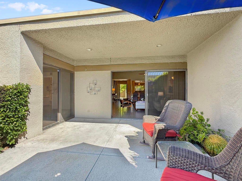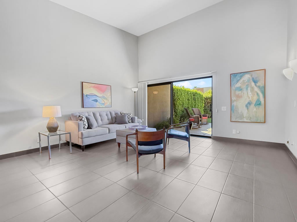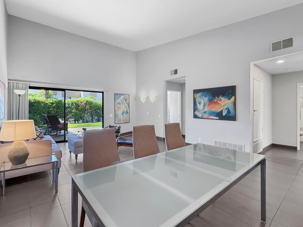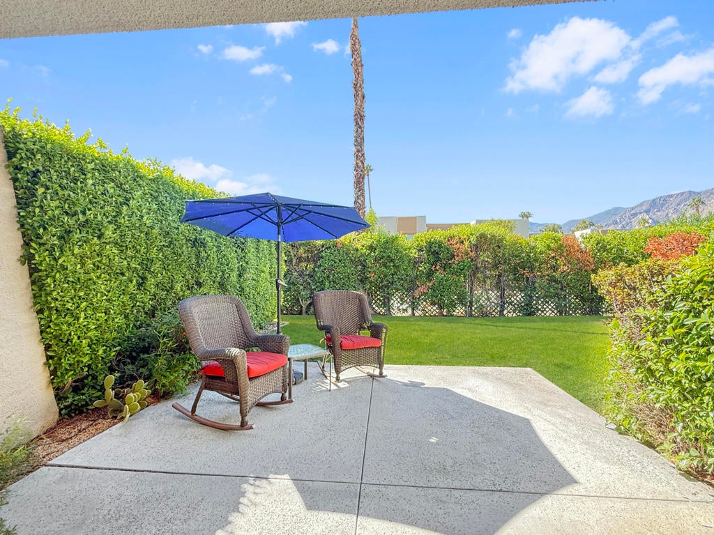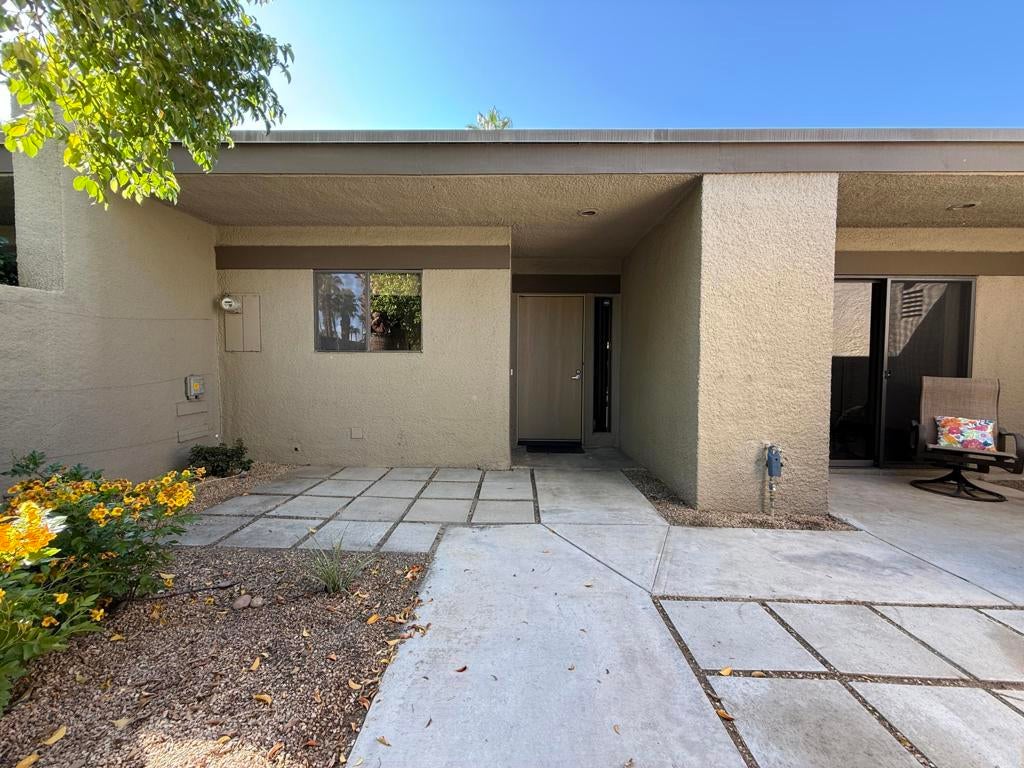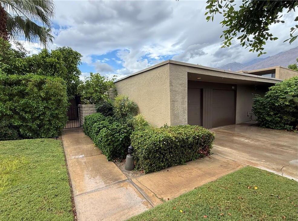 Located in the highly sought-after ''Rose Garden'', this spacious single-level 2-bedroom, 2-bath condo designed by Donald Wexler offers iconic mid-century style and comfort. Set on leased land with an option to purchase and convert to fee ownership ($230,000 approximate buyout cost), this home features a private front courtyard, covered back patio, and lawn area with breathtaking mountain views. Inside, enjoy vaulted ceilings, tile floors throughout, a remodeled kitchen with stainless steel appliances, inside washer/dryer, and an attached garage. The primary suite boasts a spacious bathroom, while the second bedroom--perfect as an office--opens to the private front courtyard. Just steps from community amenities and ideally located near downtown and the airport, this lock-and-leave condo is the perfect Palm Springs getaway for jetsetters or anyone seeking easy, low-maintenance living. The resort-style complex offers 2 pools, 3 spas, 2 tennis courts, and 4 new pickleball courts.