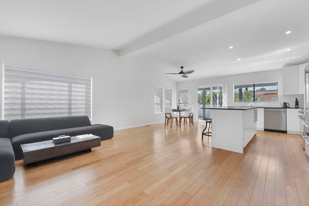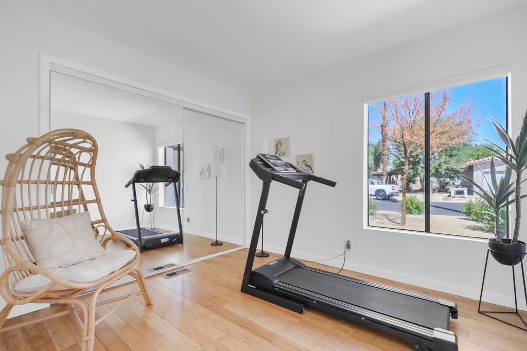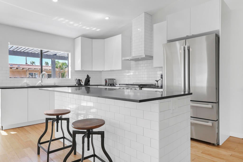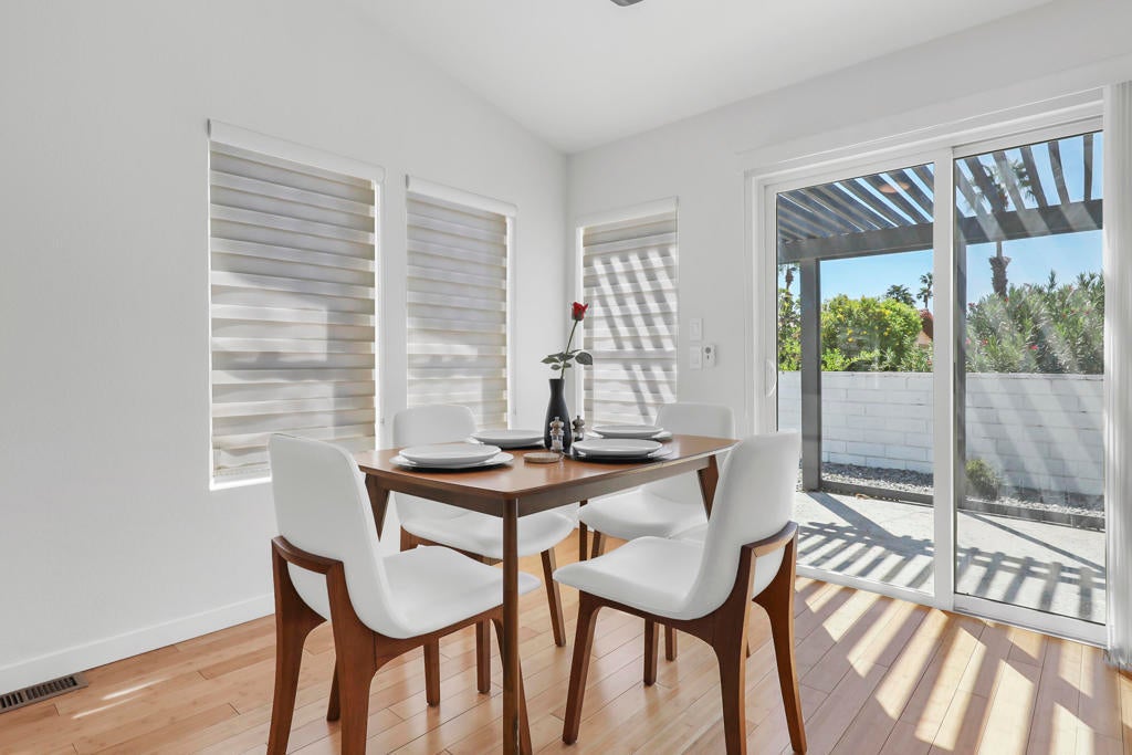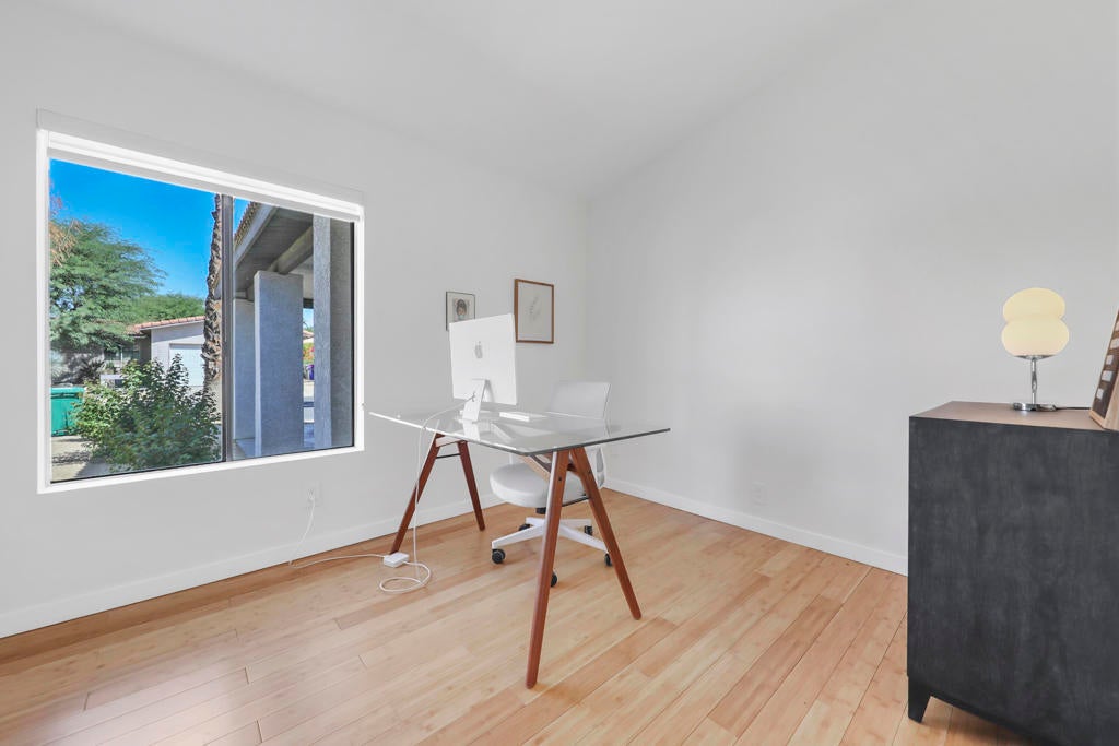 A Special Opportunity!Qualified Buyer may assume Sellers' existing FHA Loan at 4.5% interest rate, subject to lender approval and Seller-Agreed Terms. Beautiful Renovated Mid-Century Modern Palm Desert Home in a convenient gated location. with its owned solar that is already paid for. A customized modern home comprehensively renovated in 2022 with owned solar. Perfect for your desert home or getaway! Inspired by world-class Palm Springs modernism, this home is complete with countless amenities and ready to enjoy as the work has been done! Anchored by beautiful durable bamboo flooring that compliment this sleek property. Whether you are a gourmet cook, a foodie, or just want to enjoy a large sleek expansive kitchen with quality white cabinetry accented by Absolute Honed Black Granite counters said to be the deepest black of all stones with stainless appliances including a professional NRX Gas Stove, large refrigerator, built-in microwave in coordination with large custom island. Gorgeous subway tiled backsplash and walls. Featuring a custom envisioned multi-purpose room that can be used as a third bedroom, office, a guest room or your choice!Two fully custom bathrooms featuring Carrara marble flooring with modern vanities. extended shower including pebble shower flooring in primary bathroom suite.Enjoy special nights with built-in electronic fireplace glowing in colors of your choice., along with cool HVAC air conditioning and warm heating. Large two car garage with built-in work bench. Easy yard maintenance with newer installed front desert landscape sustainable yard surfaced by decomposed granite and sustainable plants irrigated by newer efficient irrigation. Rear yard beyond large rear patio includes large privacy bushes.Newer double pane efficient and quiet windows and sliding glass doors, great for insulation and enjoying quiet surroundings.One of he best values of any HOA in the area at $180.00 per month including swimming pool, tennis court and clubhouse area along with gated entrance and street maintenance. Electricity is all underground.Located in the central part of the Coachella Valley with highly rated schools, walking distance to stores, restaurants, and so much more. Just minutes from the Indian Wells Tennis Garden, Acrisure Arena, Coachella and Stage Coach Music Festivals and Highway 10 and Highway 111.An outstanding high quality property at a great value