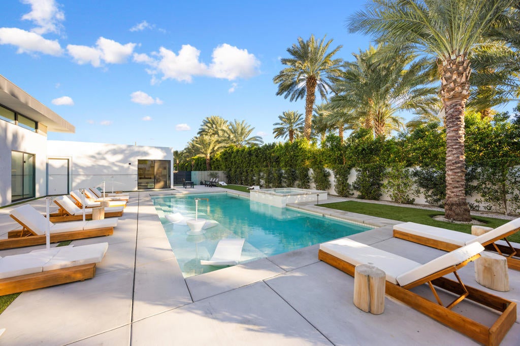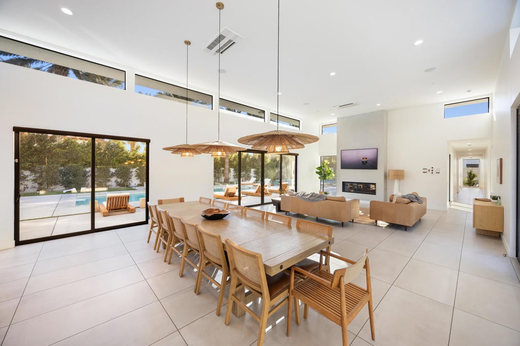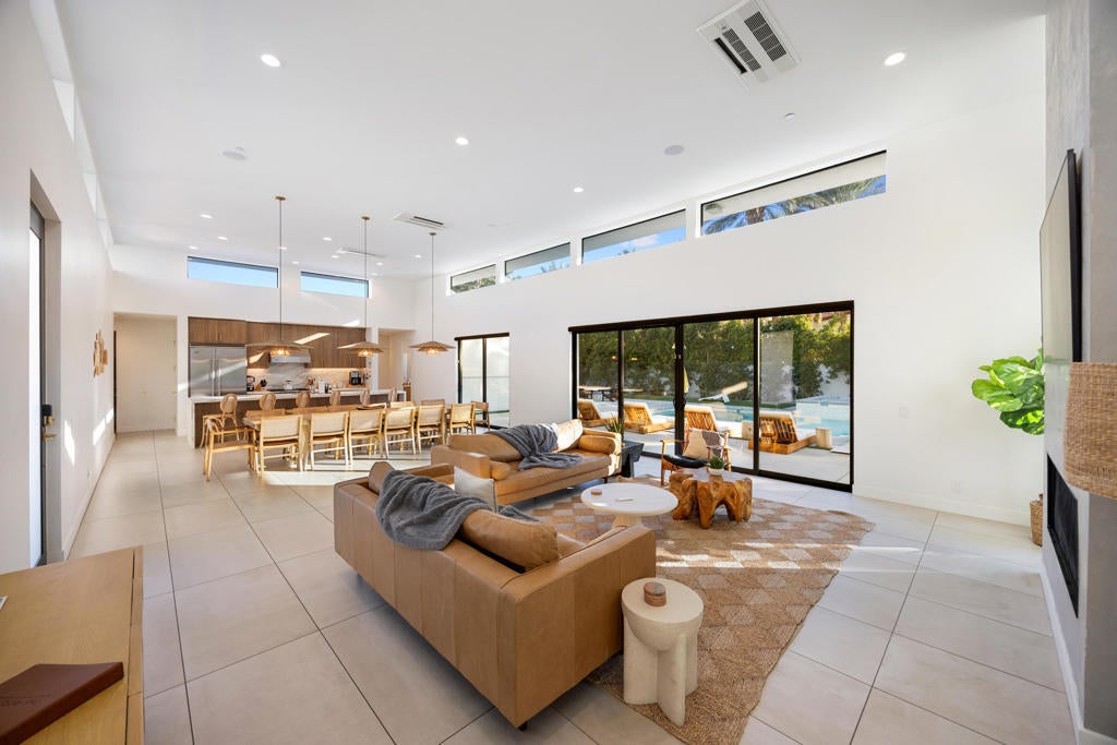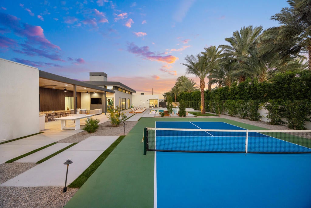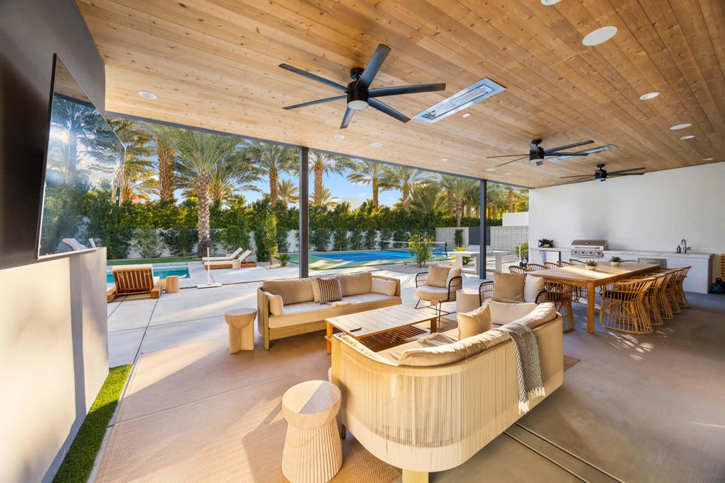 Located in the prestigious, gated Polo Villas community of La Quinta, just minutes from the world-famous Empire Polo Grounds home to the Coachella and Stagecoach music festivals this exceptional 4,188-square-foot estate represents the ultimate blend of luxury living and prime location. Whether for personal enjoyment or high-performing rental potential, proximity to these iconic events makes this property especially desirable. The residence offers 6 bedrooms, 6.5 bathrooms, and a dedicated media room, thoughtfully designed to capture modern sophistication. Soaring ceilings, an open-concept layout, and clerestory windows fill the great room with natural light, creating an inviting and expansive living environment ideal for entertaining large groups. Outdoor living is a true highlight, featuring a private, resort-style backyard complete with a sparkling pool and spa, full outdoor kitchen, pickleball court, and fire pit. Designed for year-round enjoyment, the covered patio includes ceiling fans, heaters, TV, and integrated Sonos speakers perfect for relaxing after a day at the festivals or hosting guests in style. Inside, the gourmet kitchen, luxurious media room, and generously sized bedroom suites with large-format tile ensuite bathrooms provide comfort and functionality for both owners and guests. Additional features include a solar energy system, EV charger, smart home technology, and dual washer and dryer sets enhancing convenience and efficiency. Approved for short-term vacation rentals in La Quinta, this home offers a rare opportunity to own a high-end desert retreat with exceptional income potential, particularly during peak festival season. Combining privacy, elegance, and unmatched proximity to Coachella's event grounds, this property stands as a premier desert investment and lifestyle destination.