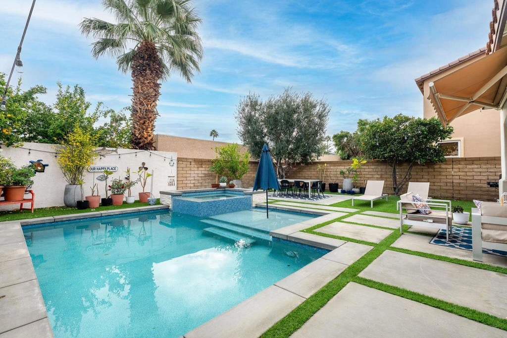 In the heart of Palm Desert, a prime location offering both convenience and lifestyle. This gated community features the CV Link pathway passing directly outside the gate, providing easy access for walking, biking, and connecting throughout the Coachella Valley. This beautifully updated 3 bedroom, 2.5 bath home offers over 2,000 square feet of thoughtfully designed living space. The remodeled kitchen showcases modern finishes and opens seamlessly to spacious living and dining areas, ideal for entertaining or everyday comfort. The backyard is a private desert oasis featuring a brand-new saltwater heated pool with new pool equipment, complemented by a tastefully designed outdoor space perfect for relaxing year-round. Additional highlights include owned solar, offering energy efficiency and long-term savings. Ideally located minutes from El Paseo shopping and dining, walking distance to the Bump and Grind hiking trail, and close to Whole Foods, Trader Joe's, Starbucks, golf courses, and top desert amenities. Available for booking during the BNP Paribas Open, Coachella Festival, and Stagecoach for the months of MARCH AND APRIL.